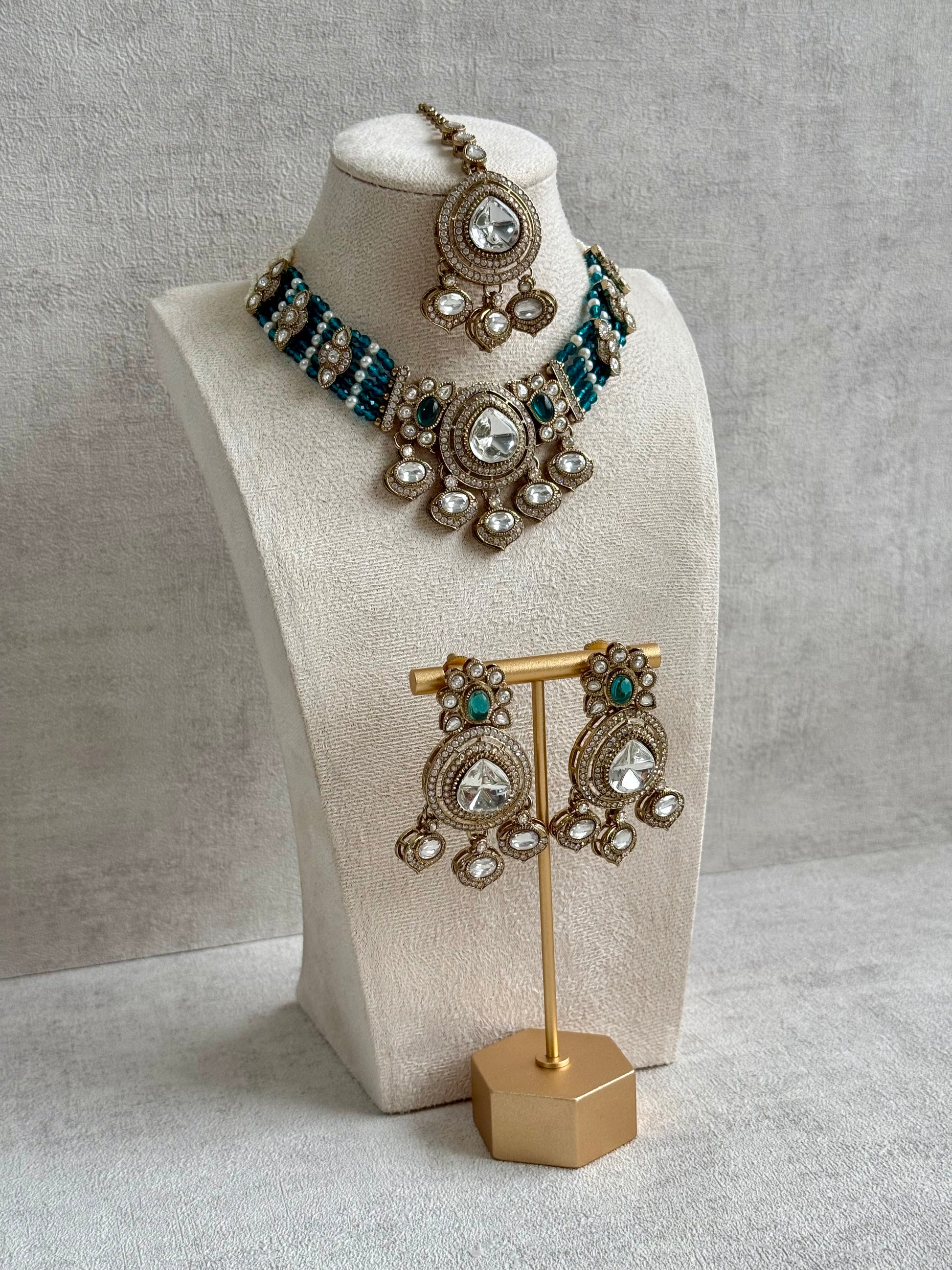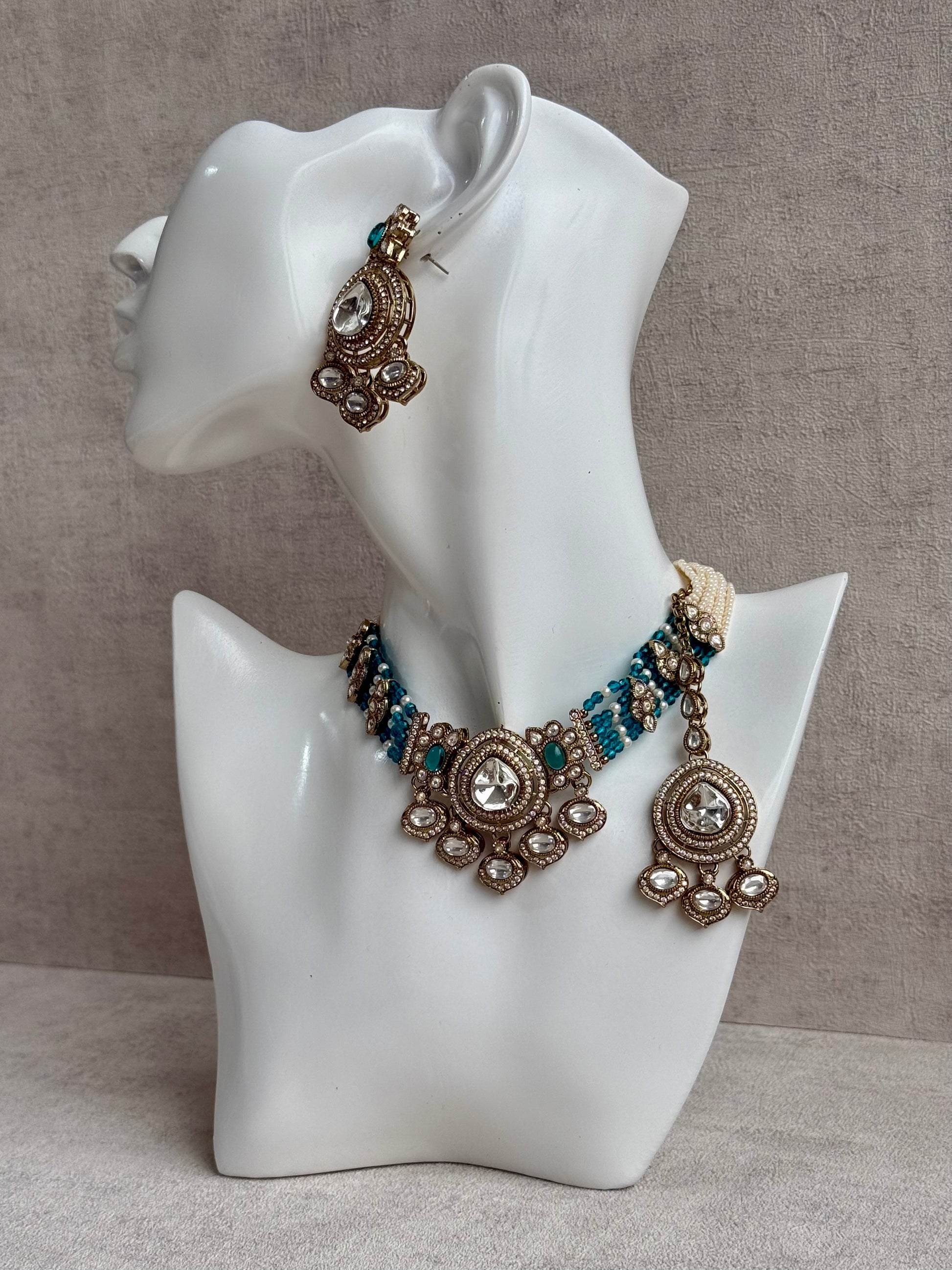 The necklace features a bold teardrop centrepiece bordered with shimmering crystals, while faceted teal beads and pearls intertwine in layered strands along the neckline. Each section is crafted with intricate attention to symmetry and texture, creating a graceful flow that enhances both modern and traditional looks.