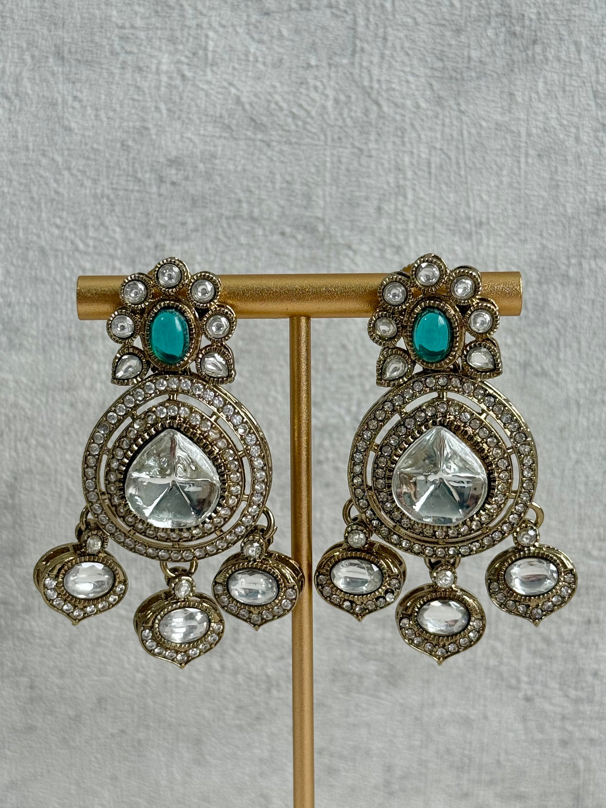 The matching earrings echo the same teardrop motif, framed in antique gold with mirror-cut drops that catch the light effortlessly. Completing the ensemble is a coordinating tikka — delicate yet impactful, perfect for elevating festive and formal outfits.