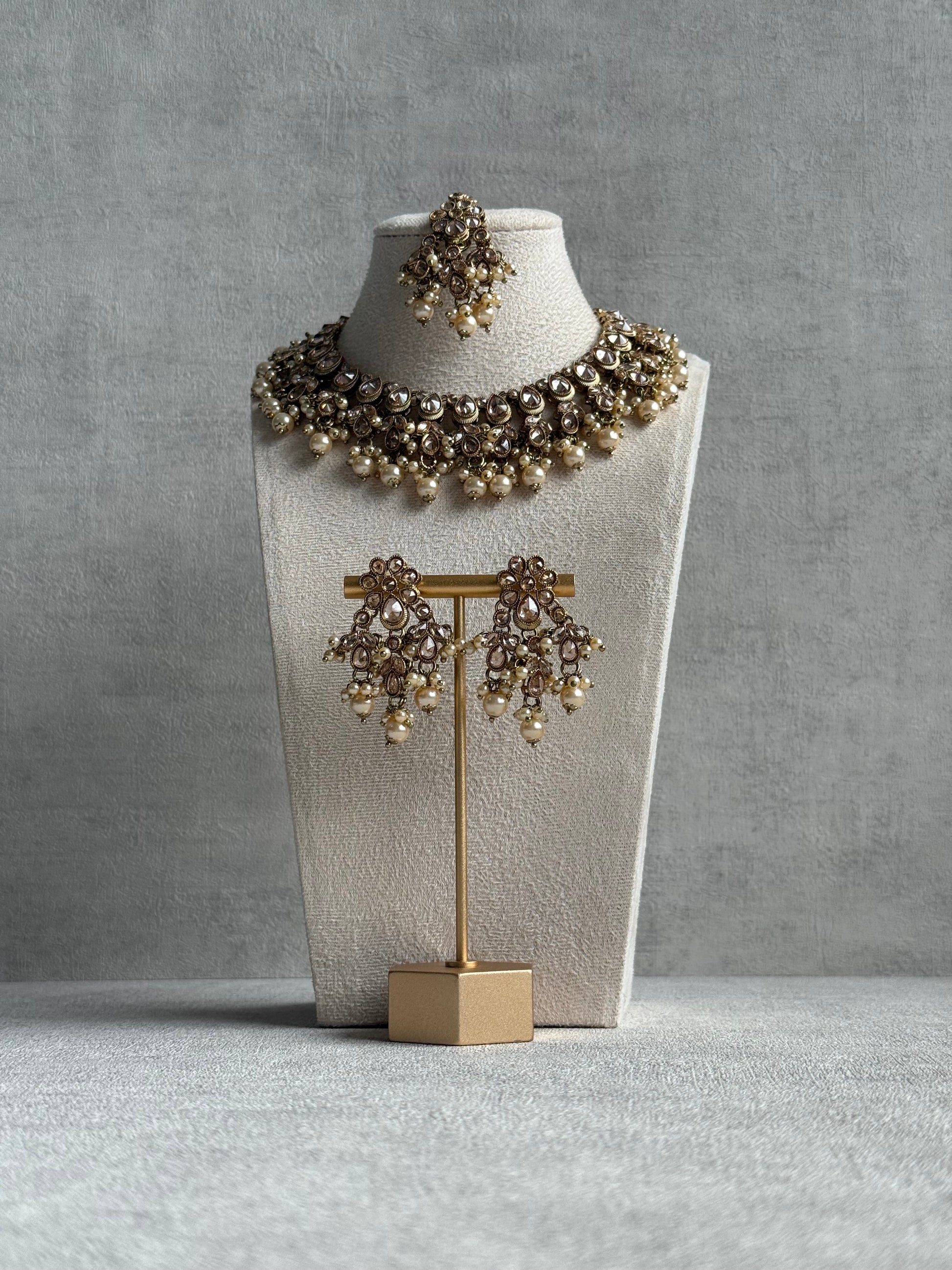 The necklace sits gracefully along the collarbone, adorned with teardrop champagne stones framed in intricate antique gold settings. Each motif is bordered by tiny beads and finished with clusters of ivory pearls that add a gentle sway and luminous contrast. The design exudes versatility — elegant enough for a bride, yet classic enough for festive occasions and evening wear.
