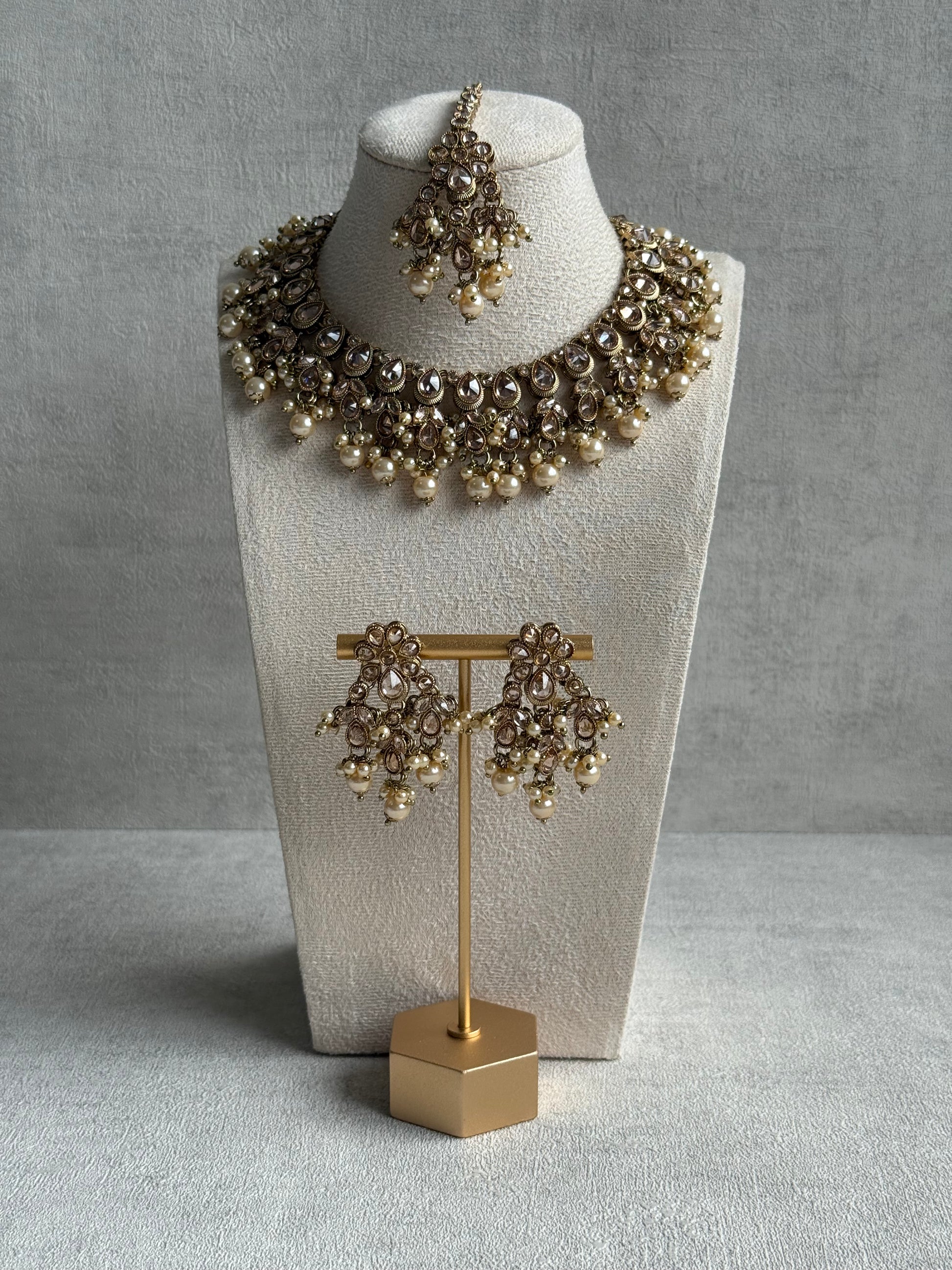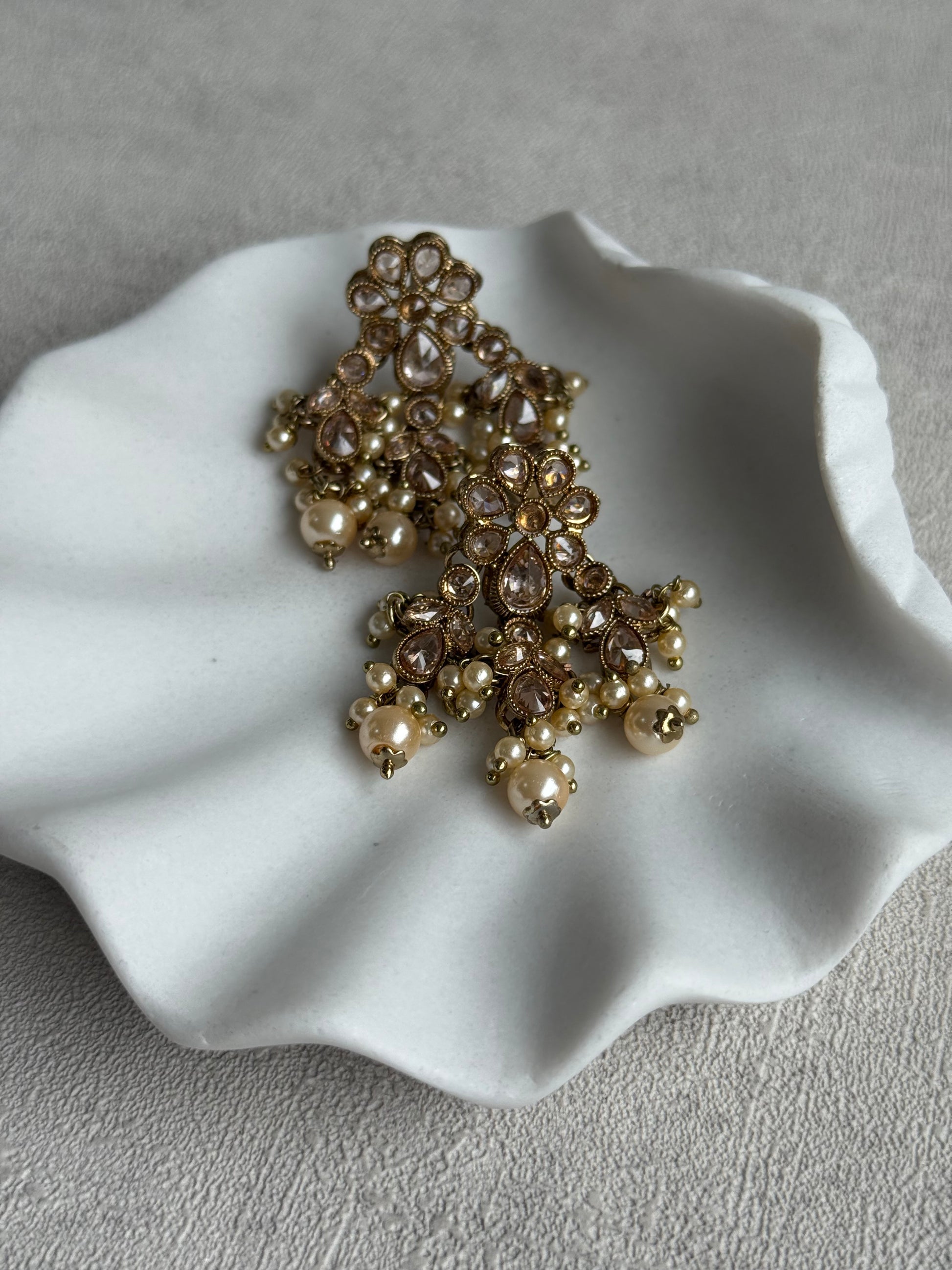 The matching earrings echo the same ornate craftsmanship, featuring delicate floral patterns of champagne stones and pearl tassels. Designed for comfort without compromising statement appeal, they beautifully complement the necklace’s glow. The tikka completes the set with symmetry and poise, making it a truly cohesive ensemble that enhances any traditional or modern outfit.