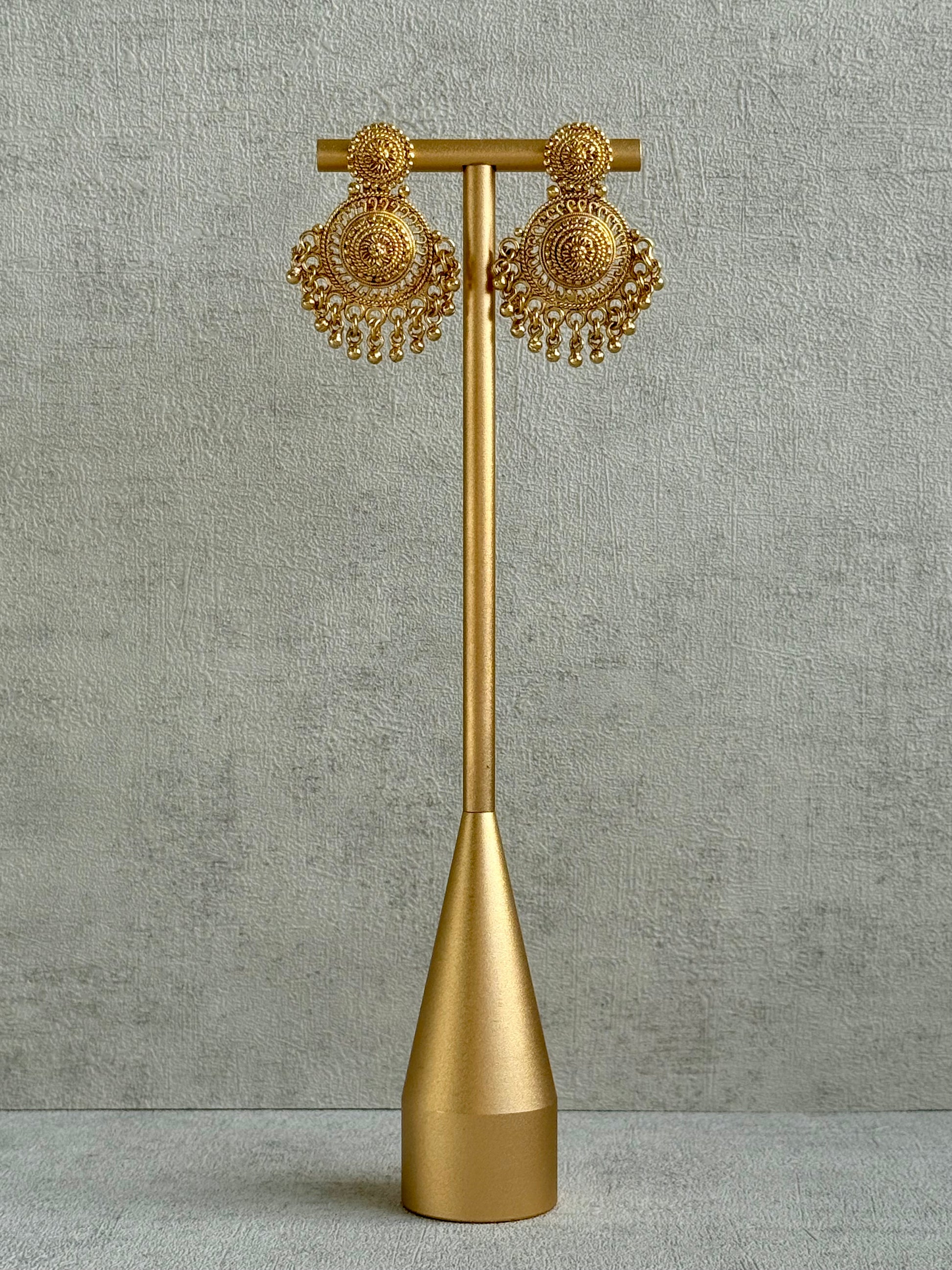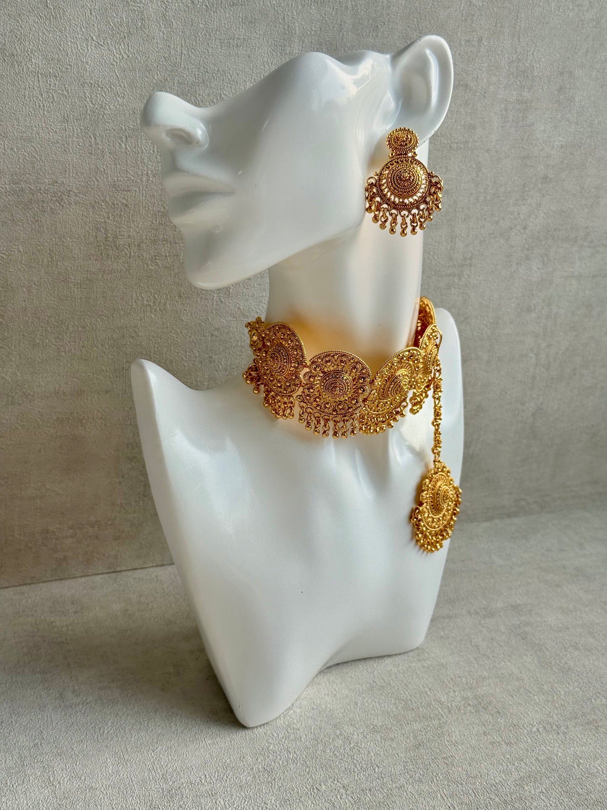 Ayura Designs Rami Choker Set with Earrings & Tikka – Antique Gold Medallions with Ghungroo Drops is a striking celebration of traditional craftsmanship, designed around beautifully sculpted circular medallions layered with intricate filigree and raised gold bead detailing. Each medallion is finished with delicate ghungroo style drops that create soft movement and a rich, ceremonial feel around the neckline.