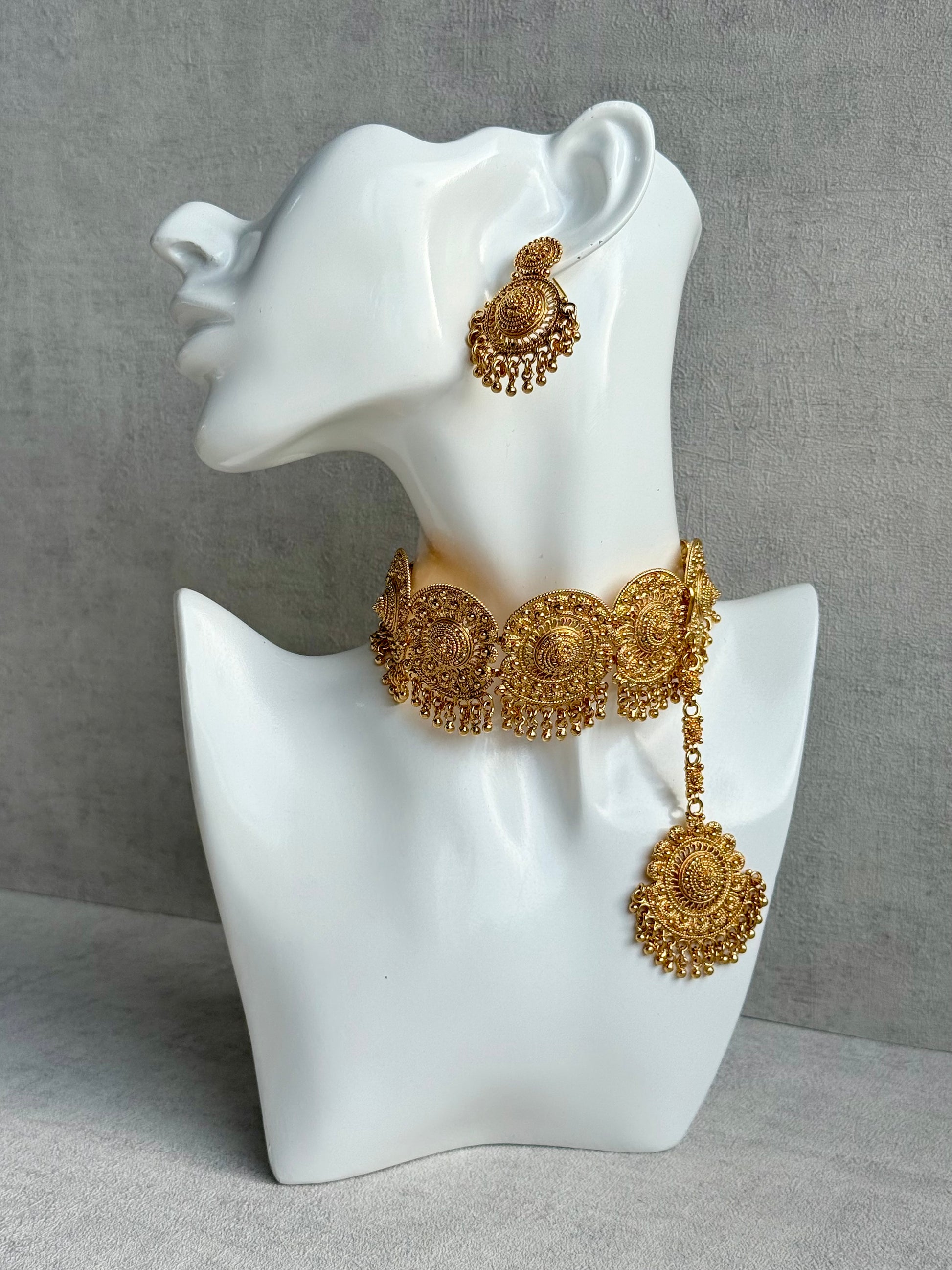 The choker sits high on the neck in a true collar style, forming a bold statement that frames the face and décolletage beautifully. Its antique gold finish gives the piece a timeless, heirloom inspired look, making it ideal for bridal wear, wedding functions and grand festive occasions.