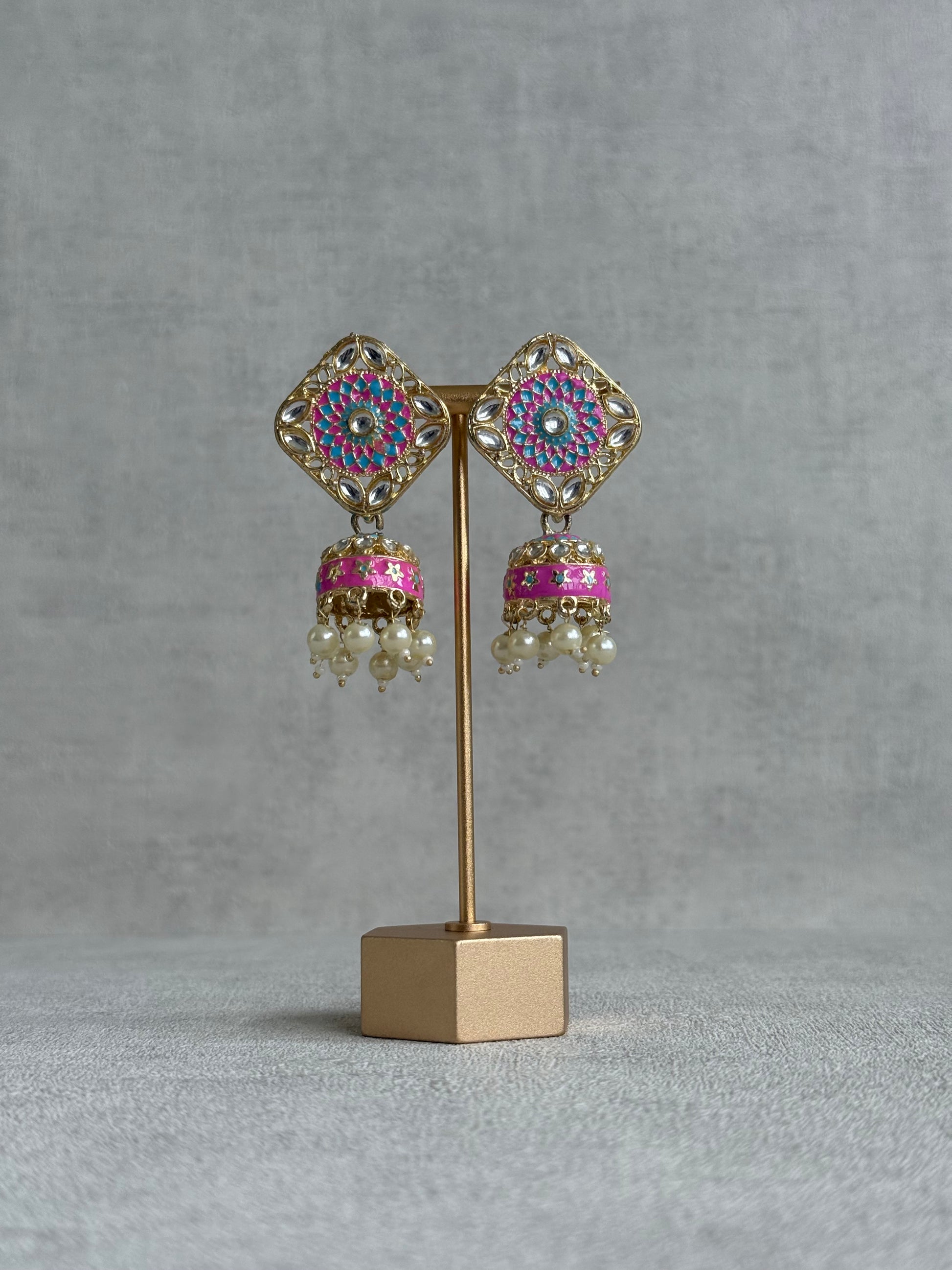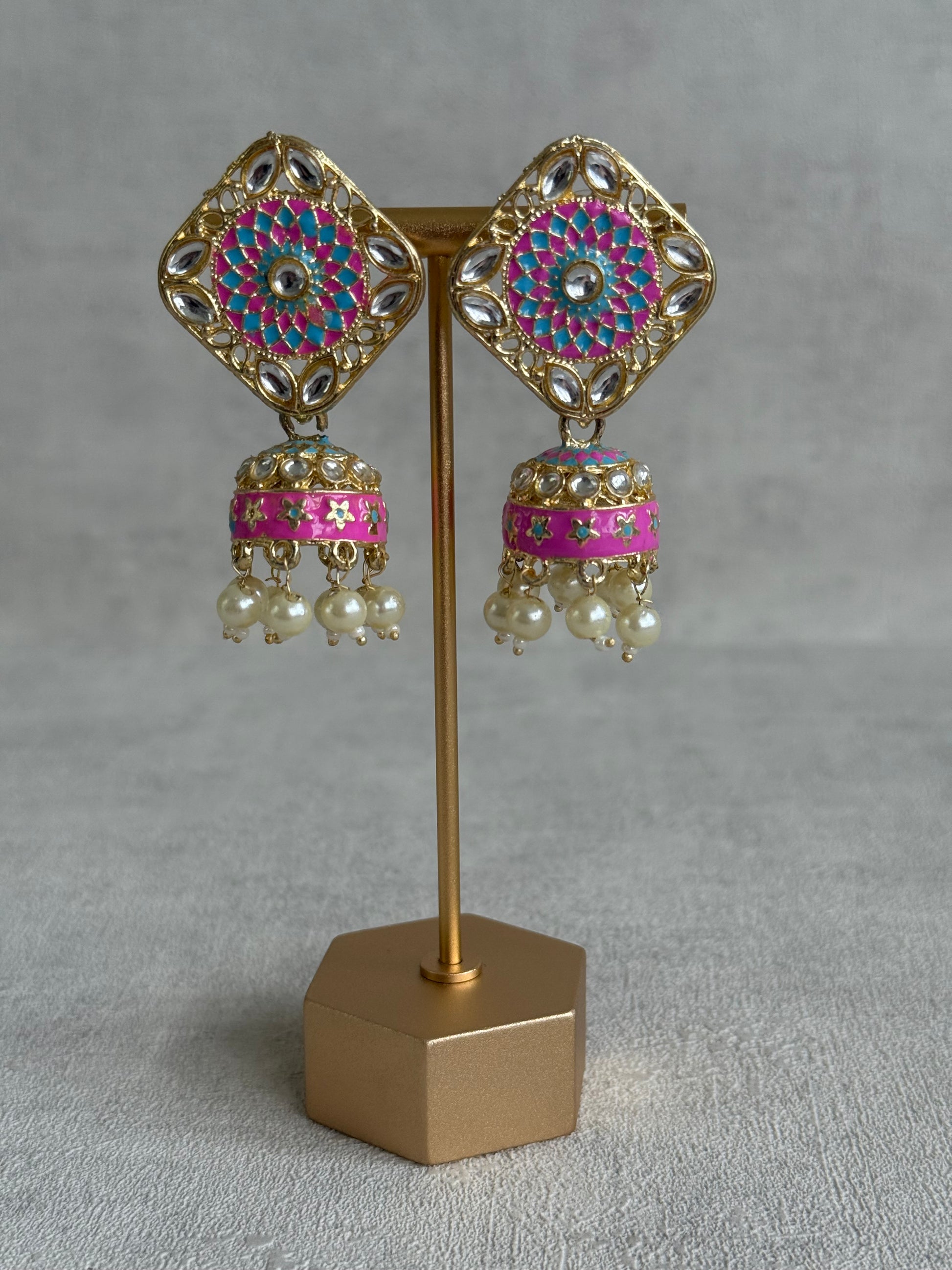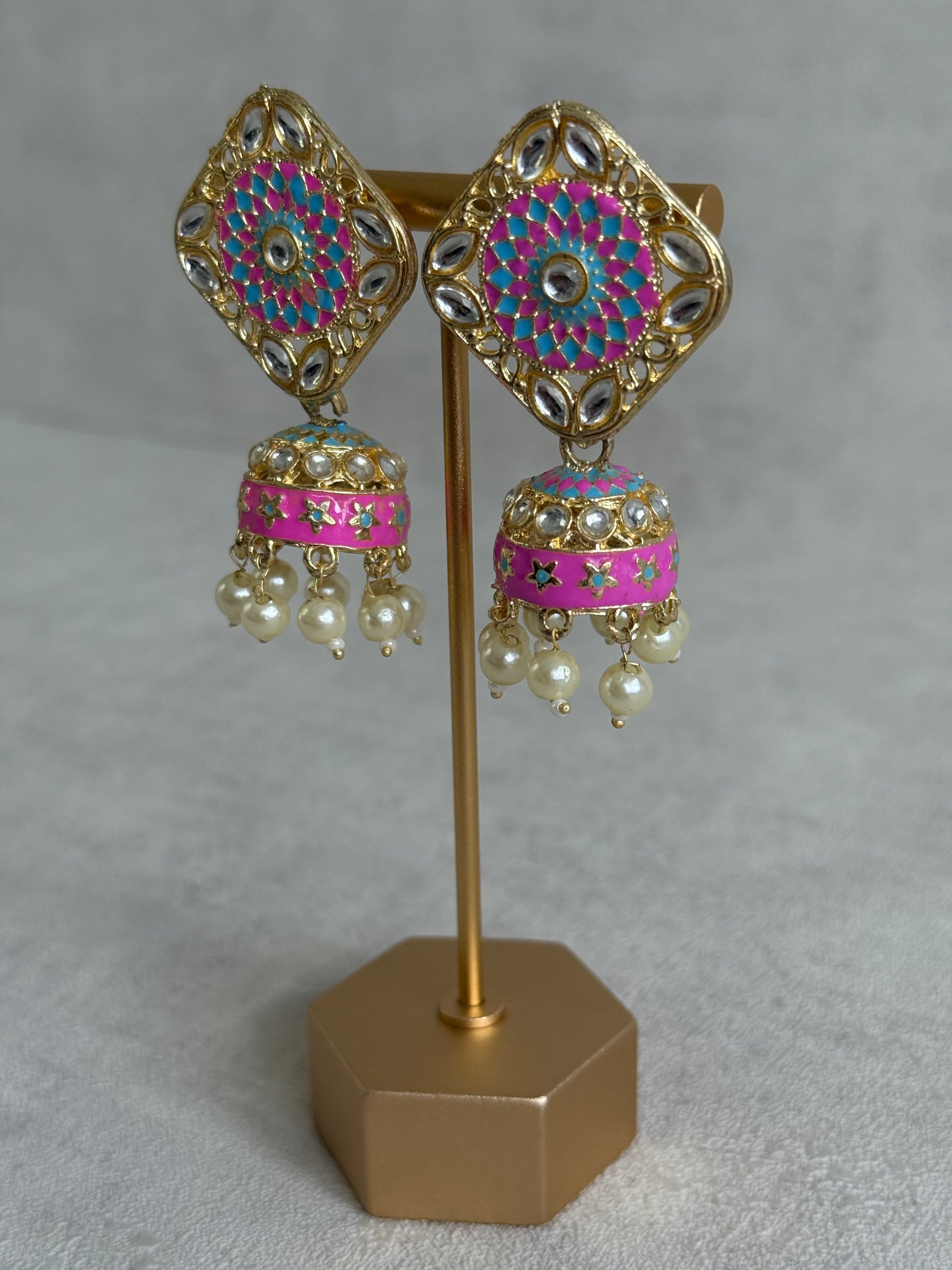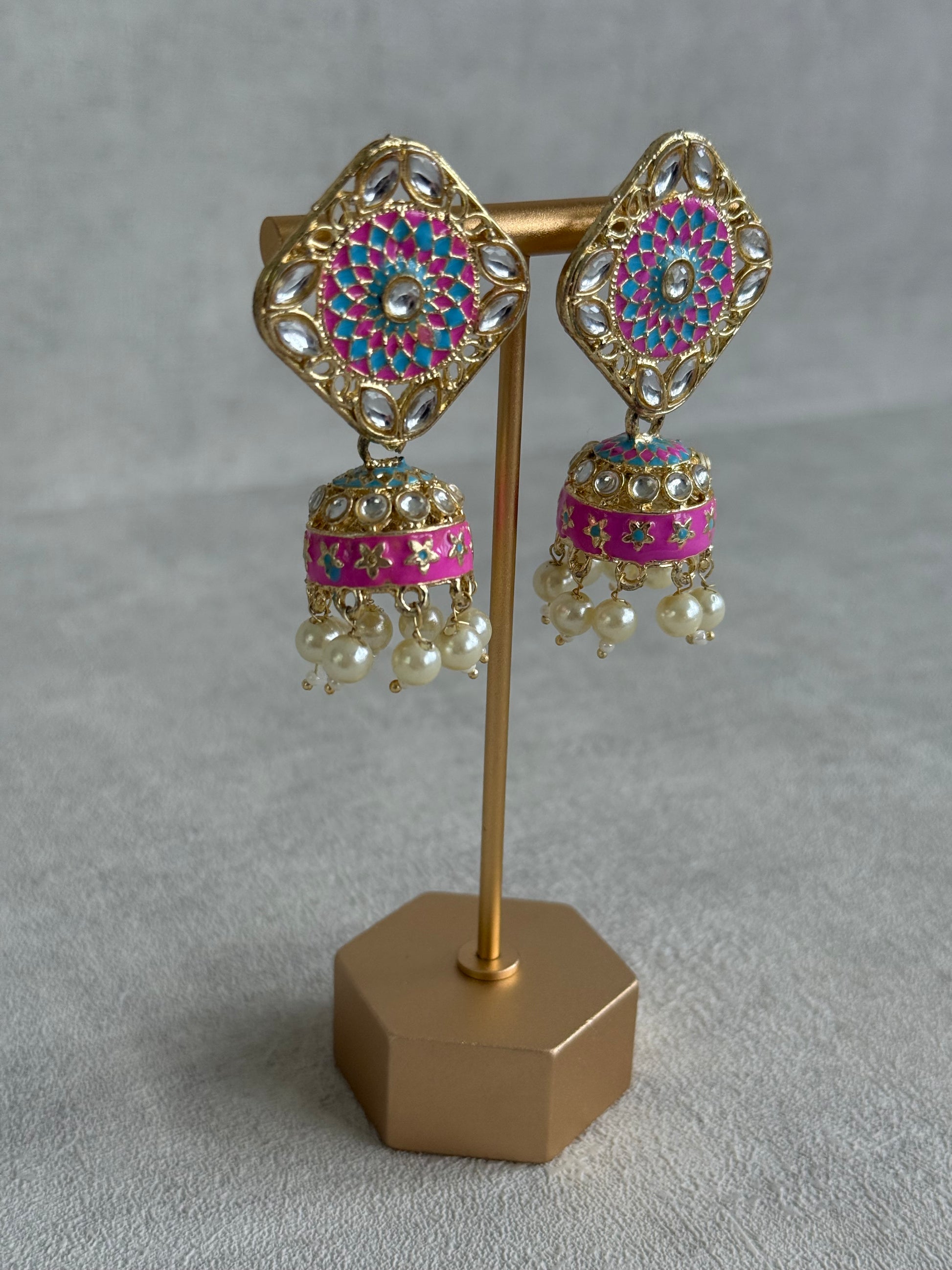 Inspired by traditional rangoli motifs, these Rangoli Jhumkis feature intricate meenakari detailing in refreshing aqua blue and vibrant hot pink, arranged in a striking geometric floral design.