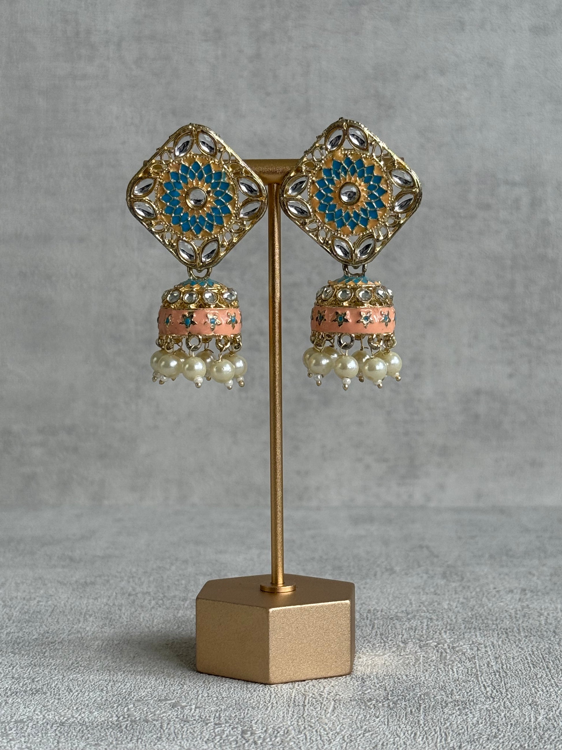 These Rangoli Jhumkis feature a striking blend of aqua blue and soft peach meenakari, arranged in a geometric floral pattern inspired by traditional rangoli art.