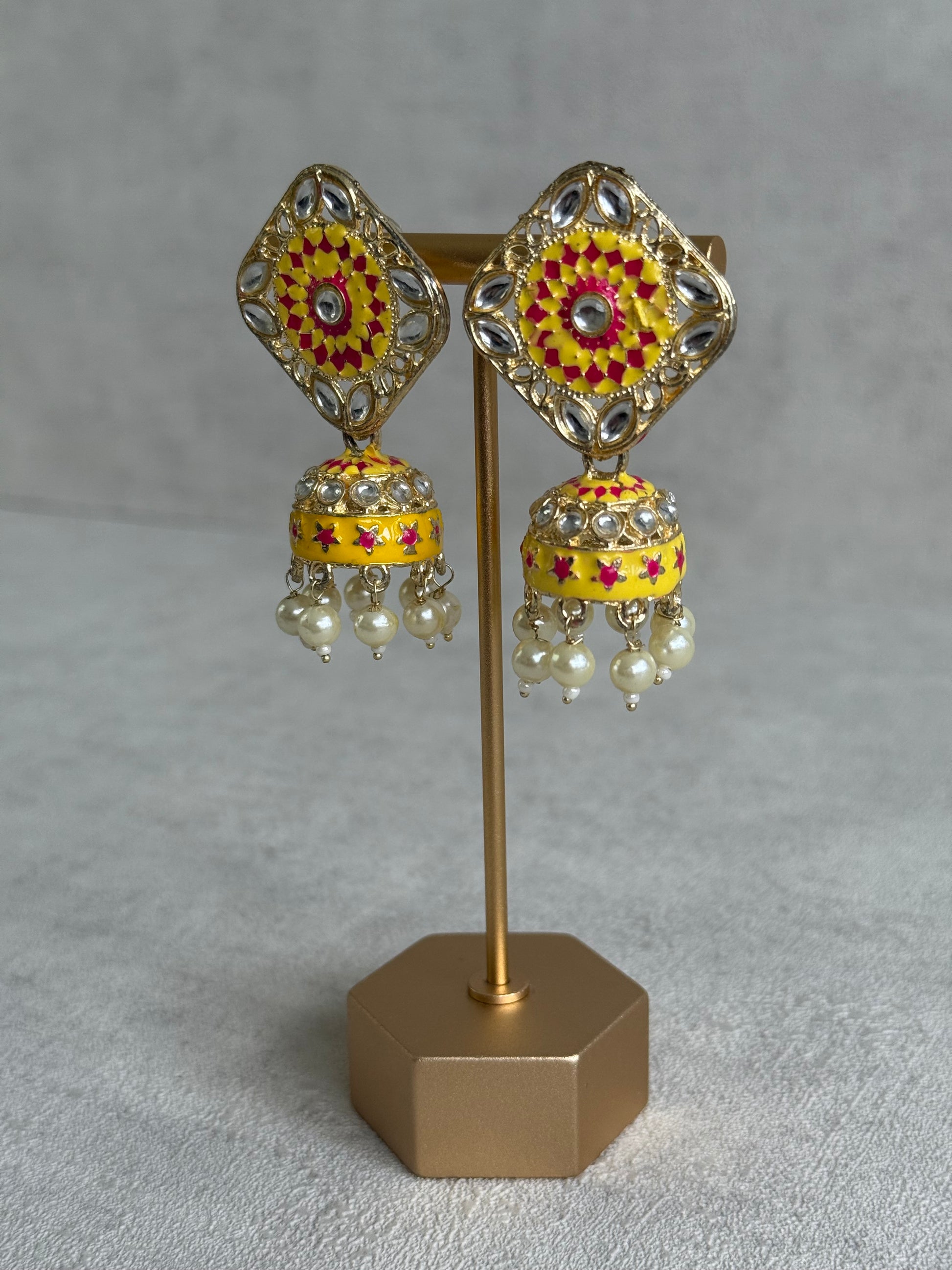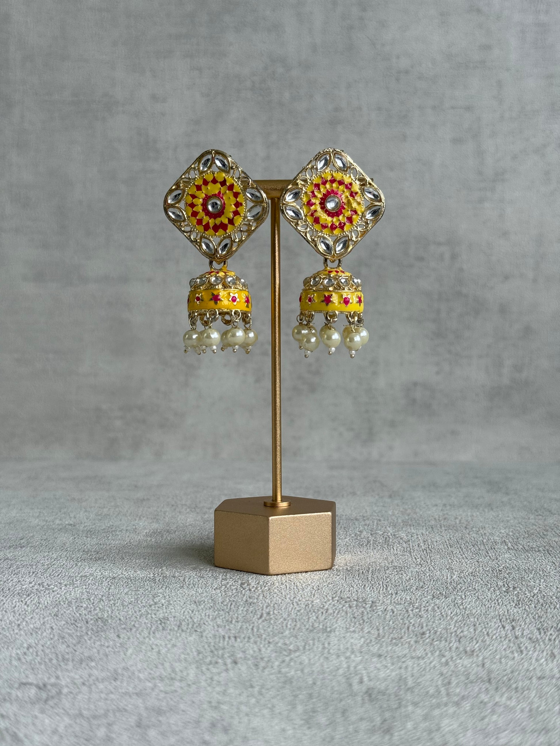 Inspired by traditional rangoli motifs, these Rangoli Jhumkis feature intricate meenakari detailing in vibrant marigold yellow and bold hot pink, arranged in a festive geometric floral design.