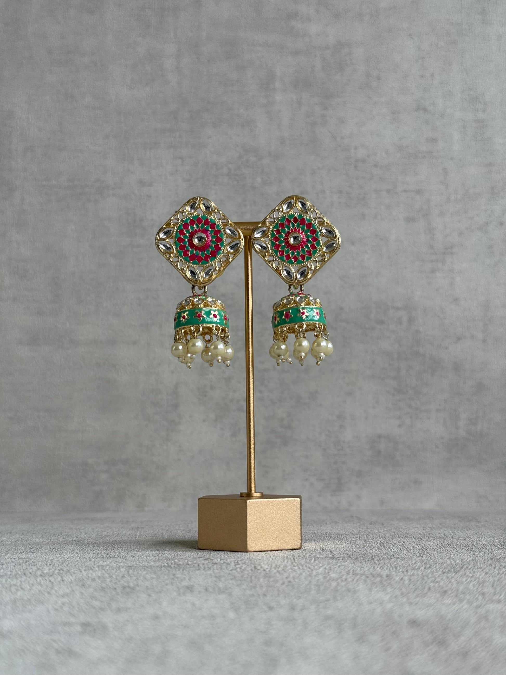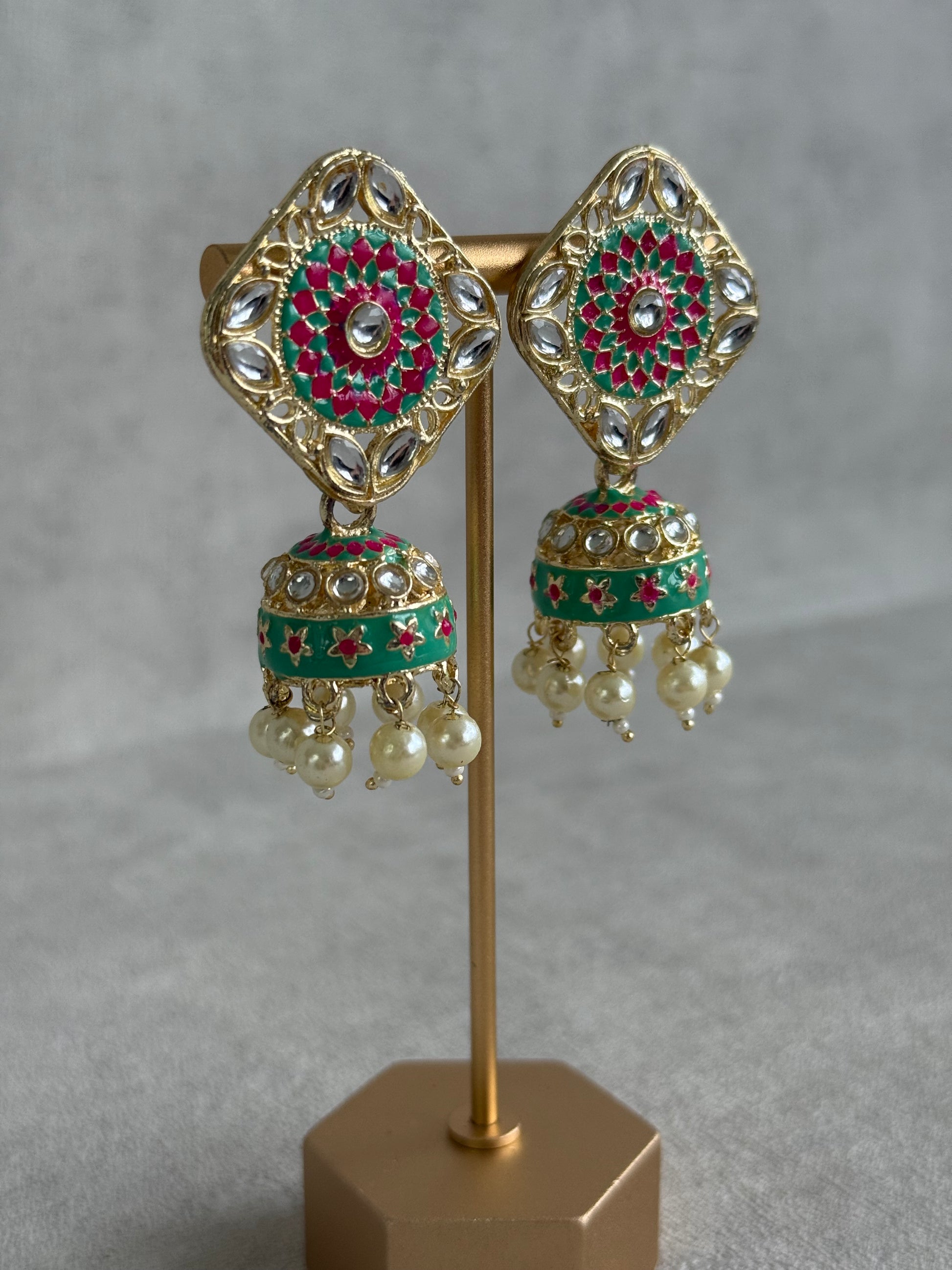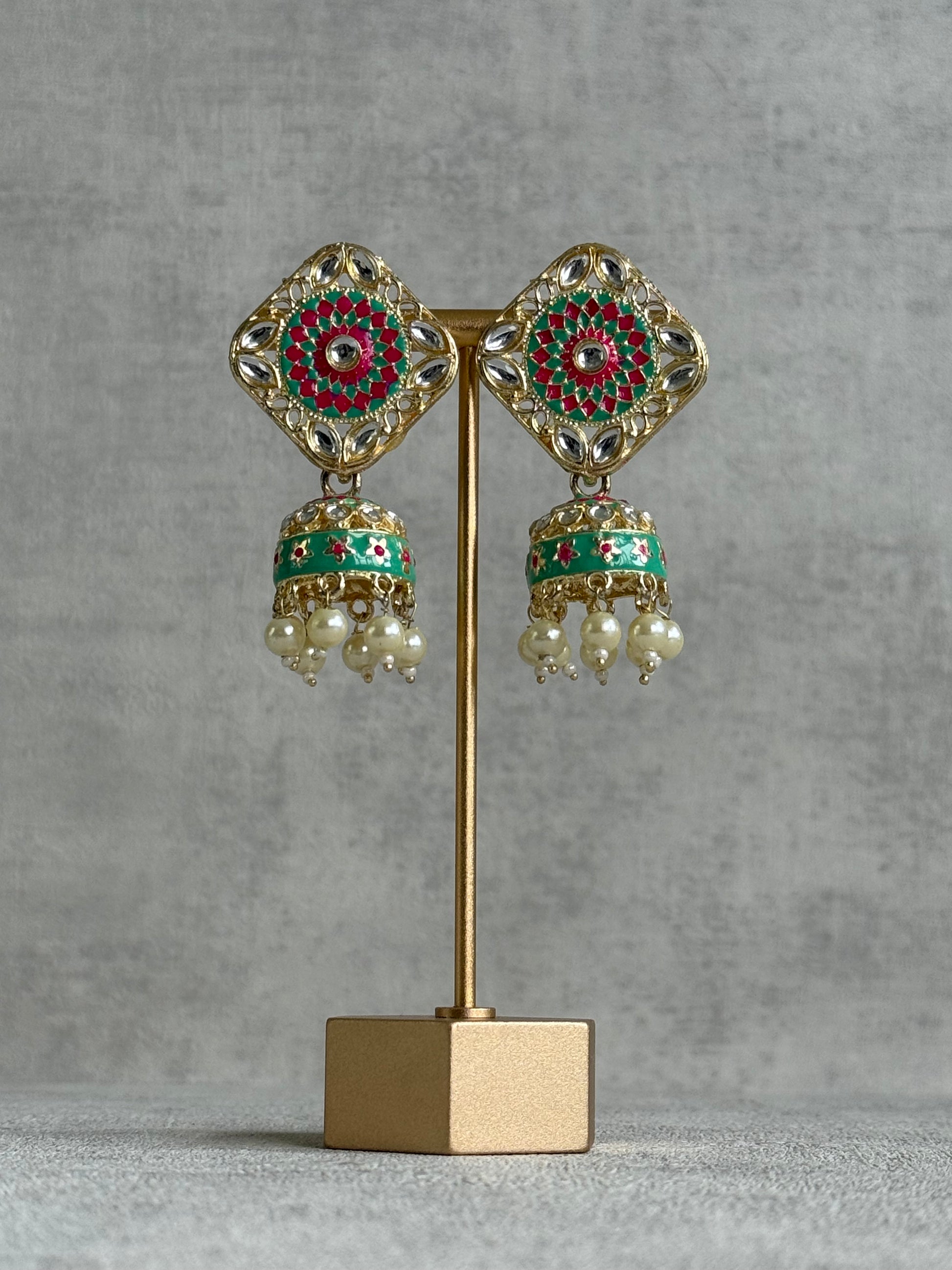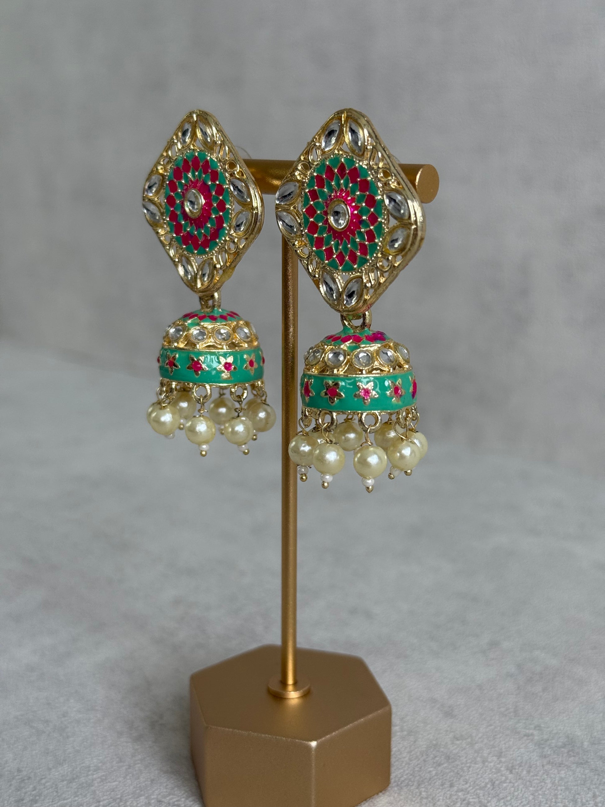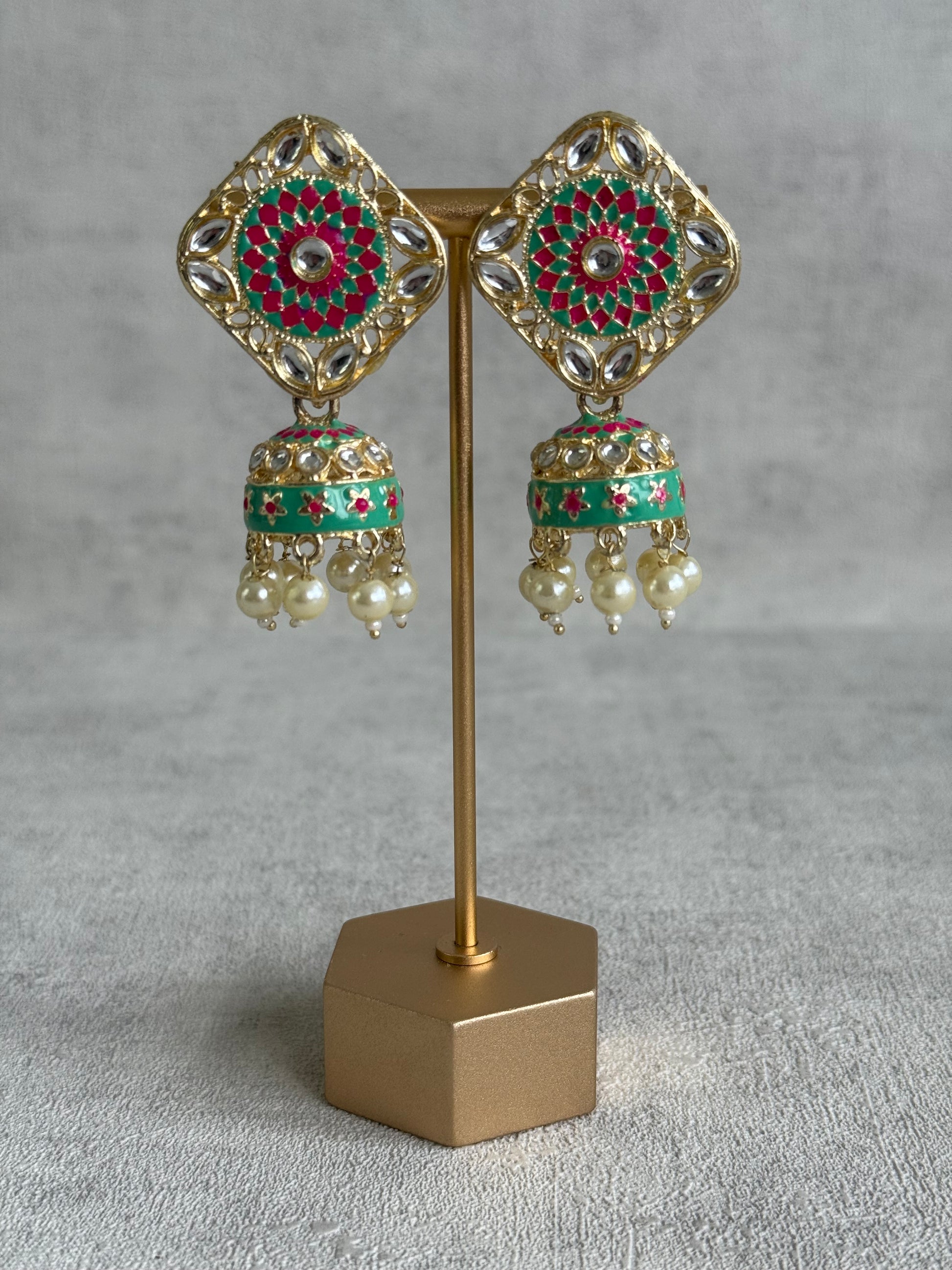 Inspired by traditional rangoli motifs, these Rangoli Jhumkis feature intricate meenakari detailing in fresh mint green and vibrant hot pink, arranged in a bold geometric floral pattern.