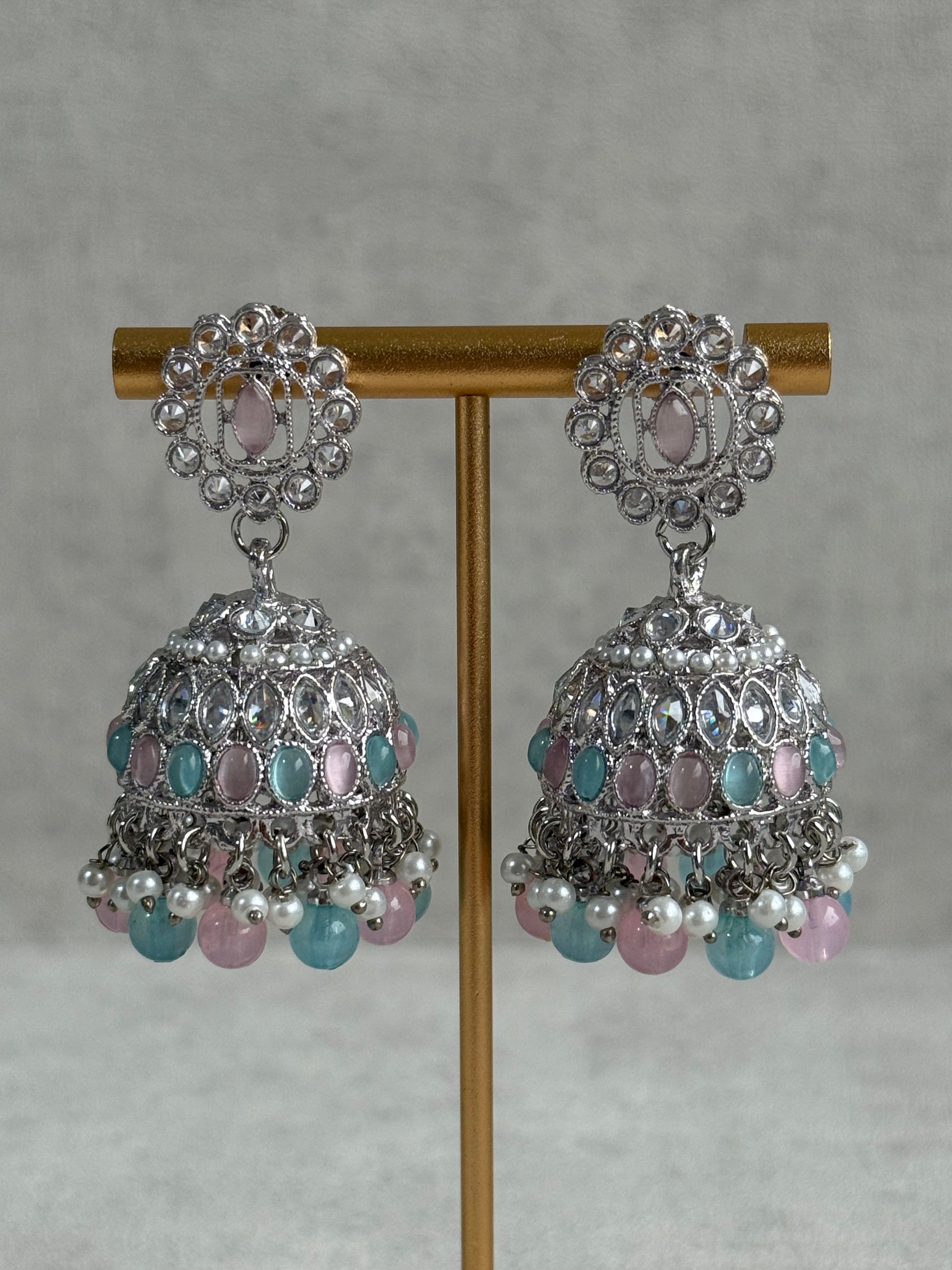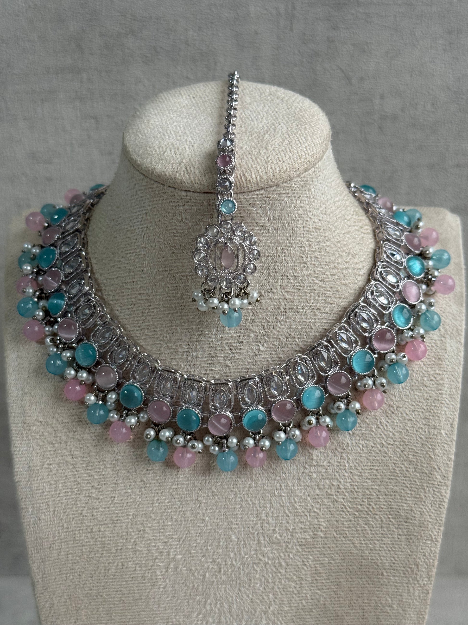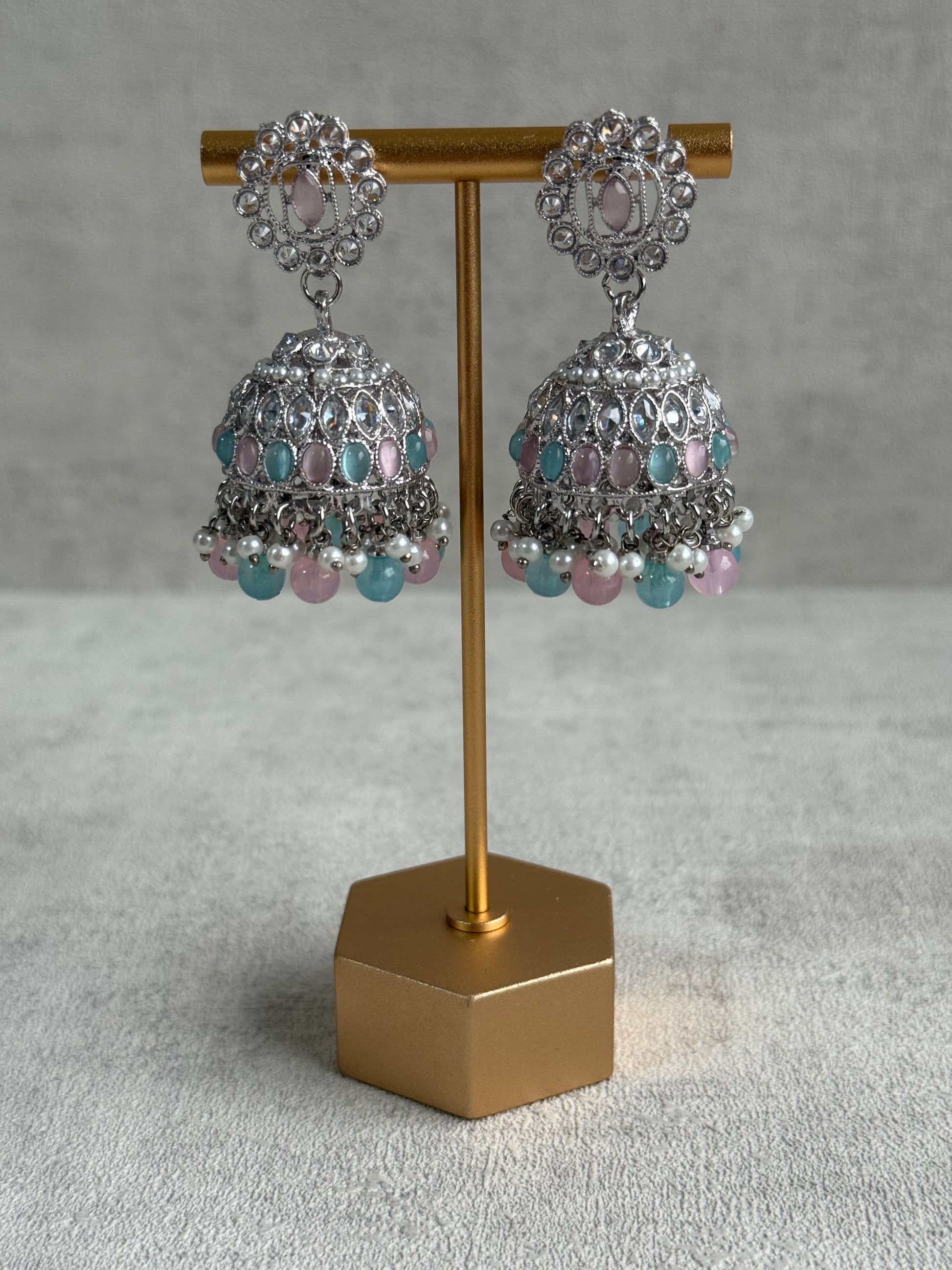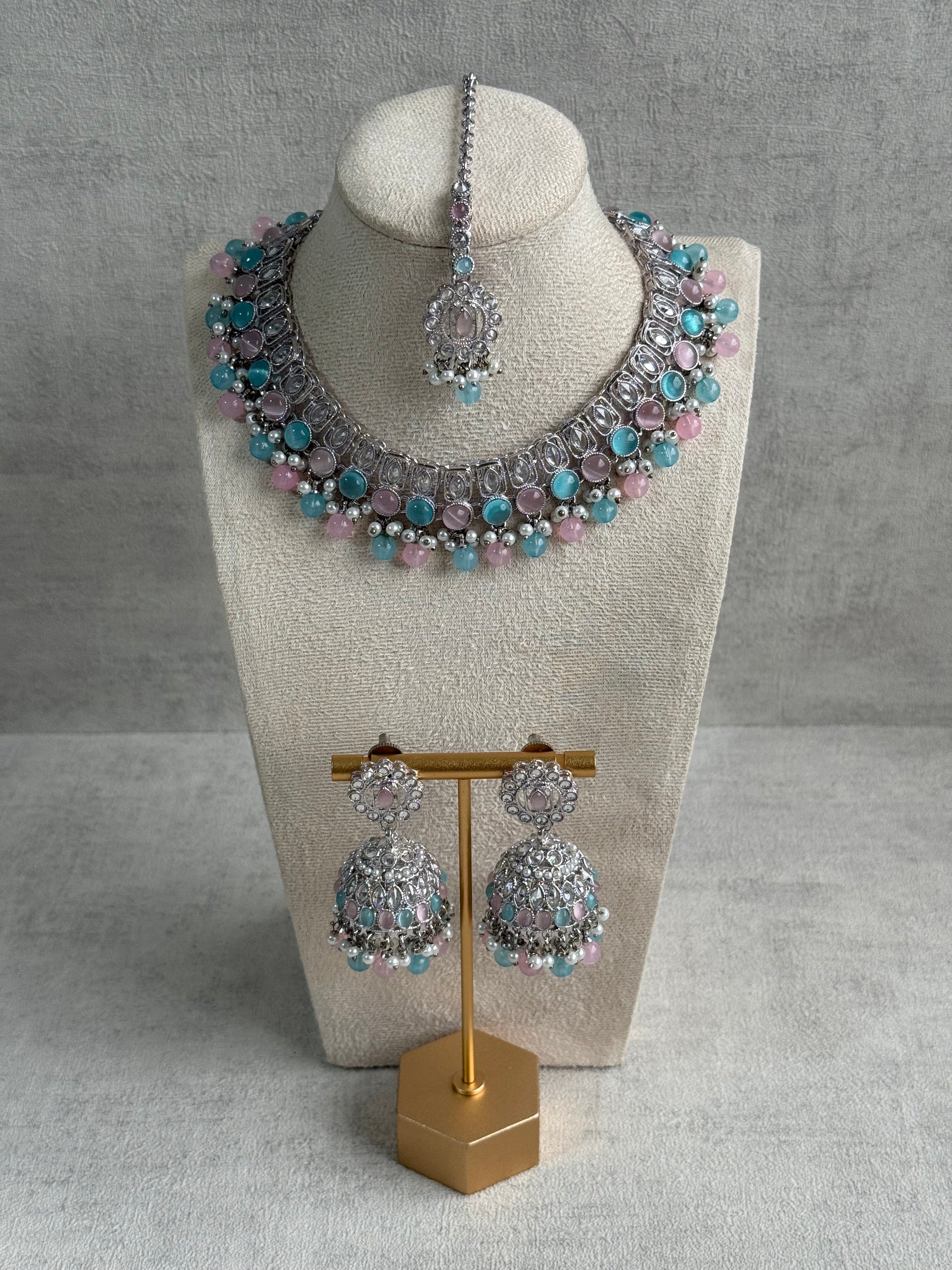 The Ayura Designs Rayal Set is a pastel dream brought to life in silver tones and soft hues. Designed with intricate craftsmanship, this statement set includes a necklace, jhumkis, and tikka adorned with alternating aqua blue and blush pink stones, framed by glimmering mirror-cut accents and finished with delicate pearl drops. The cool palette and refined detailing create a look that’s both contemporary and timeless.