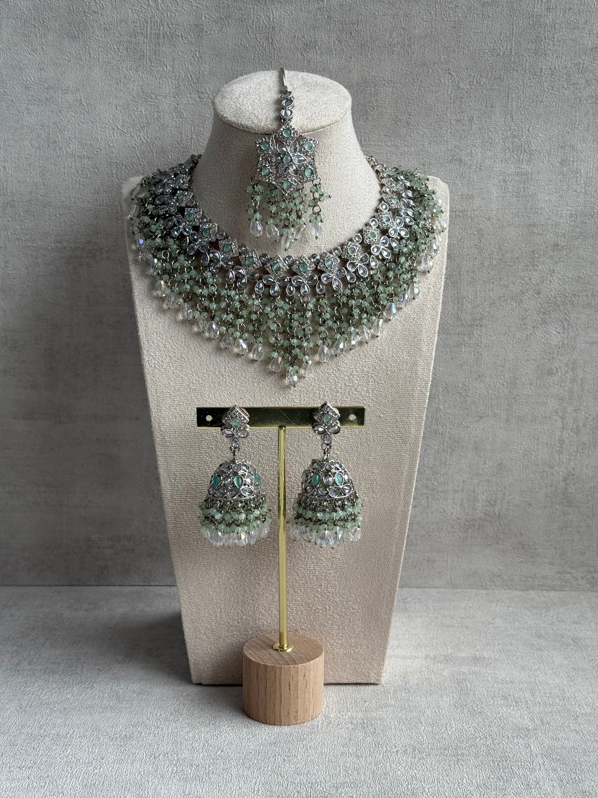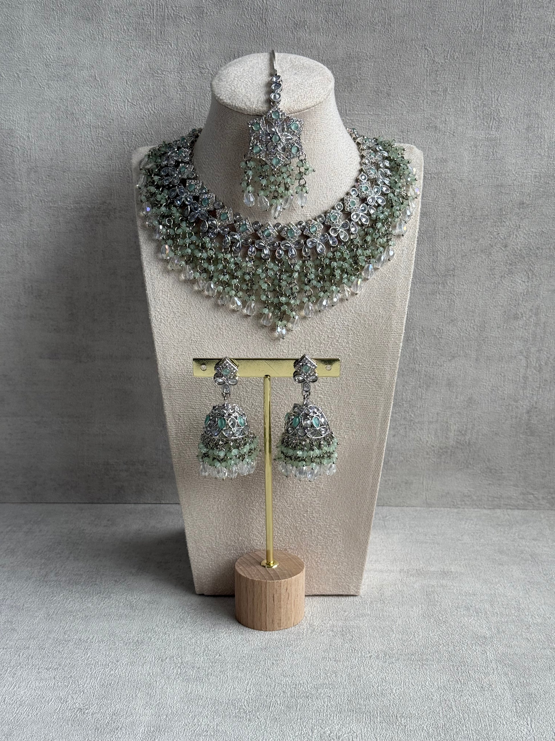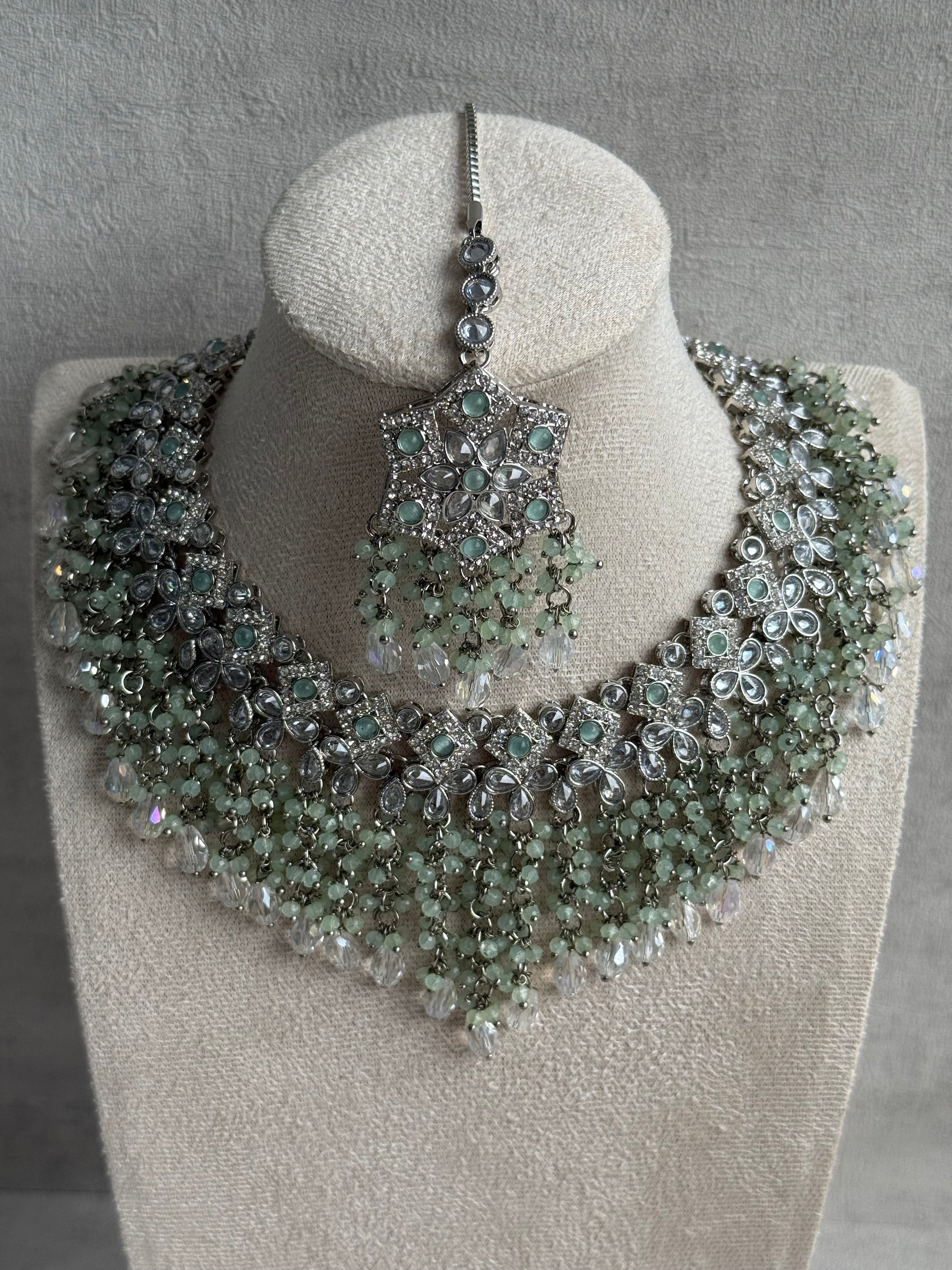 The necklace is crafted with rows of silver floral motifs, each centred with mirror-cut stones and framed with delicate mint green bead clusters. Finished with sparkling crystal drops, it drapes beautifully across the neckline for a layered, regal effect.