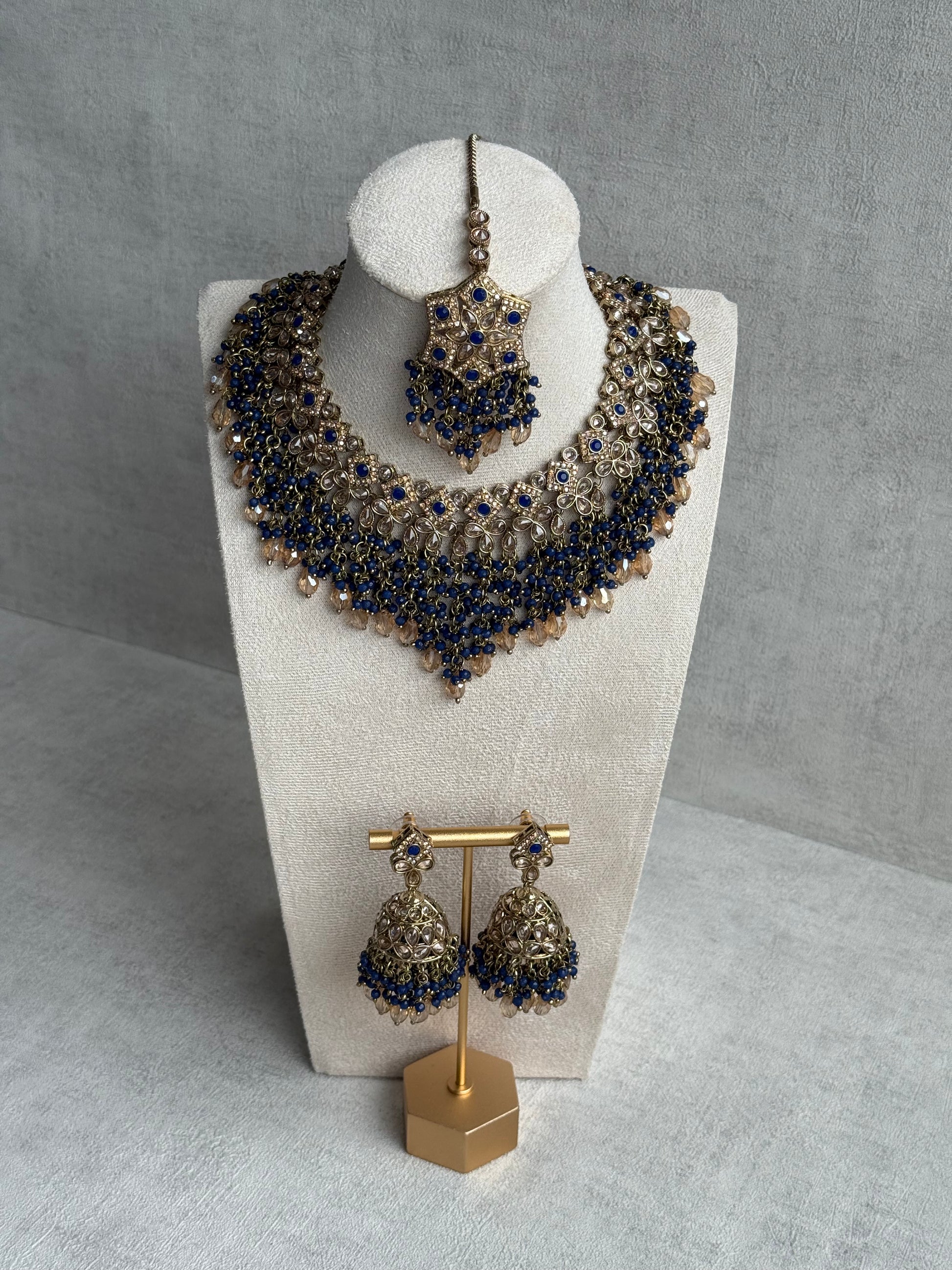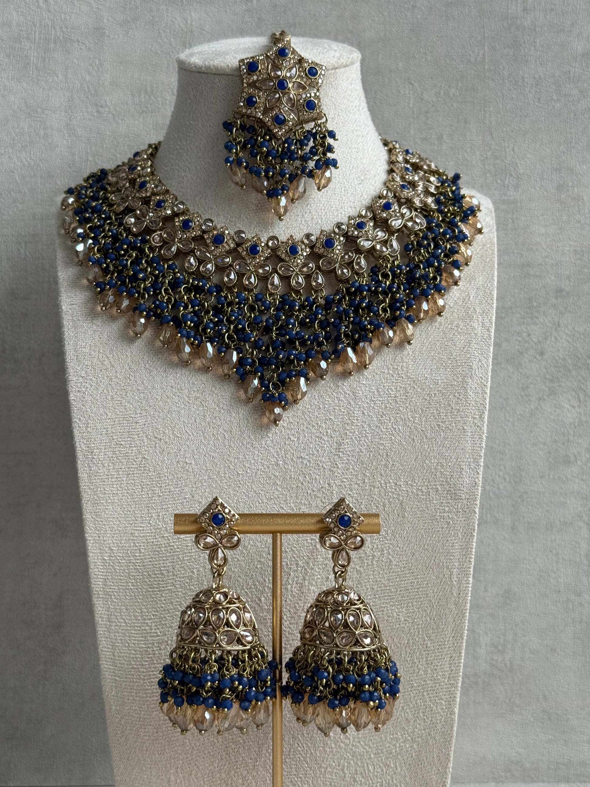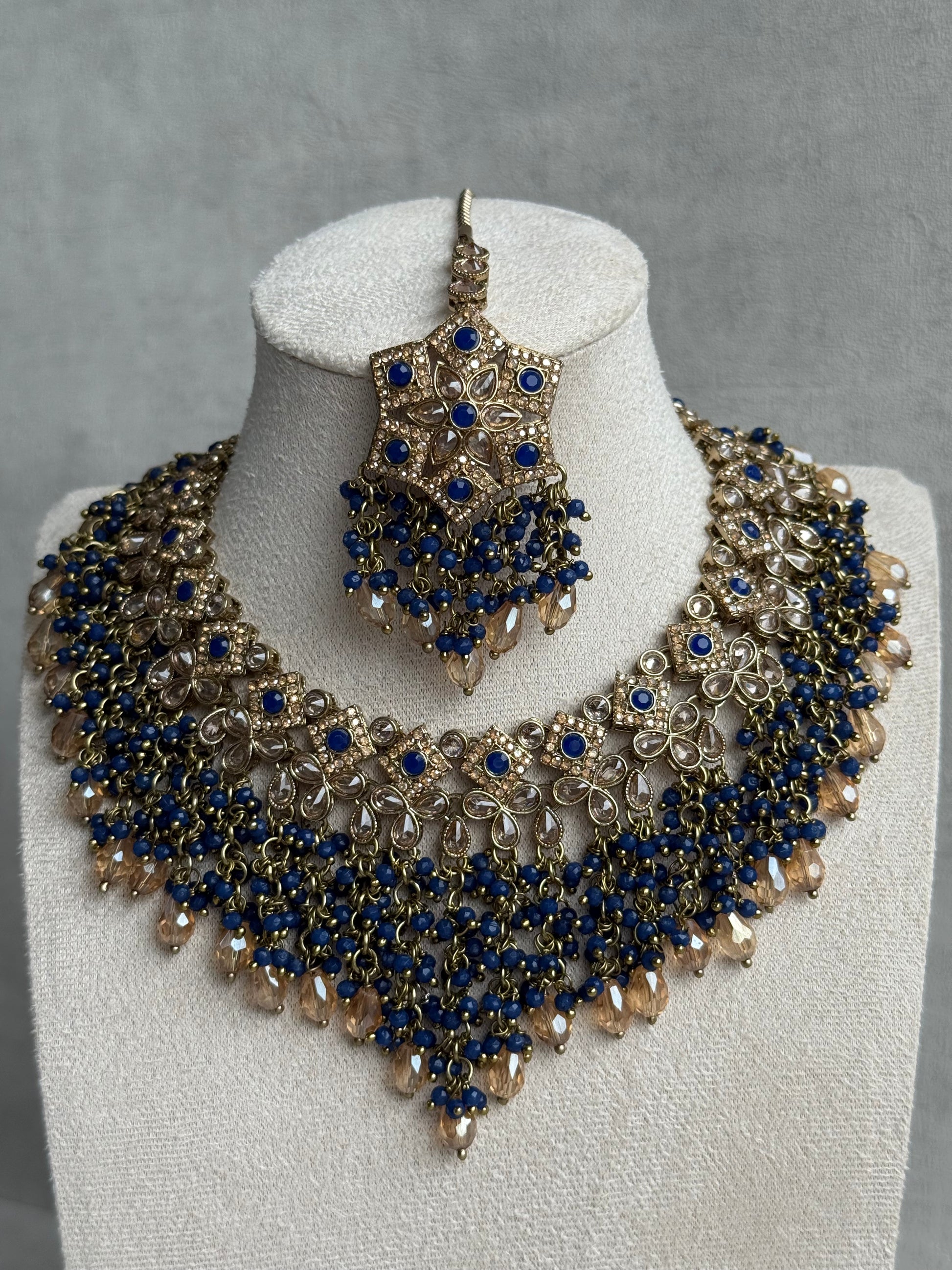 Drape yourself in elegance with the Ayura Designs Rayna Set with Necklace & Tikka, a statement of heritage and modern grace. This captivating design features mirror-cut stones framed in a warm antique gold base, adorned with clusters of rich ink blue beads and faceted champagne crystals. The layered floral motifs flow seamlessly across the neckline, creating a regal collar-like silhouette that demands attention.
