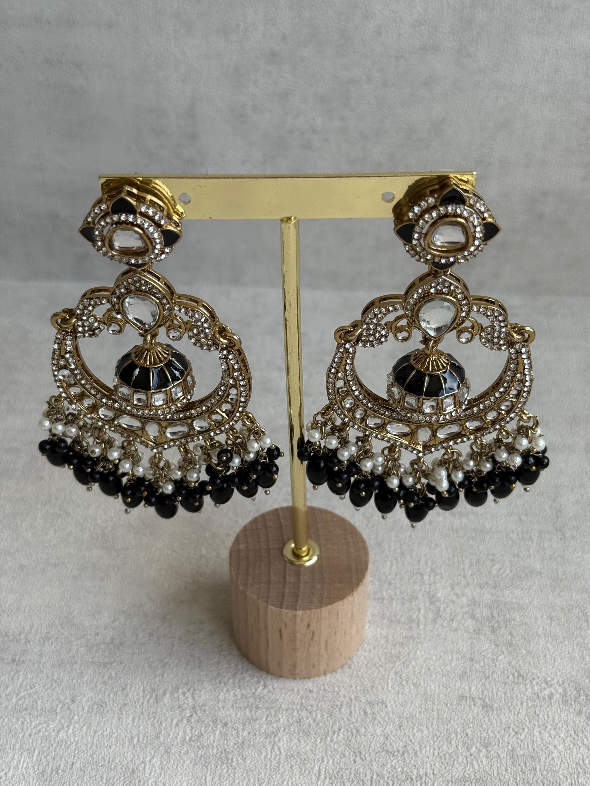 Elegant, bold, and endlessly versatile — the Ayura Designs Reha Earrings – Statement Chandbalis with Black Beads, Pearls & Mirror-Cut Stones bring a touch of regal sophistication to every look. The striking contrast of deep black enamel and reflective mirror-cut stones creates a captivating interplay of light and shadow, making these earrings a true statement piece.