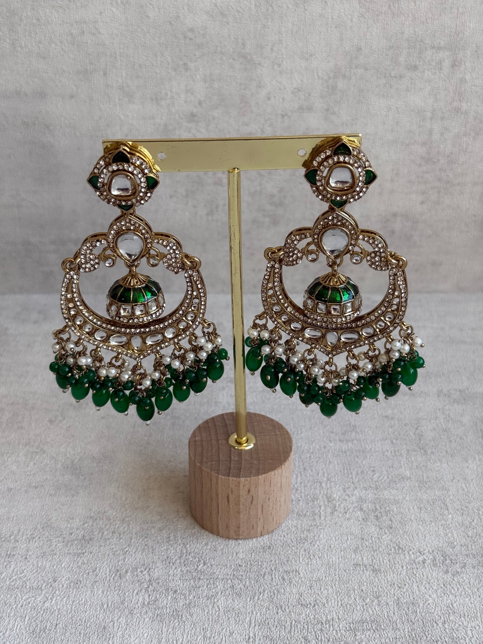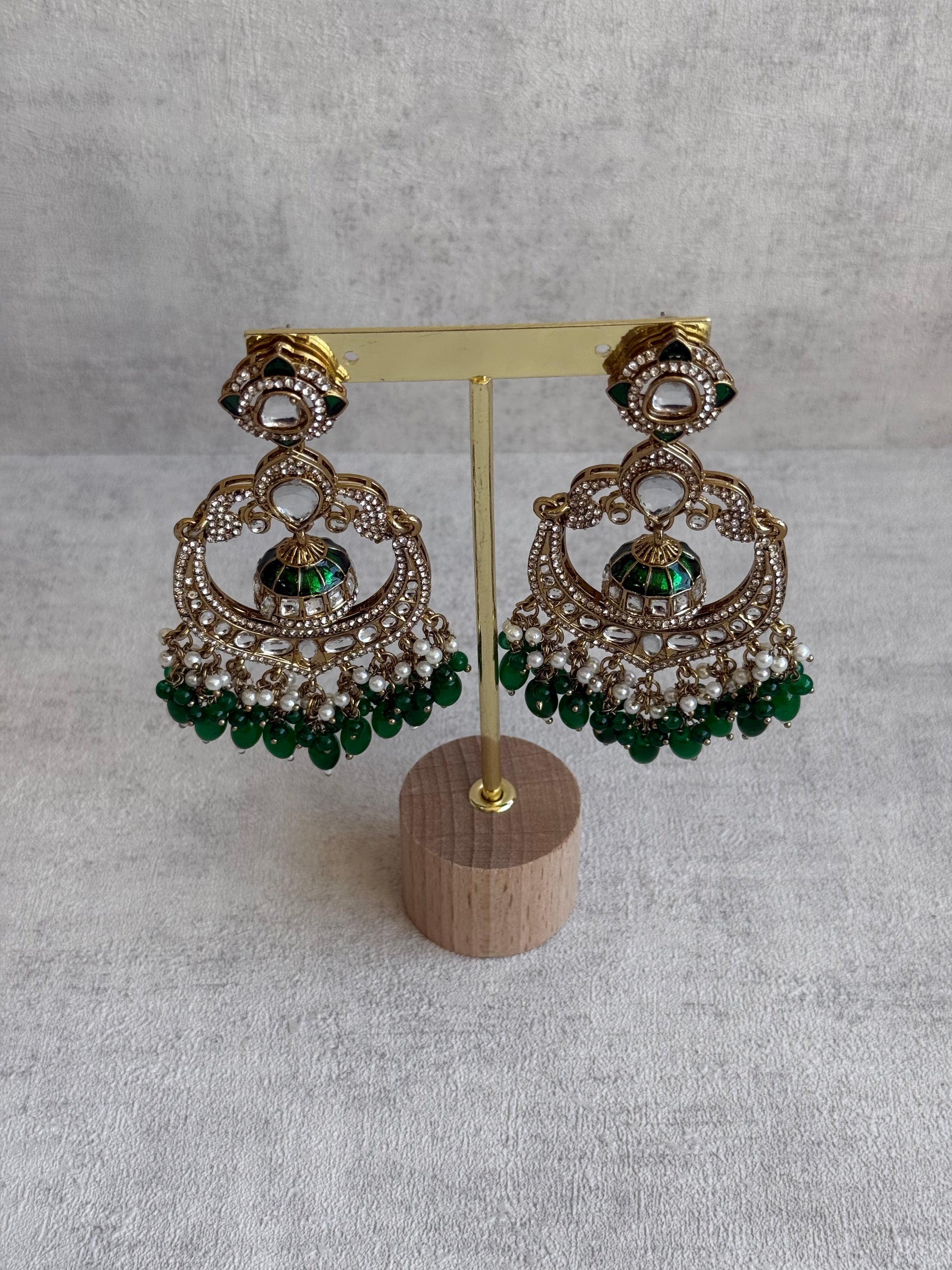 Vibrant, regal, and effortlessly striking — the Ayura Designs Reha Earrings – Statement Chandbalis with Emerald Green Beads, Pearls & Mirror-Cut Stones capture timeless grandeur in every detail. The deep emerald green enamel and beadwork radiate opulence, while the mirror-cut stones add a soft, radiant gleam that enhances the richness of the gold tones.
