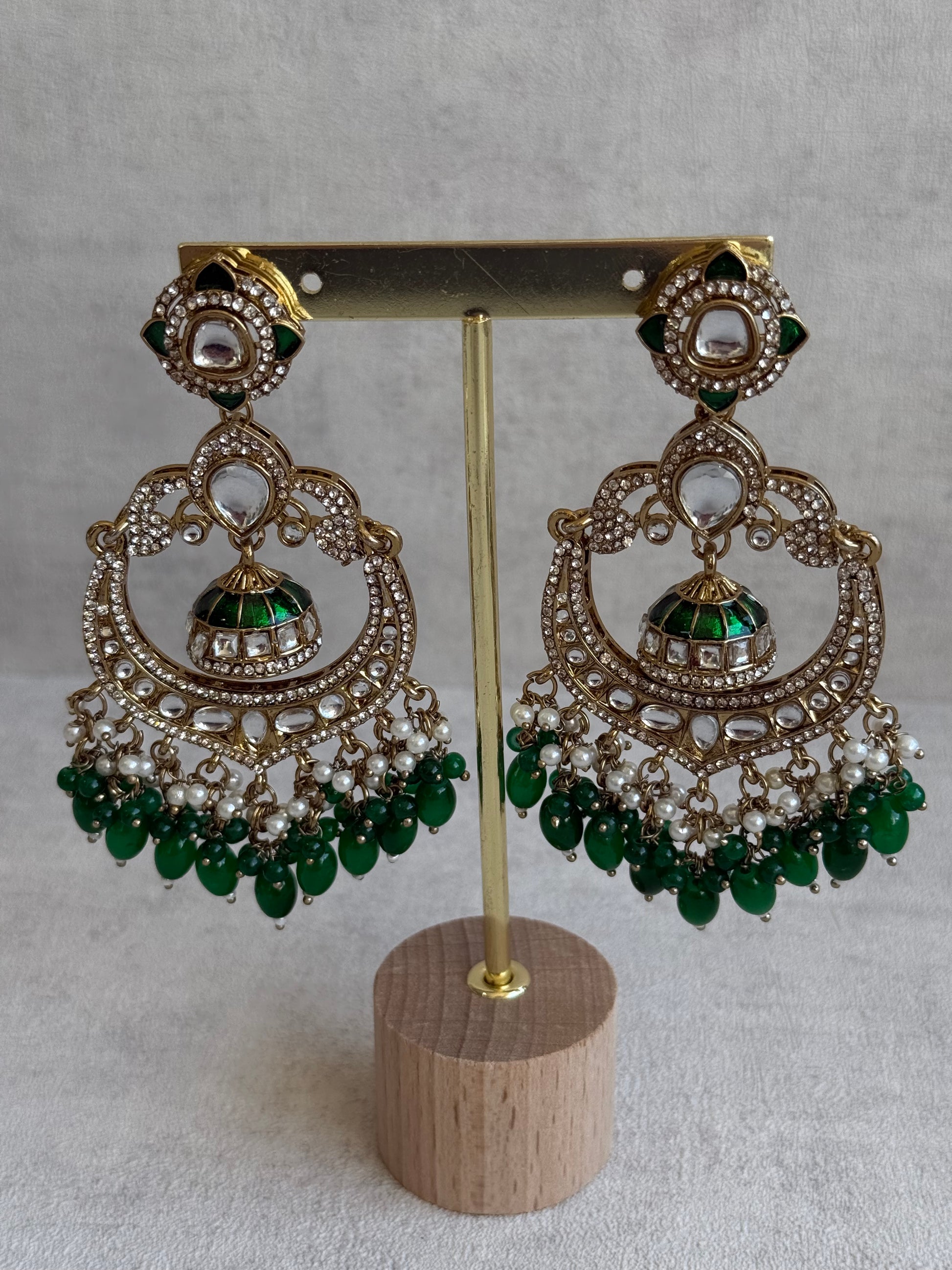 Each chandbali features Ayura’s signature intricate design — a domed jhumki centre framed by crescent layers of mirror-cut stones and tiny pearl accents. The emerald beads cascade delicately from the edge, adding depth, colour, and graceful movement with every turn.
