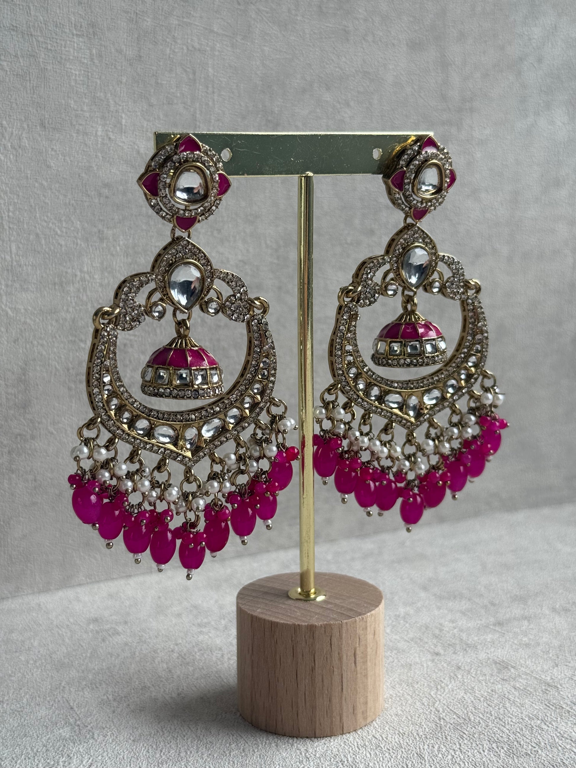Radiant, festive, and full of charm — the Ayura Designs Reha Earrings are a statement in celebration. Designed in an antique gold finish with intricate mirror-cut stones, these chandbalis are adorned with luminous pearls and hot pink beads that bring an irresistible pop of colour. Every detail — from the central dome to the tiny pearl clusters — reflects the artistry of classic South Asian craftsmanship.