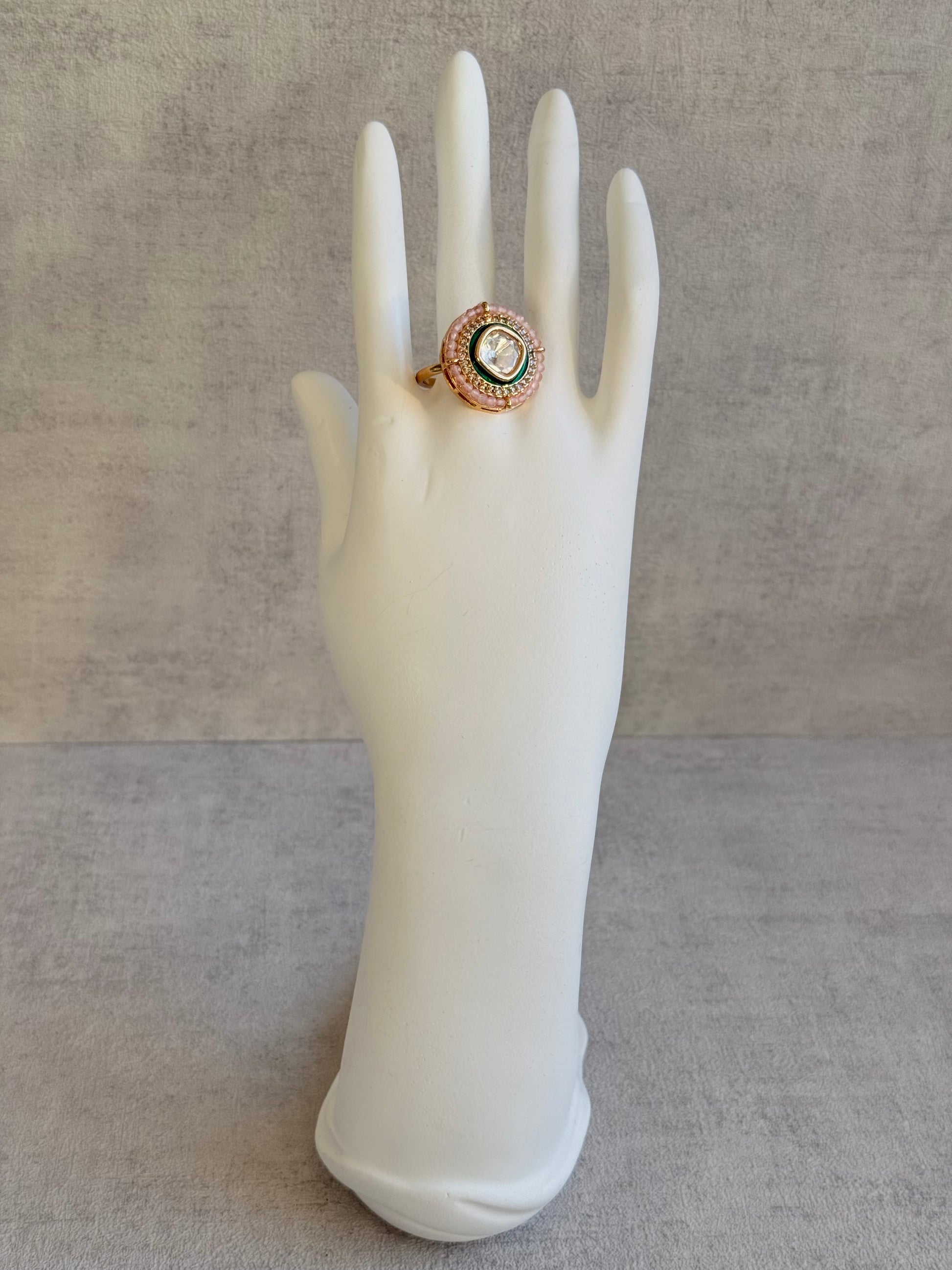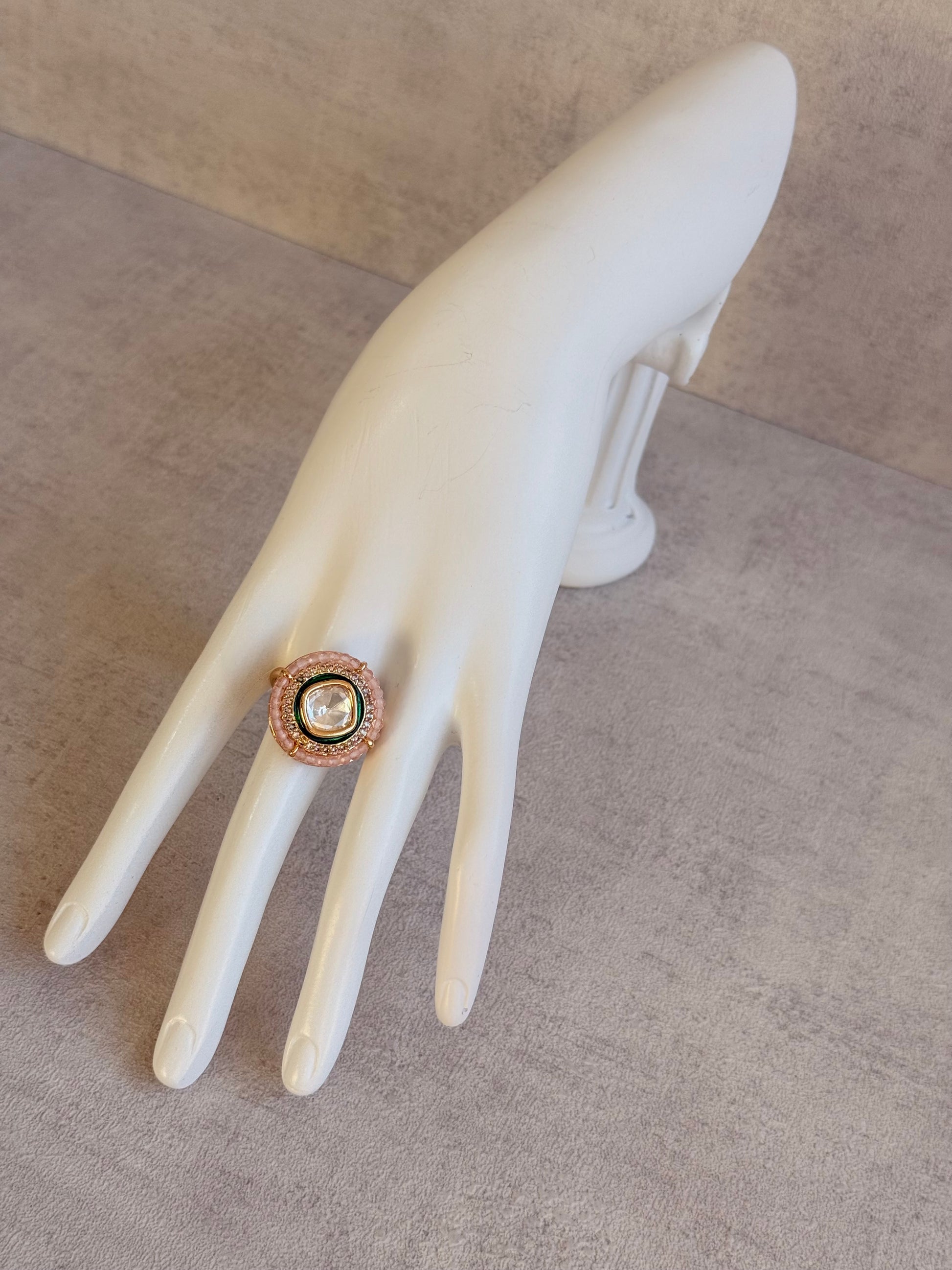 Encircling the design are blush pink beads – gentle and feminine, perfect for daytime events, bridesmaids, or those who love subtle beauty. The soft hue enhances the ring’s overall charm, adding warmth without overpowering the design.