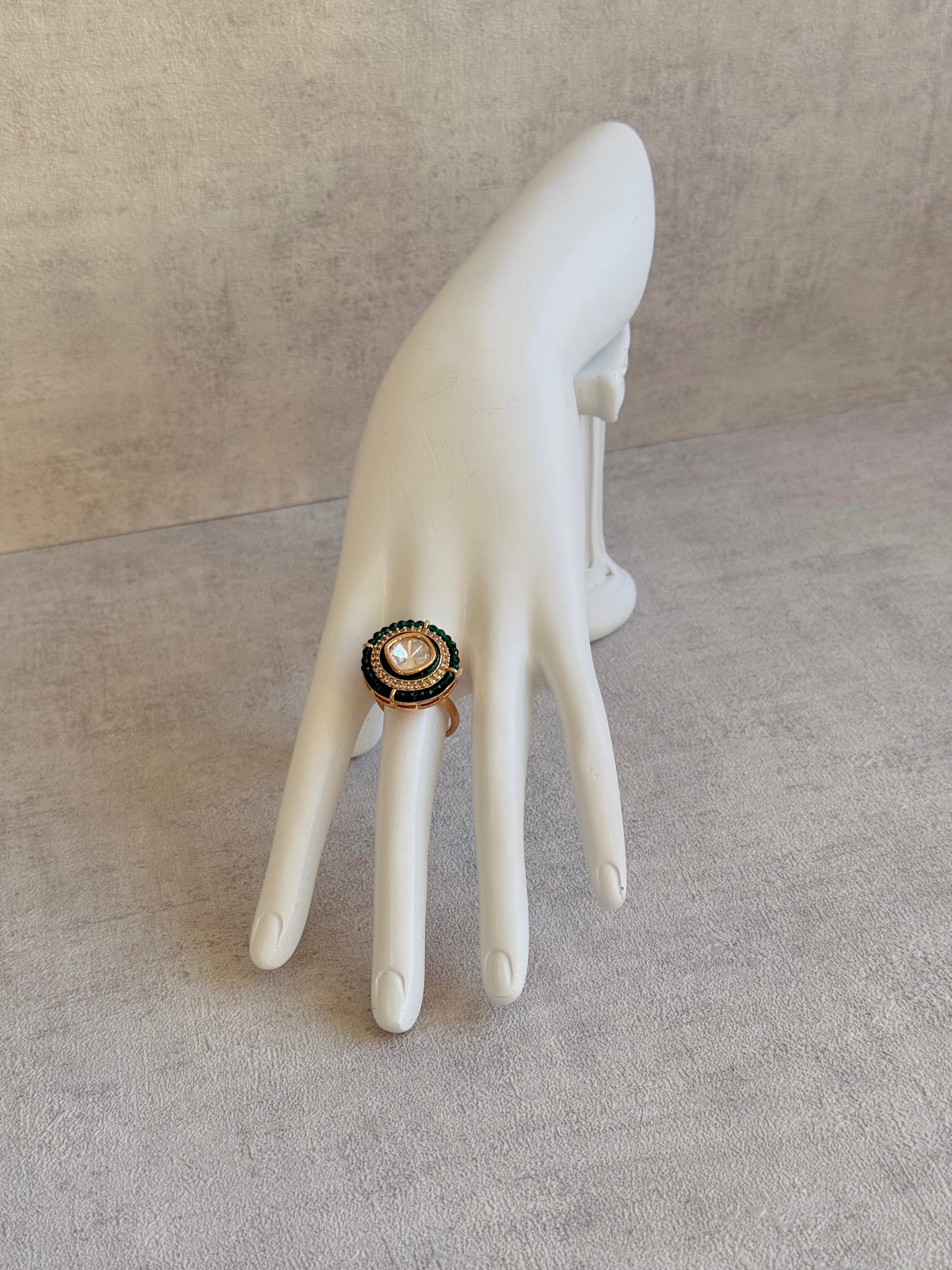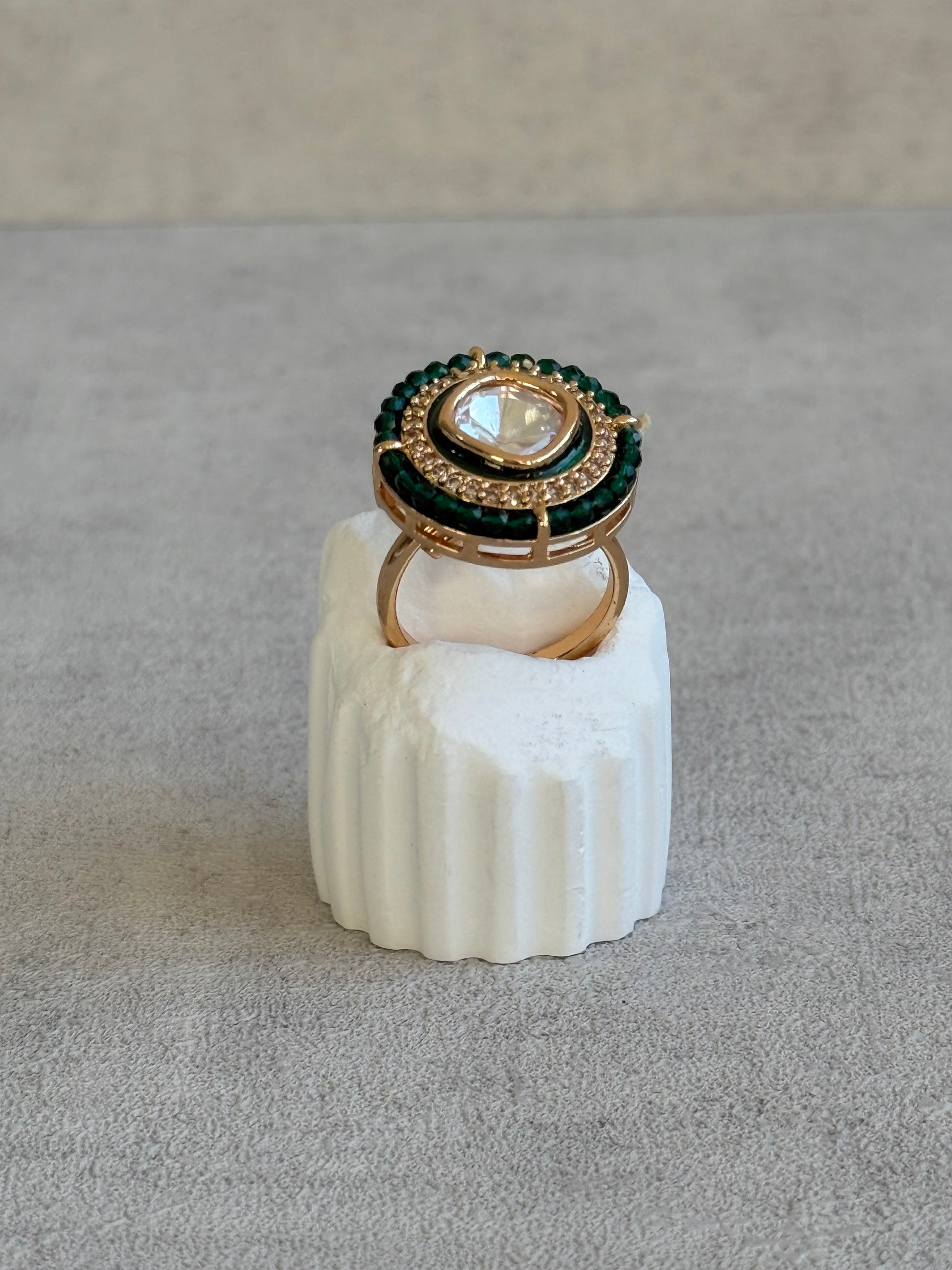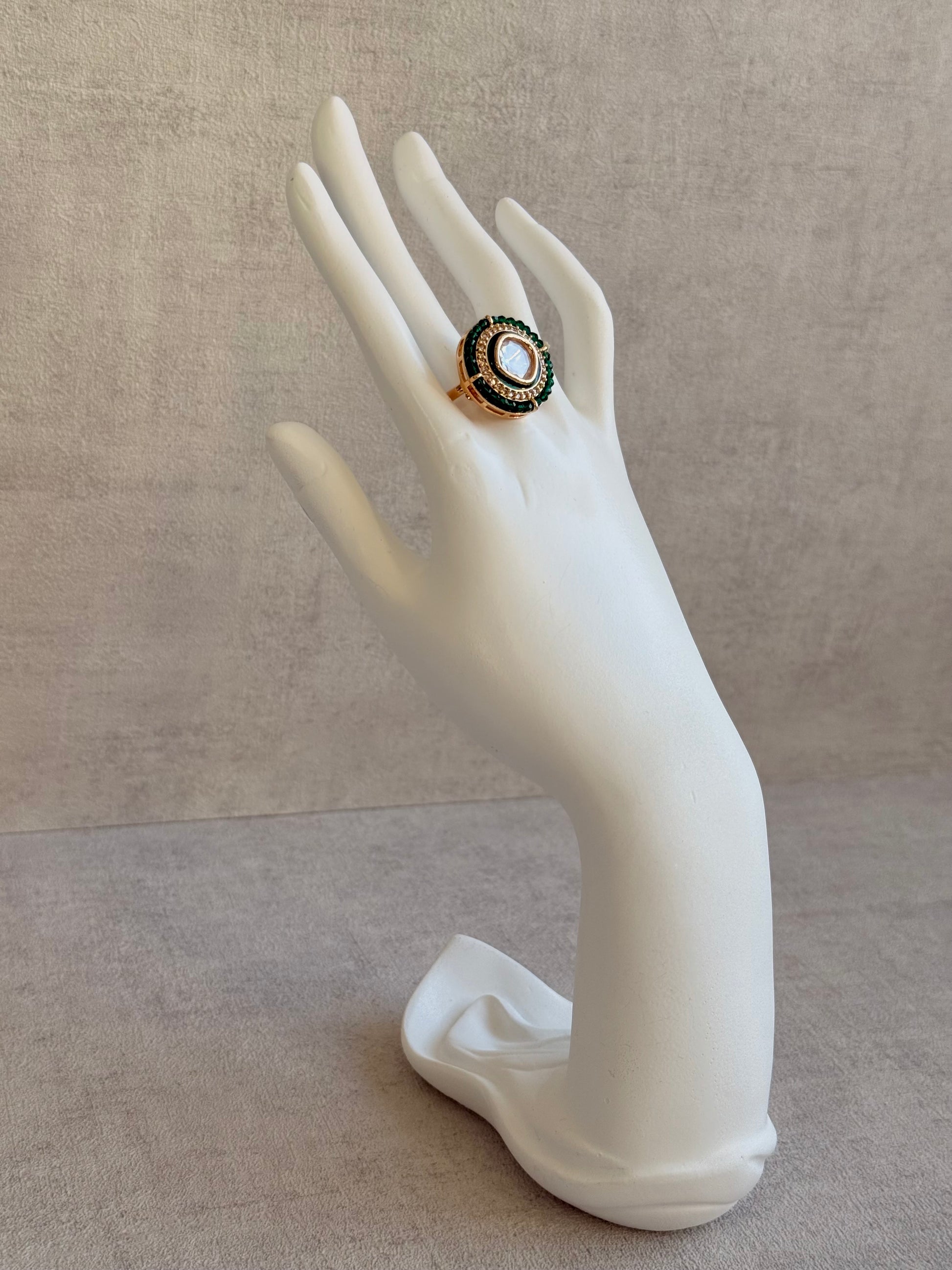 Bold emerald green beads encircle the ring, adding a deep, jewel-toned pop of colour. The rich contrast between green and gold lends the piece an unmistakably royal flair, ideal for evening occasions, weddings, or when you’re looking to make a statement.