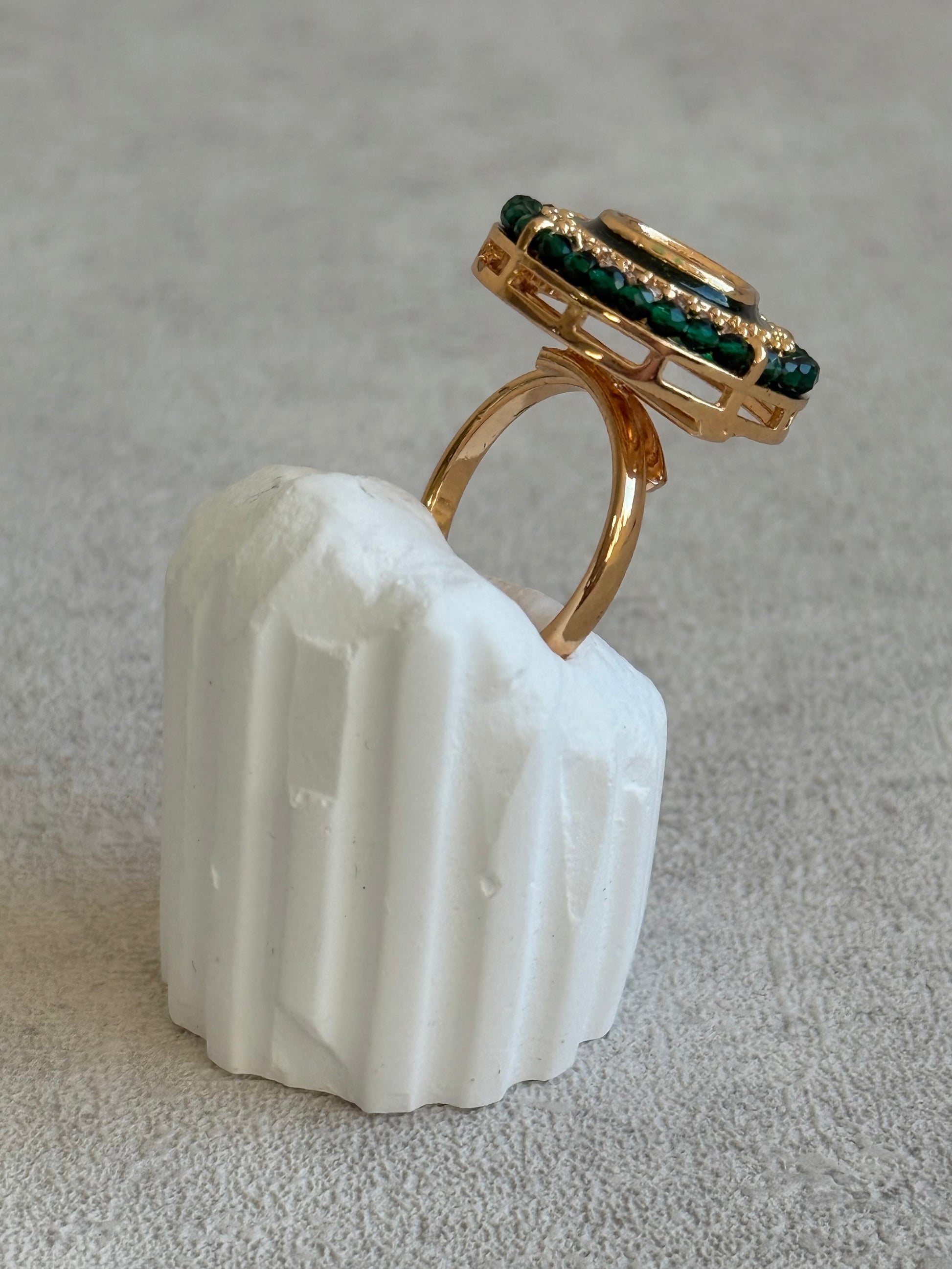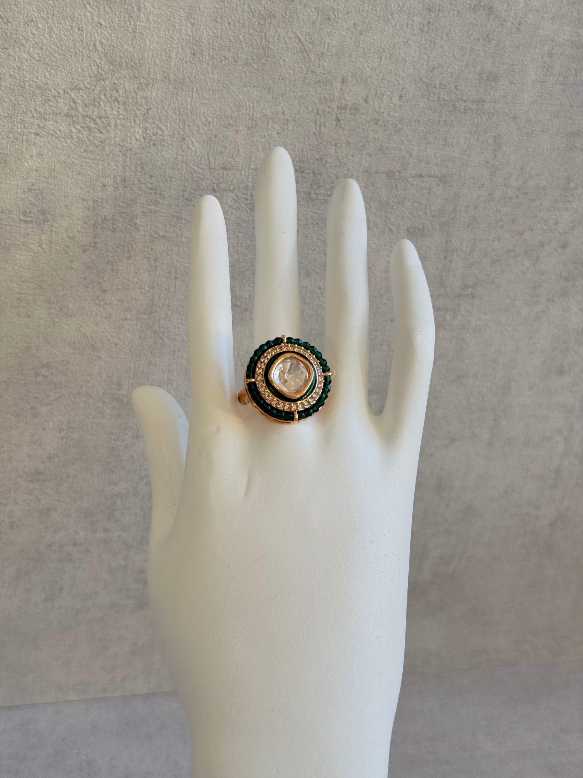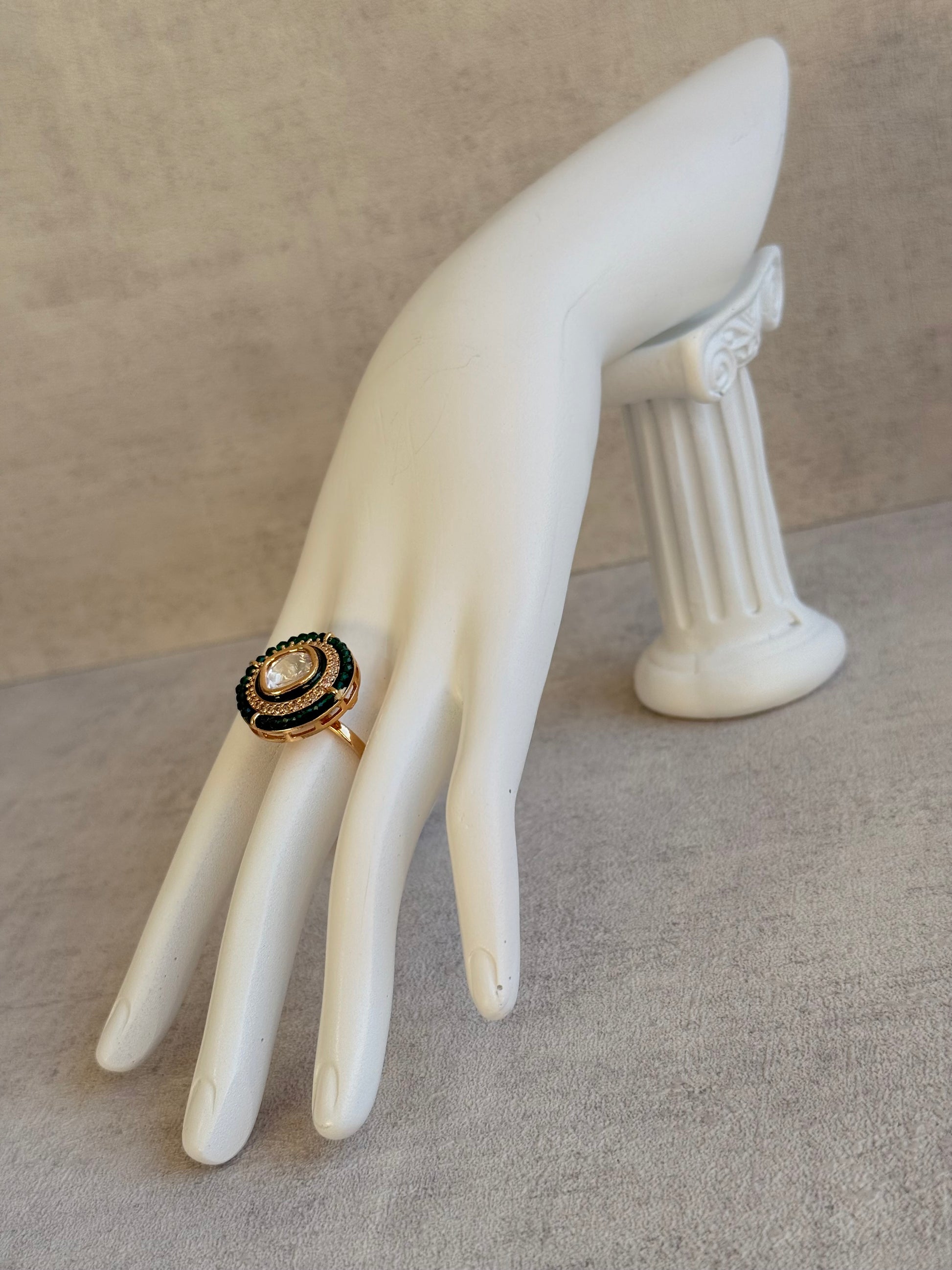 Bold emerald green beads encircle the ring, adding a deep, jewel-toned pop of colour. The rich contrast between green and gold lends the piece an unmistakably royal flair, ideal for evening occasions, weddings, or when you’re looking to make a statement.