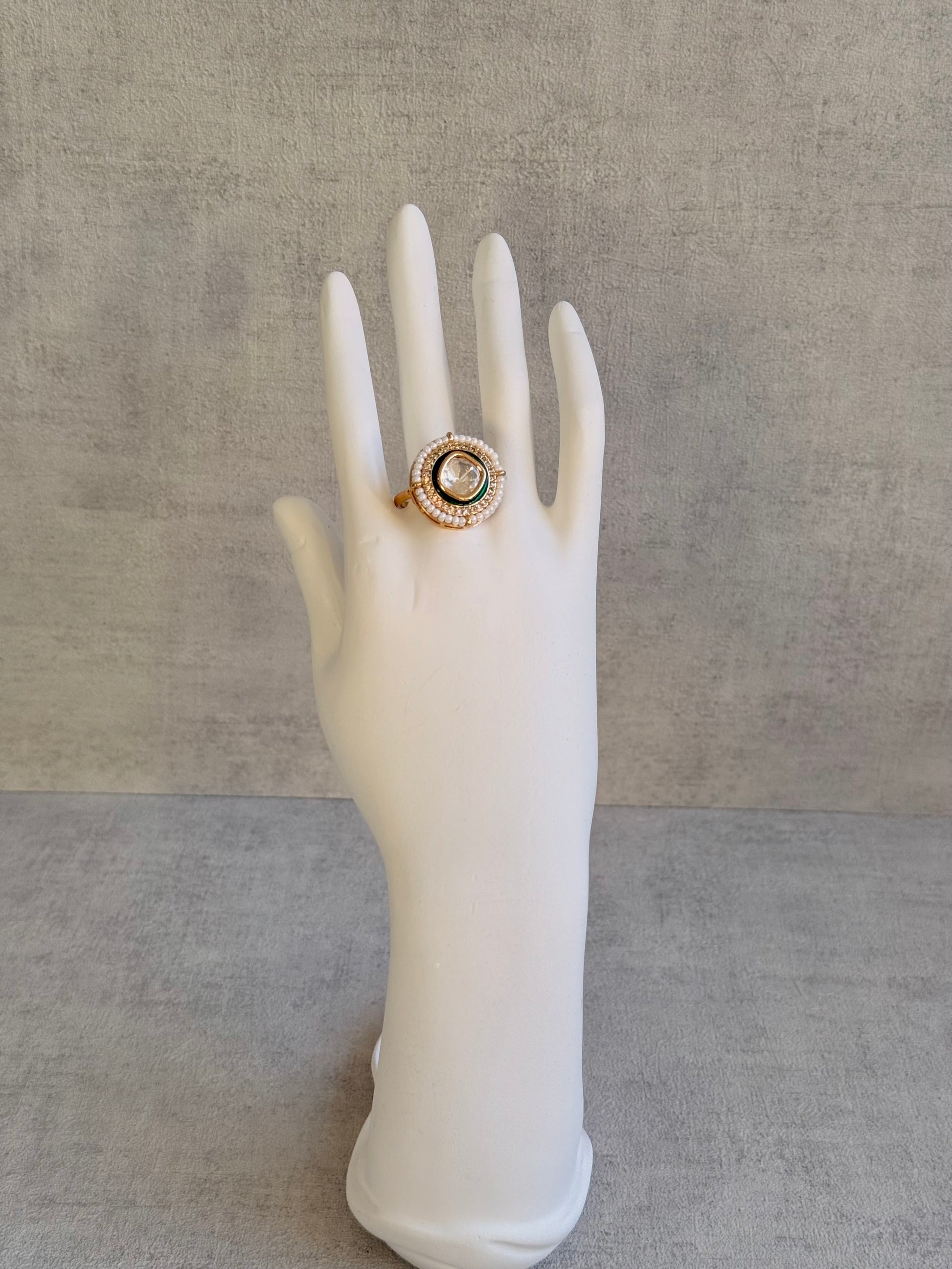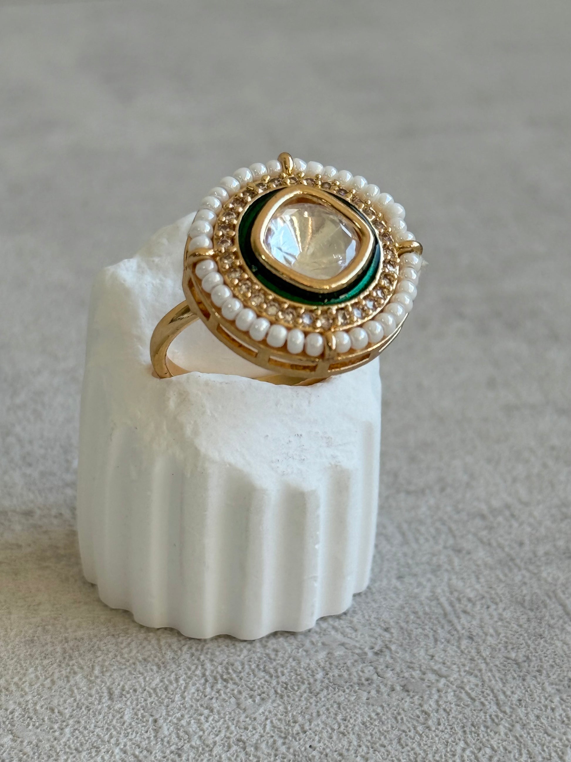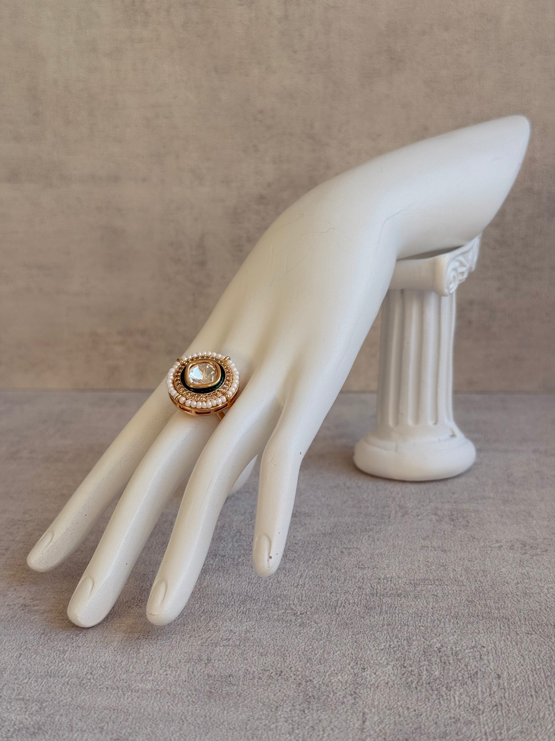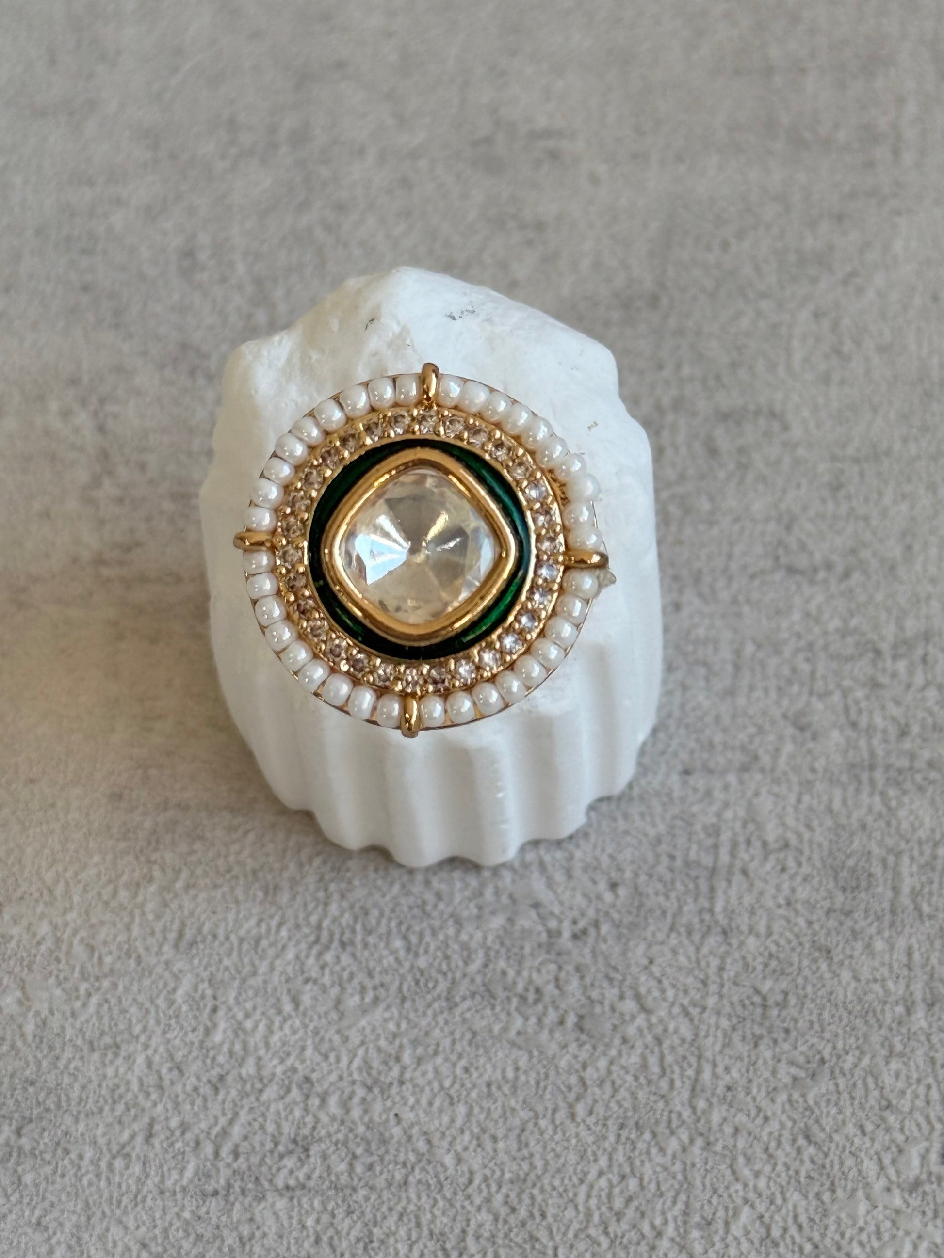 A row of dainty ivory pearls surrounds the outer edge, adding a timeless and graceful touch. Their soft sheen balances the bold sparkle of the centre, offering a sophisticated finish that works beautifully with both western and desi outfits.