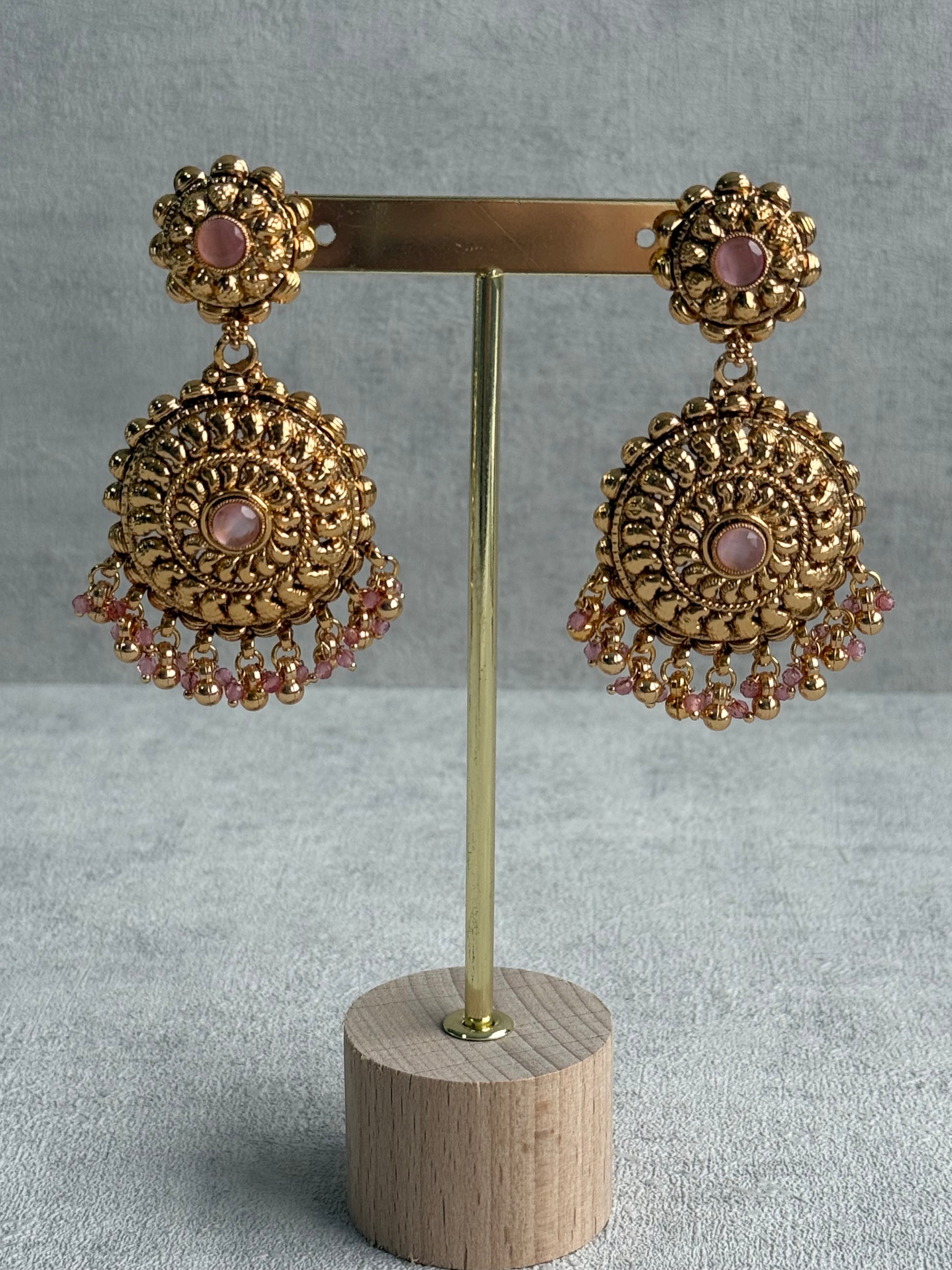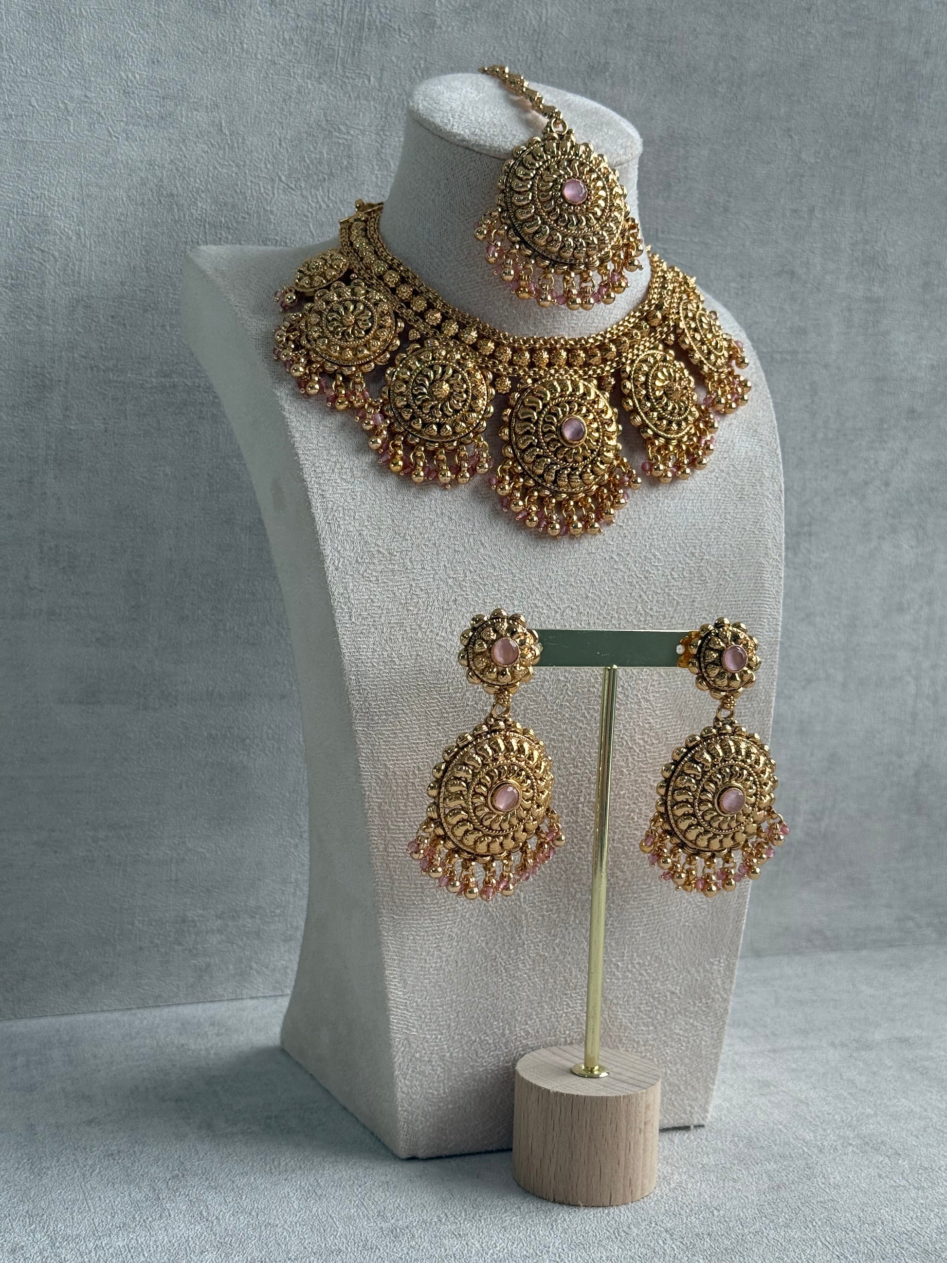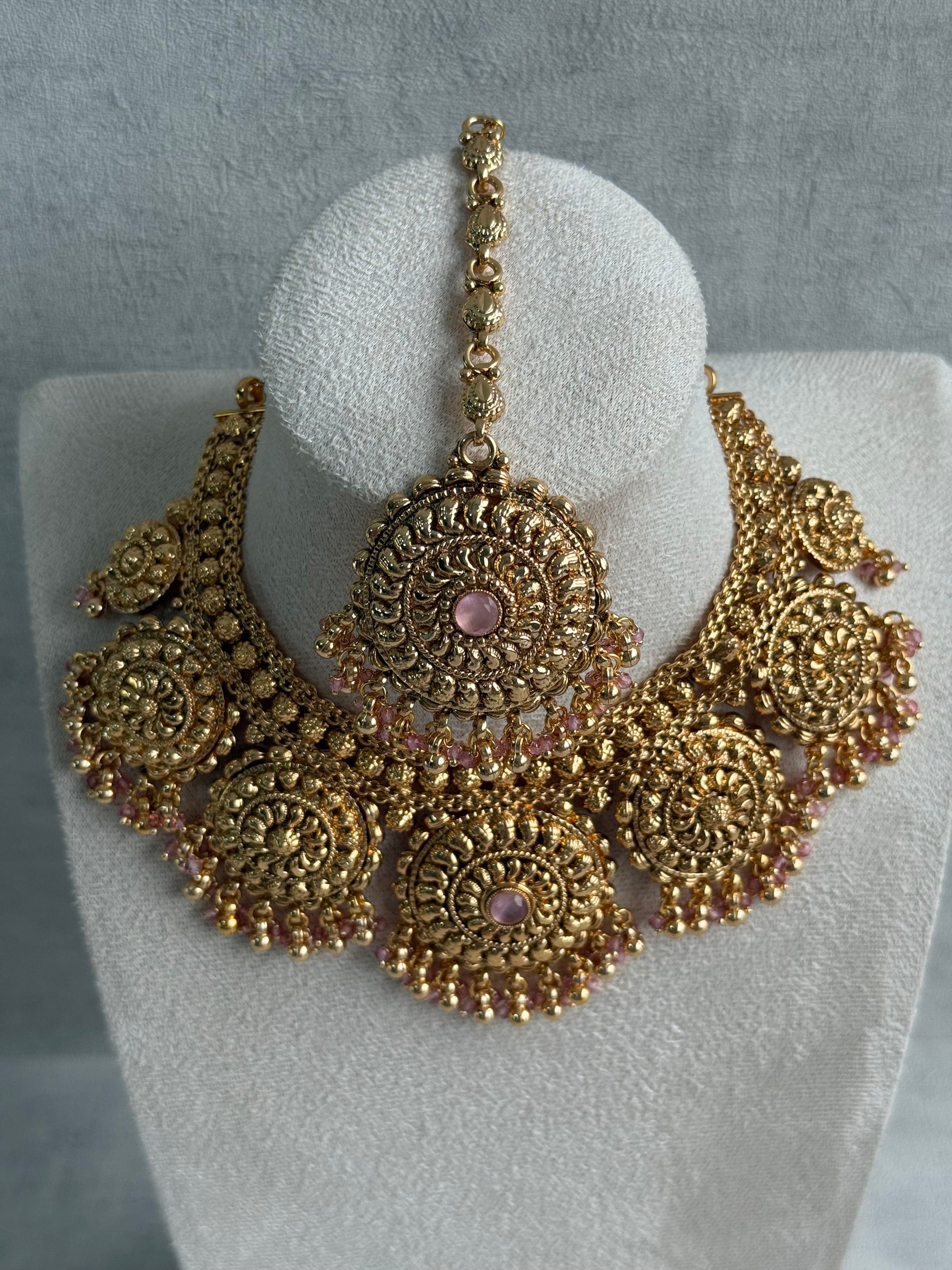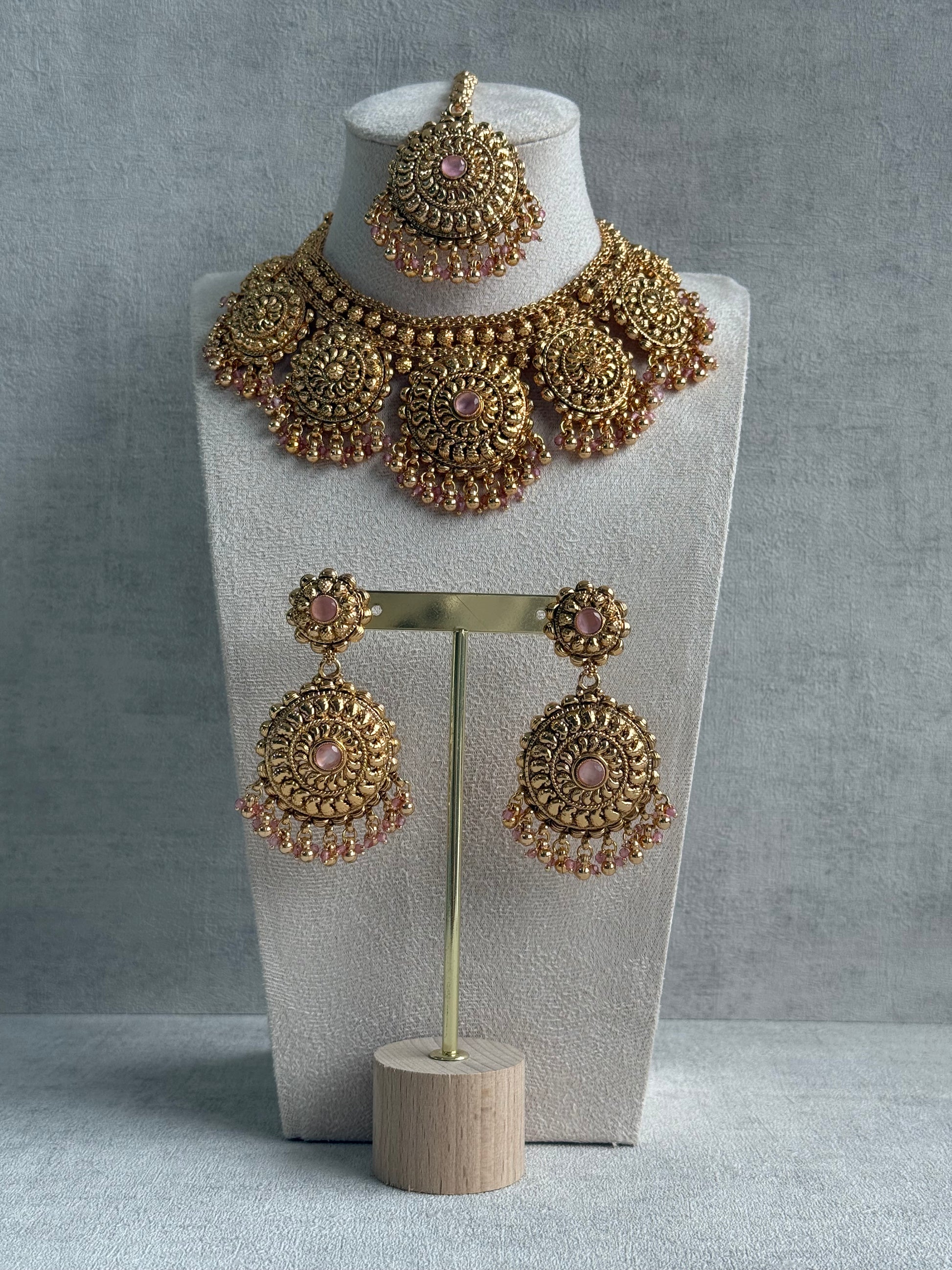 The necklace features ornate circular motifs with a soft blush pink stone at the centre, surrounded by detailed engravings and framed with delicate gold spheres. A fringe of blush pink beads adds a graceful touch of colour and fluidity to the design. The matching earrings and tikka mirror the same craftsmanship, striking the perfect balance between grandeur and subtle femininity.