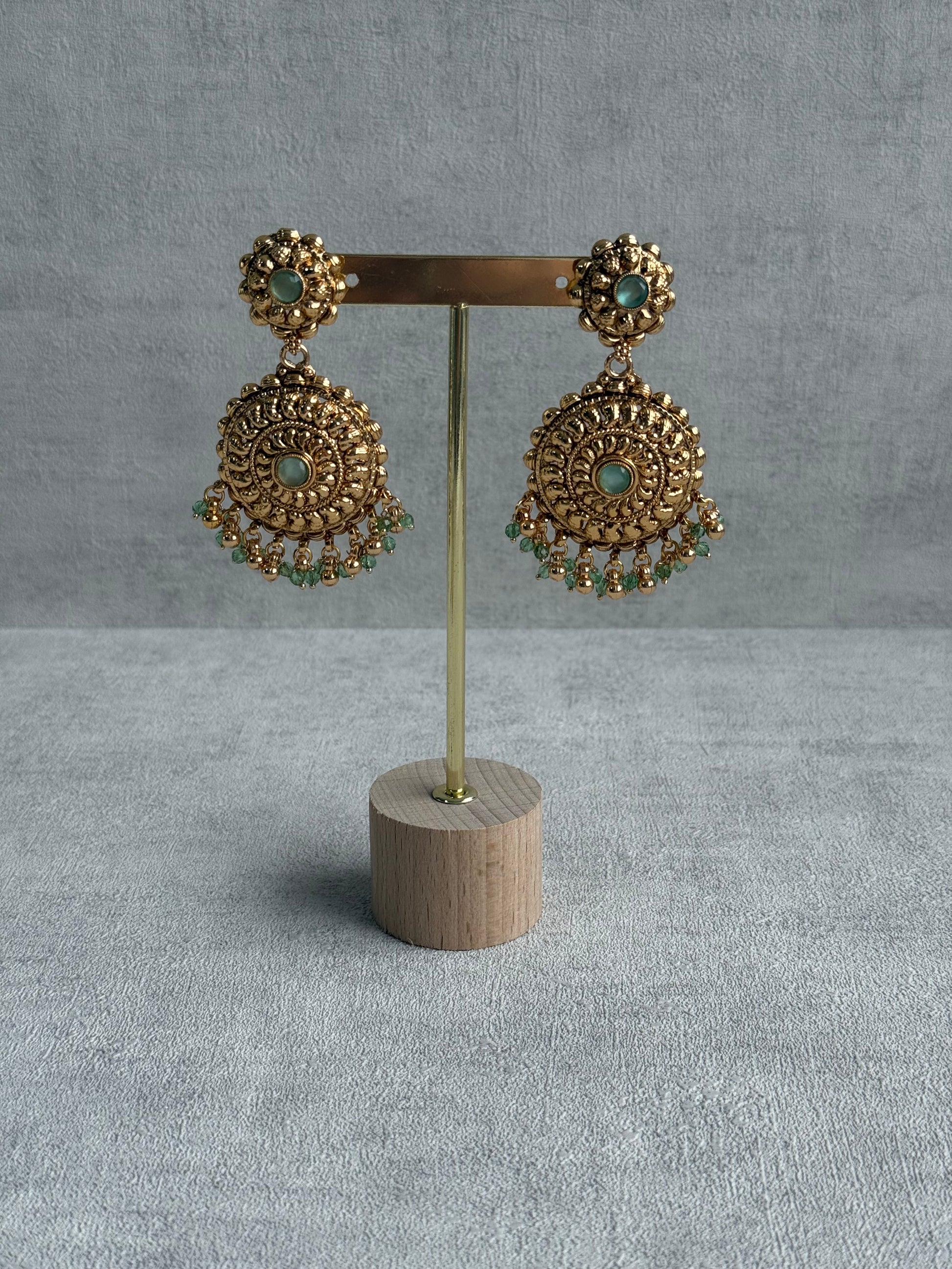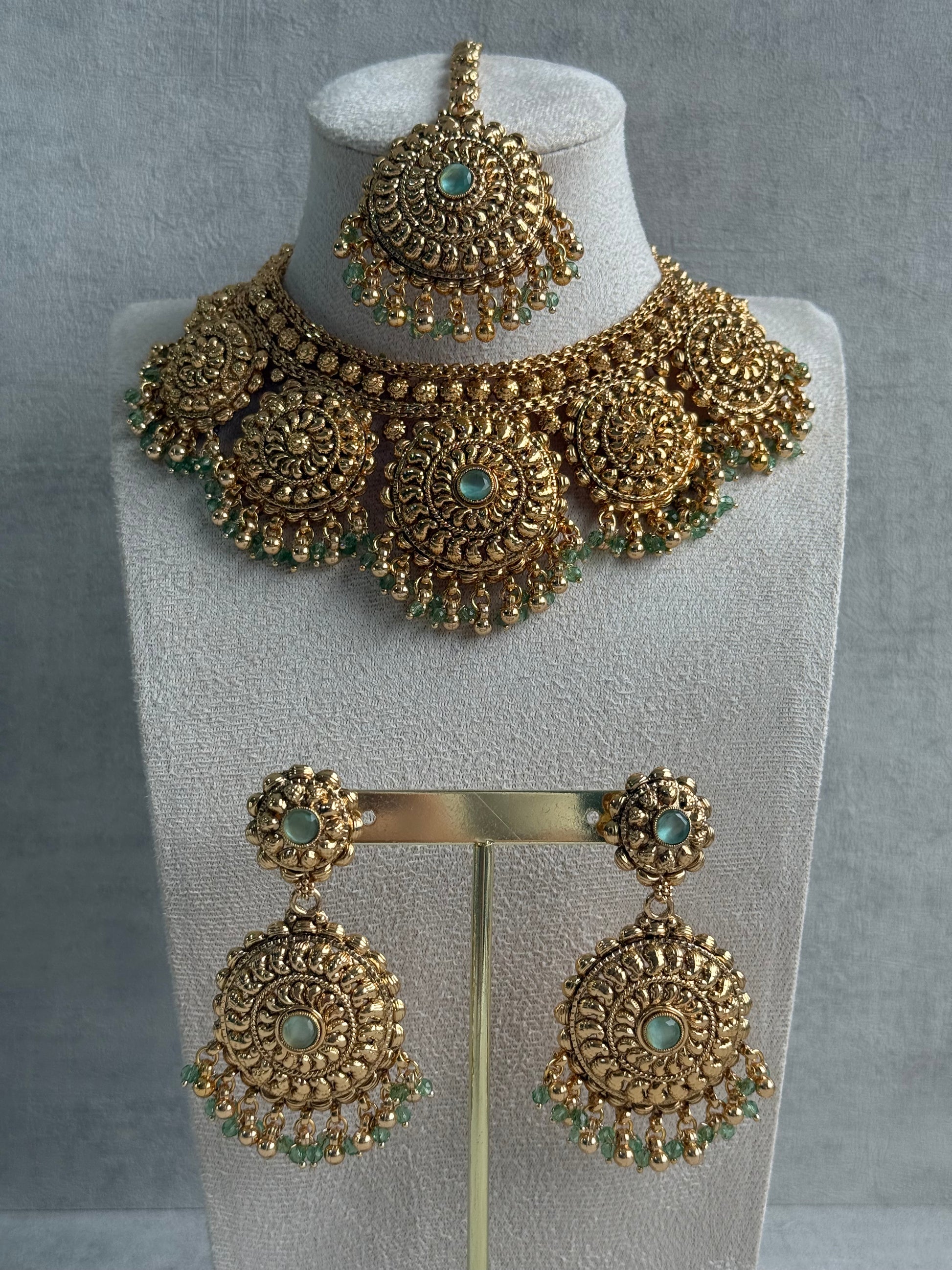 Each circular motif is richly textured with traditional gold carvings and highlighted by a pistachio green stone at its centre. The edges are adorned with fine gold beads interspersed with pistachio green drops, adding a delicate play of colour that enhances the set’s ornate design. The coordinating earrings and tikka mirror the same craftsmanship, bringing balance and brilliance to the complete look.