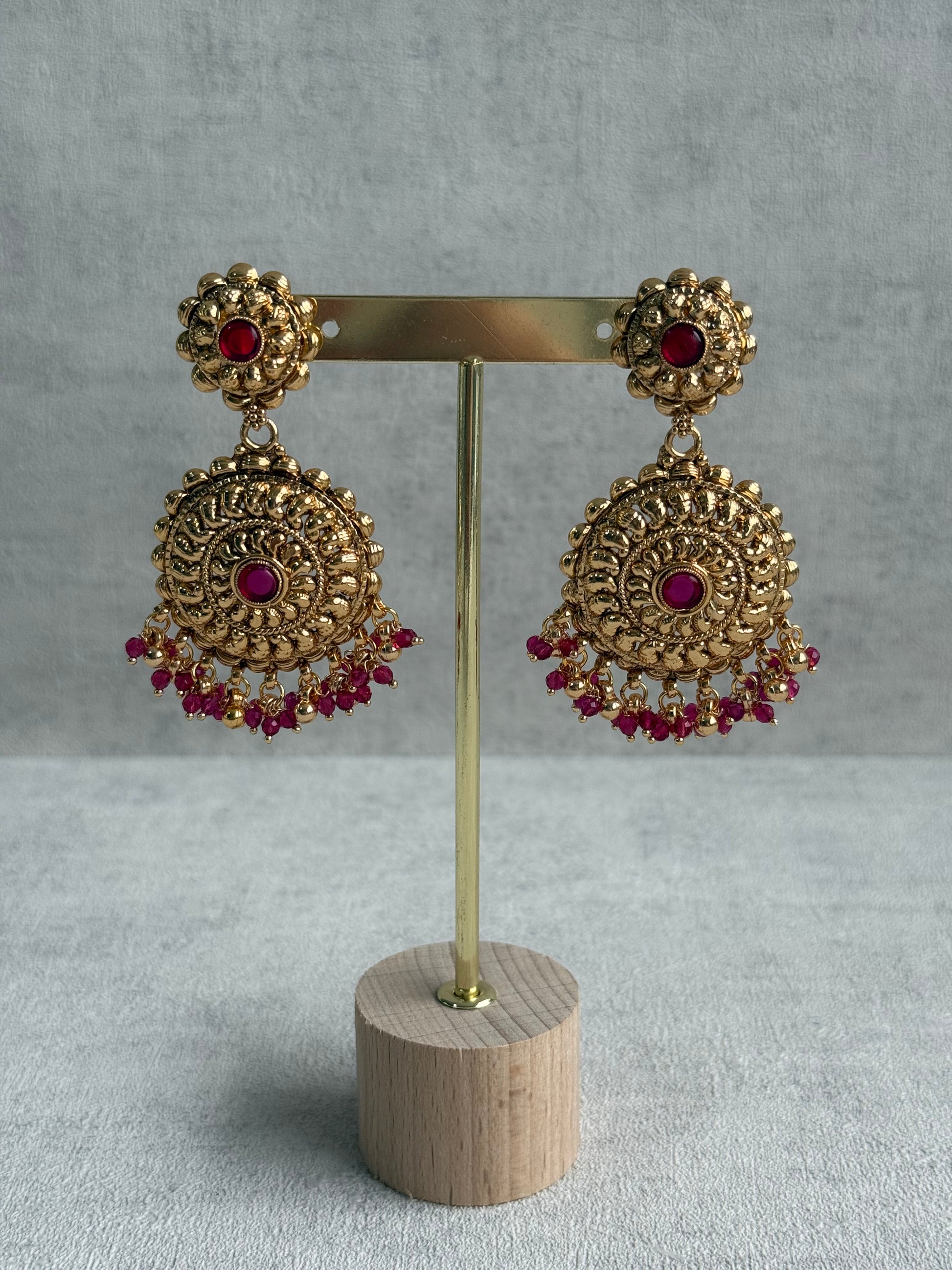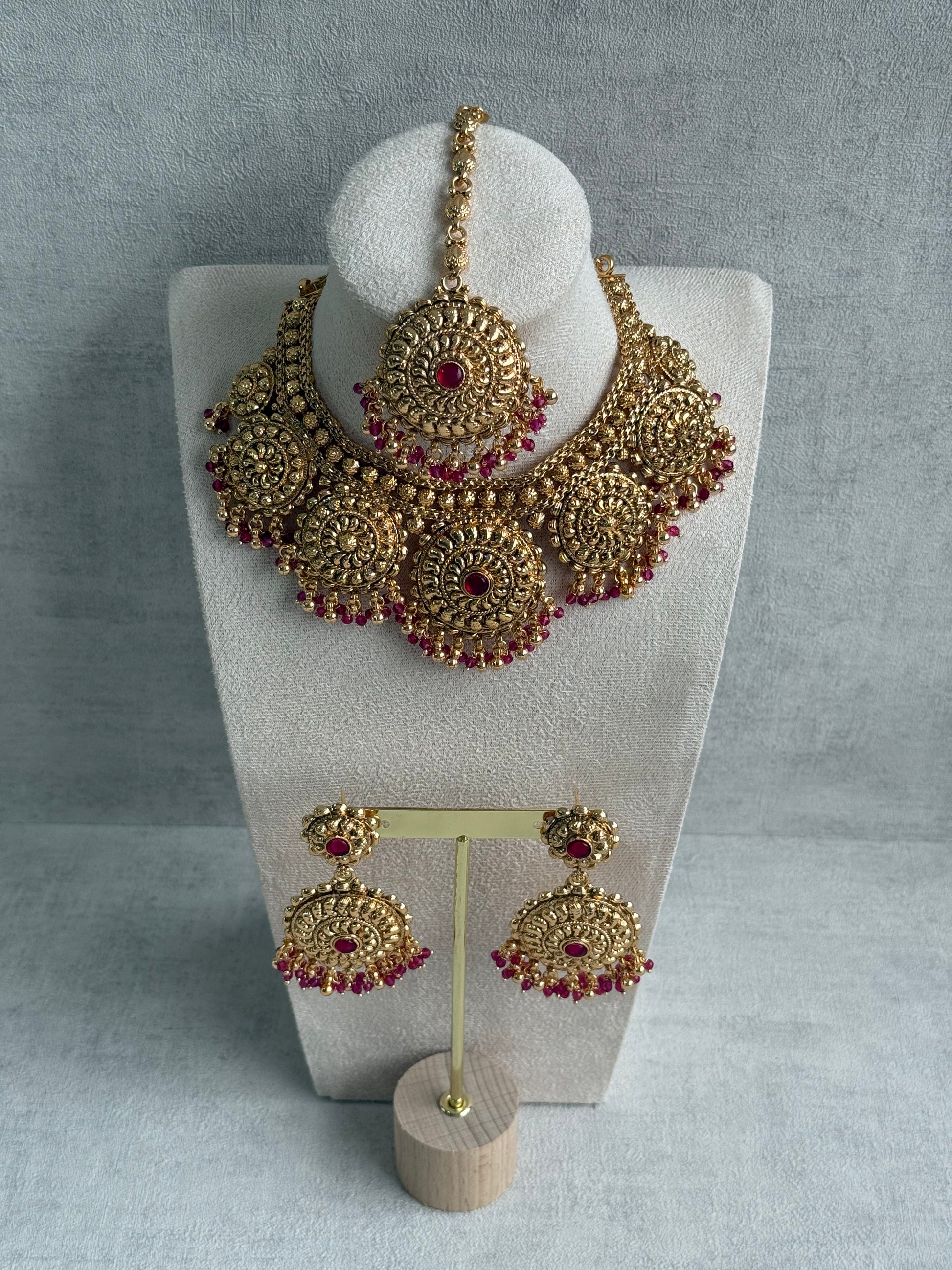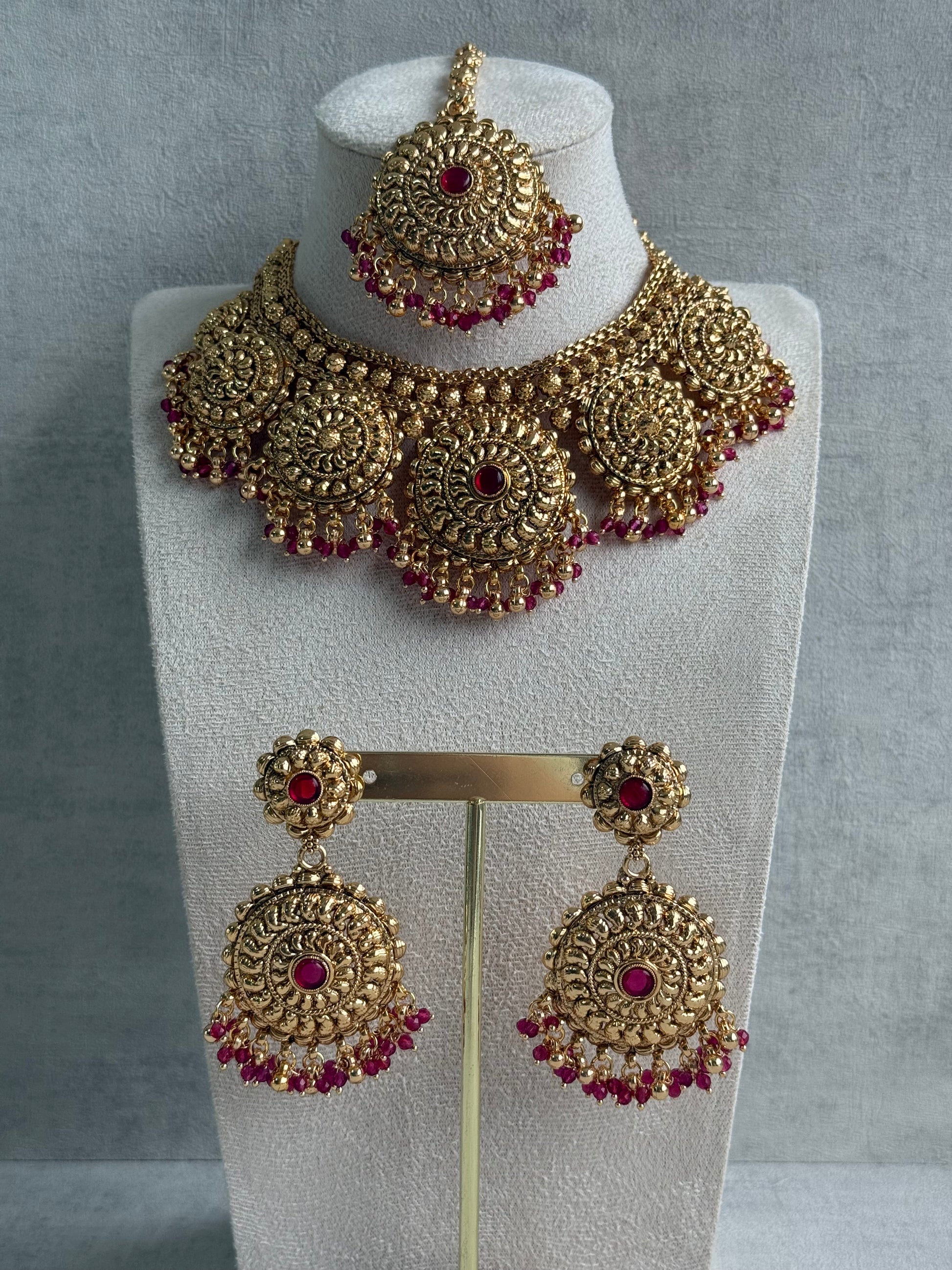 Each circular pendant is intricately embossed with swirling patterns and finished with a central Rani pink stone, adding a striking contrast that catches the eye. Along the base, glistening gold beads are interlaced with Rani pink drops, lending the set a luxurious pop of colour and feminine vibrance. The matching earrings and tikka echo the same grandeur, completing the coordinated, elevated look.