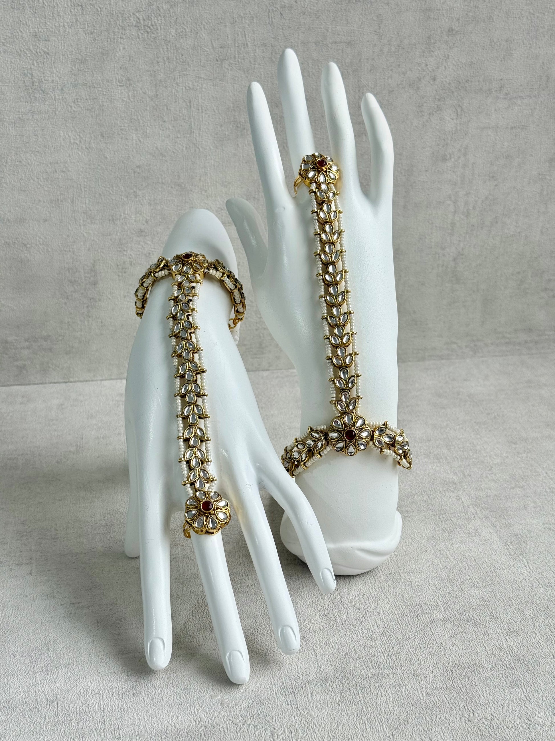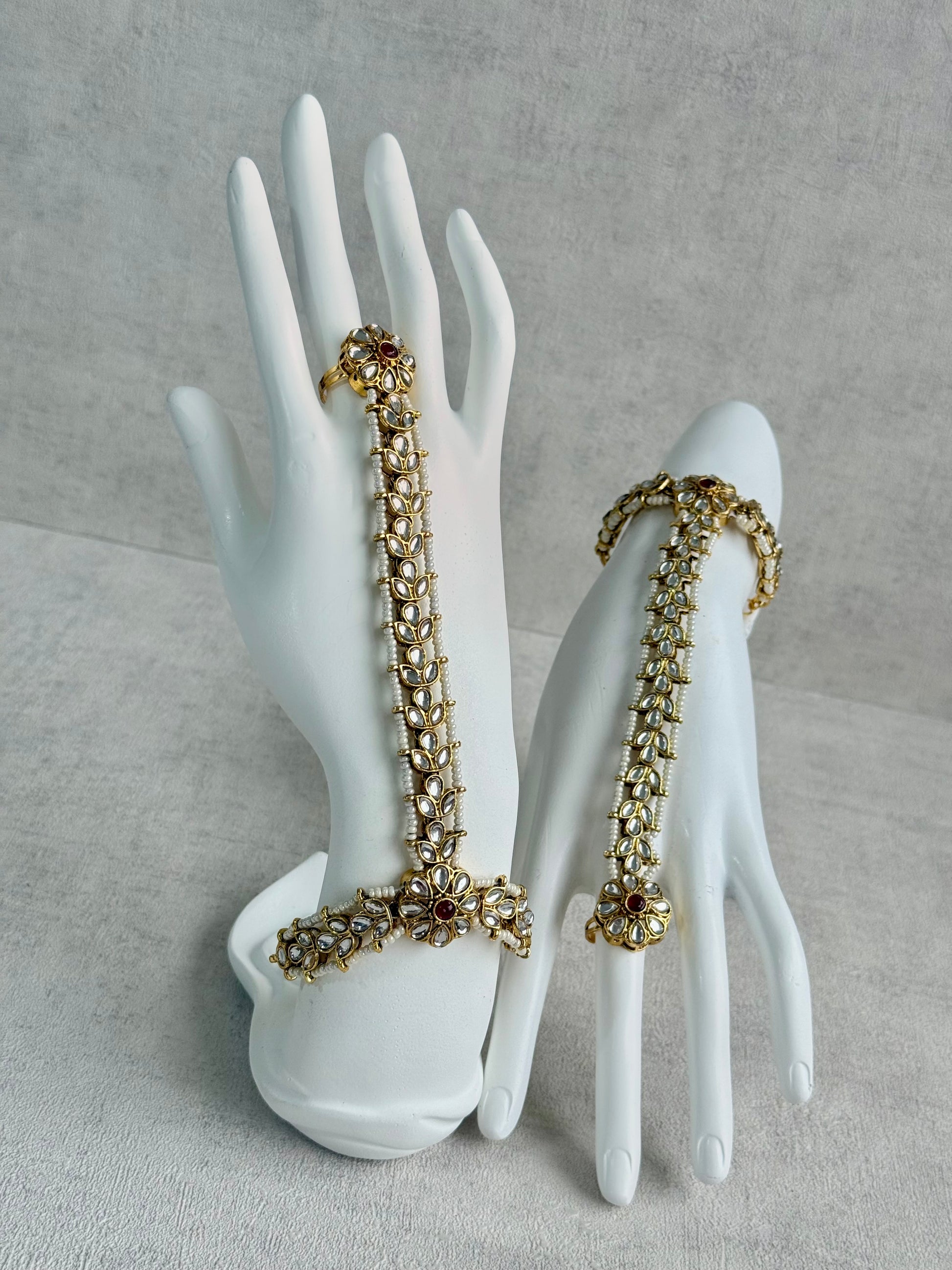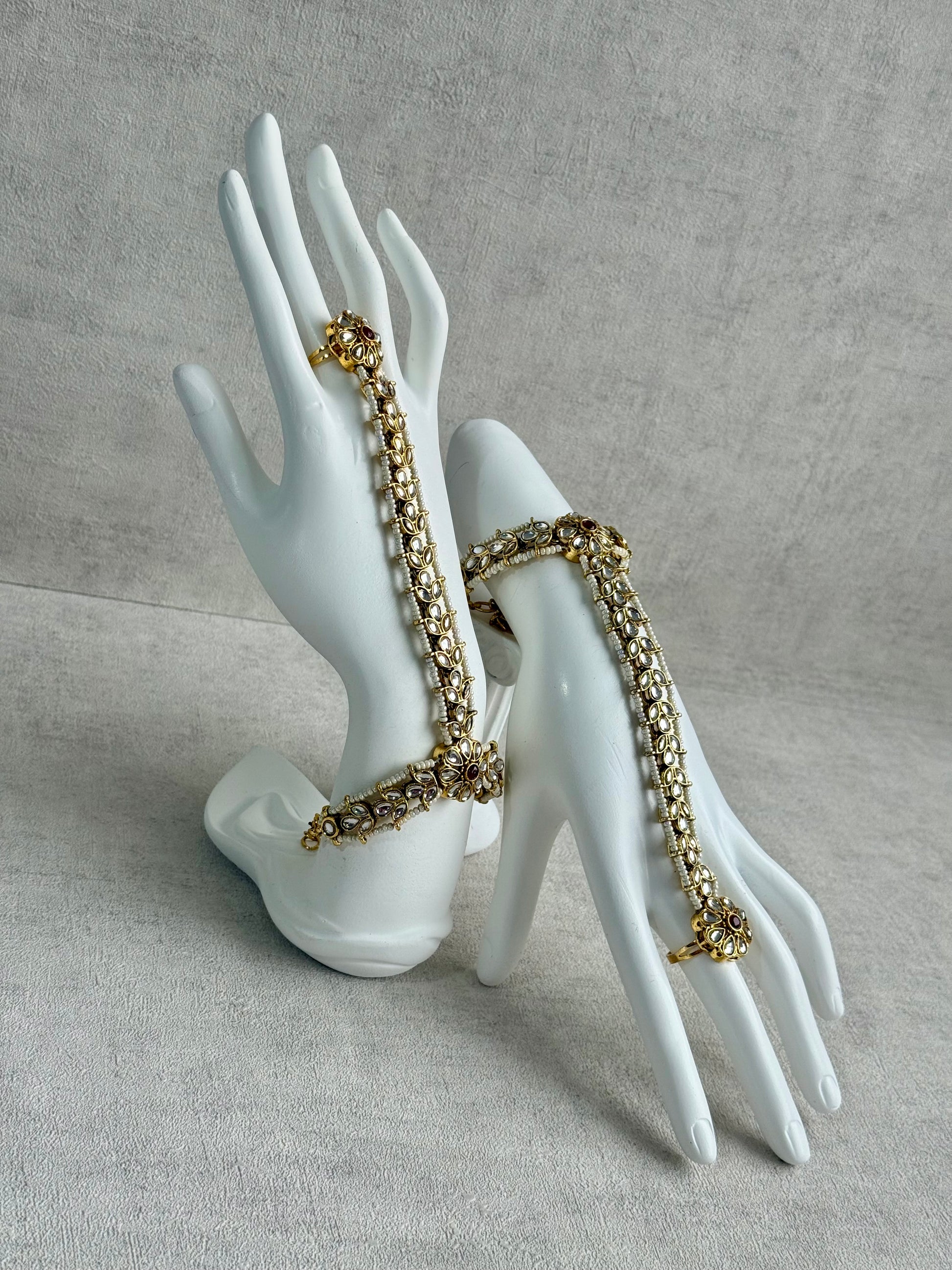 The Ruya Haathphool is a graceful blend of traditional elegance and delicate craftsmanship, designed to drape beautifully across the hand. Featuring a refined line of mirror-cut stones set in an antique gold finish, this piece is accented with rich ruby-toned centres that add a subtle pop of colour without overpowering the design.