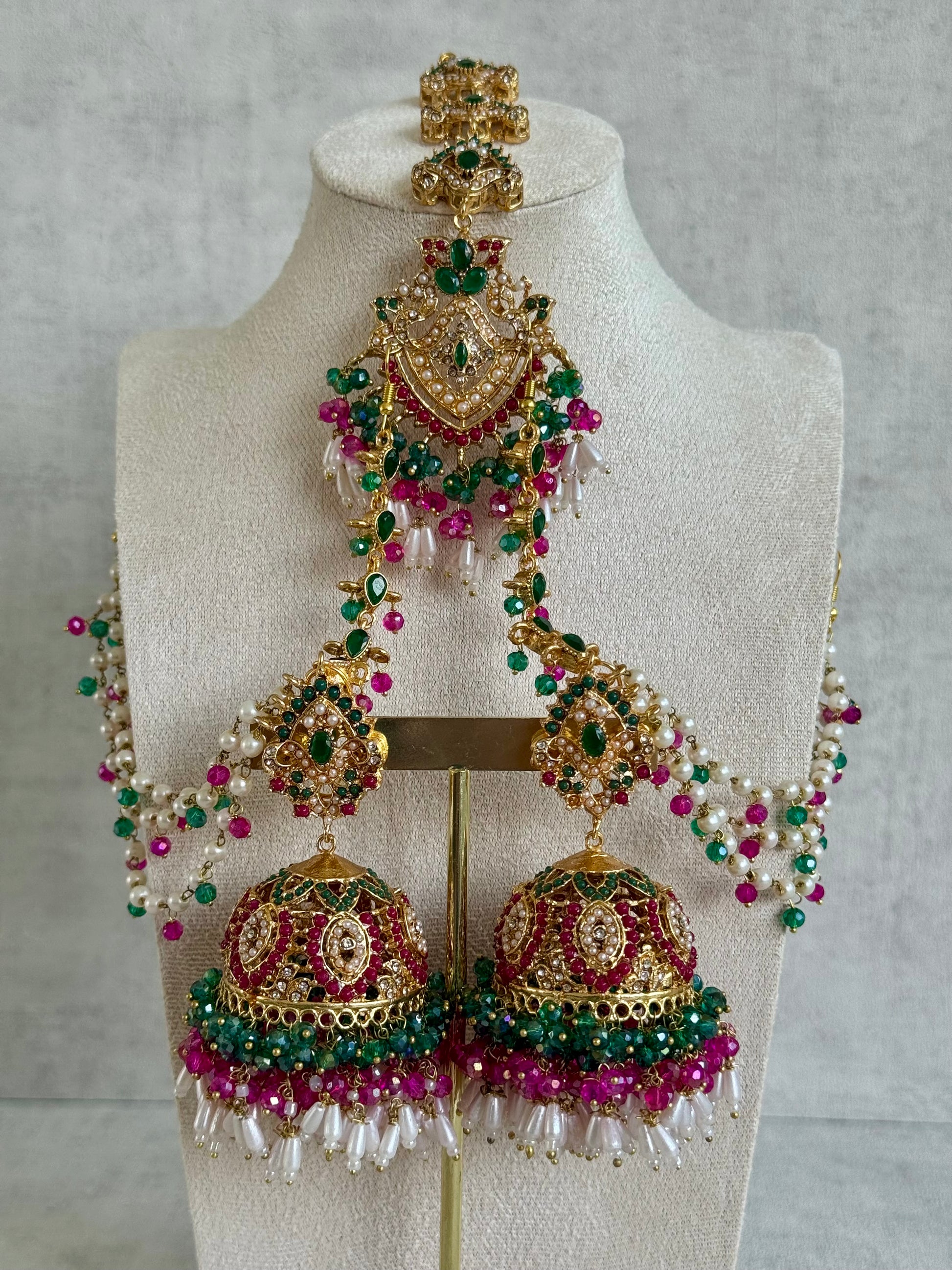 Rich and regal, the Ayura Designs Safia Tikka Set with Sahare Earrings – Champagne Crystals with Ruby & Emerald is a true ode to Mughal-inspired grandeur. Featuring a layered tikka design adorned with champagne crystals, deep ruby red stones, and emerald green accents, this set instantly commands attention. The matching jhumkis are equally majestic, framed with sparkling brown beads and traditional pearl drops, while the triple sahare chains drape gracefully along the ear with a mix of champagne and pearl strands.