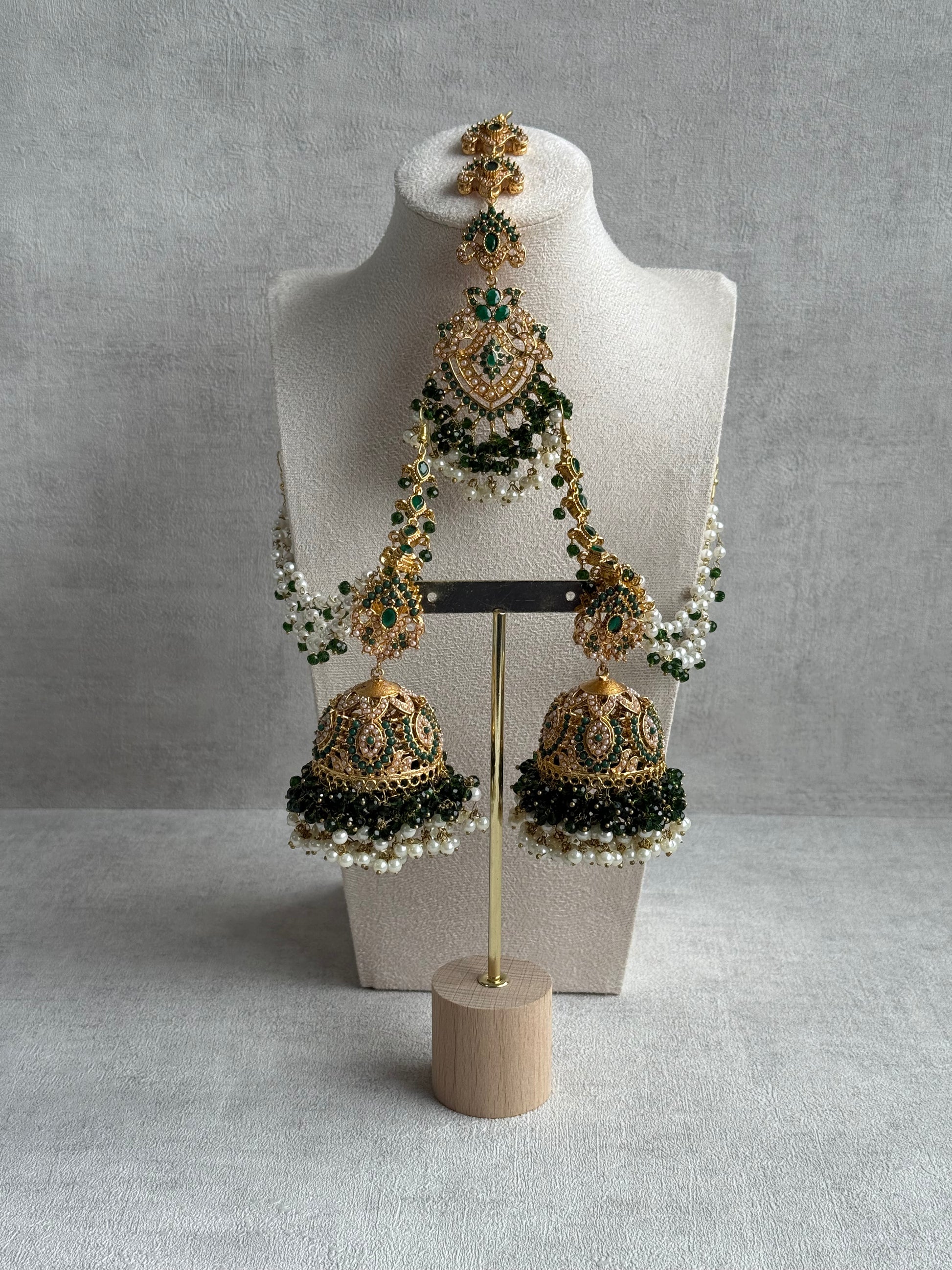 Each jhumki showcases intricate gold-toned filigree, highlighted with champagne crystals and deep emerald green beads that add a touch of royal depth. The sahare chains, strung with alternating pearls and green stones, drape beautifully to complete the opulent silhouette.