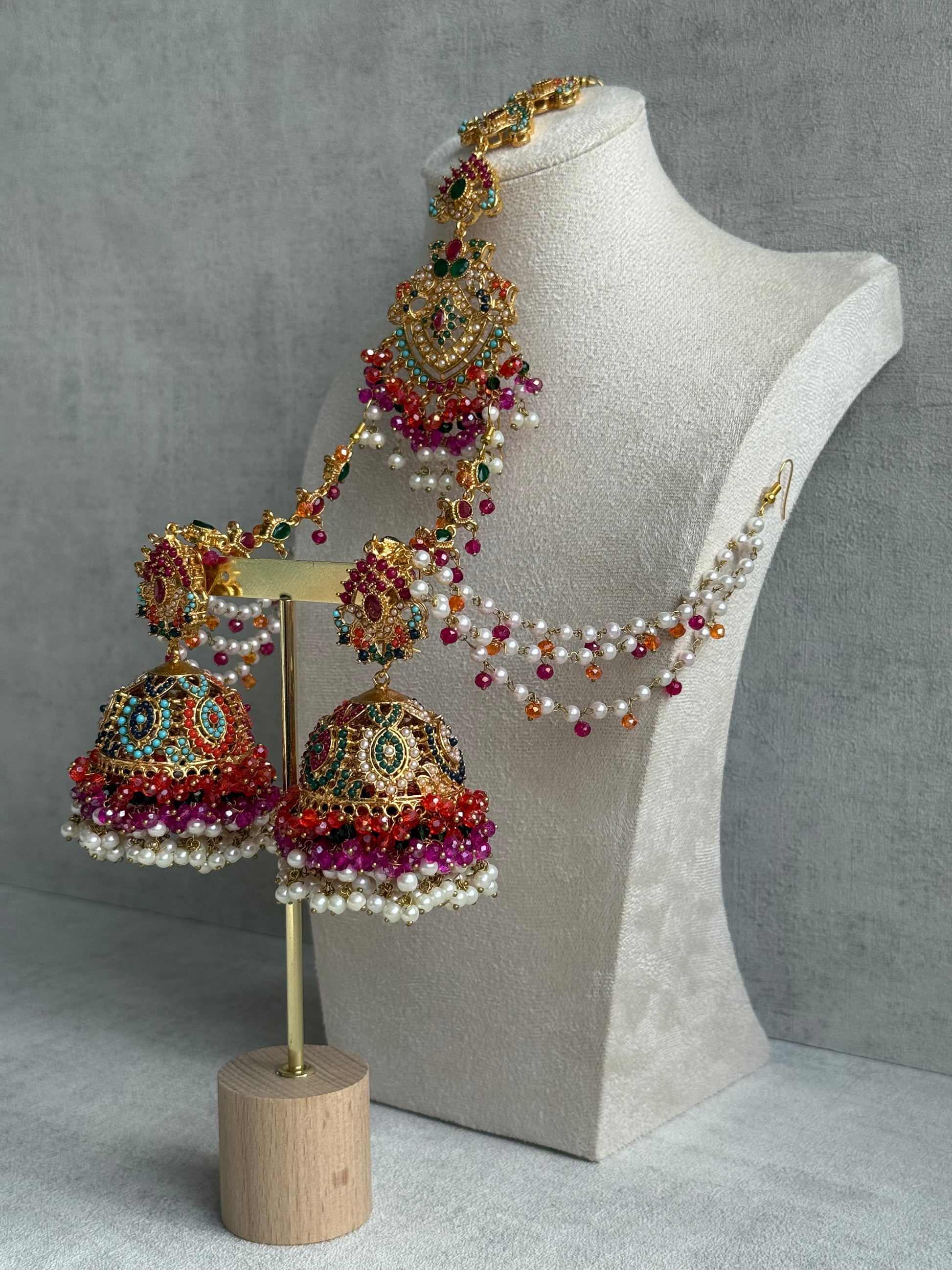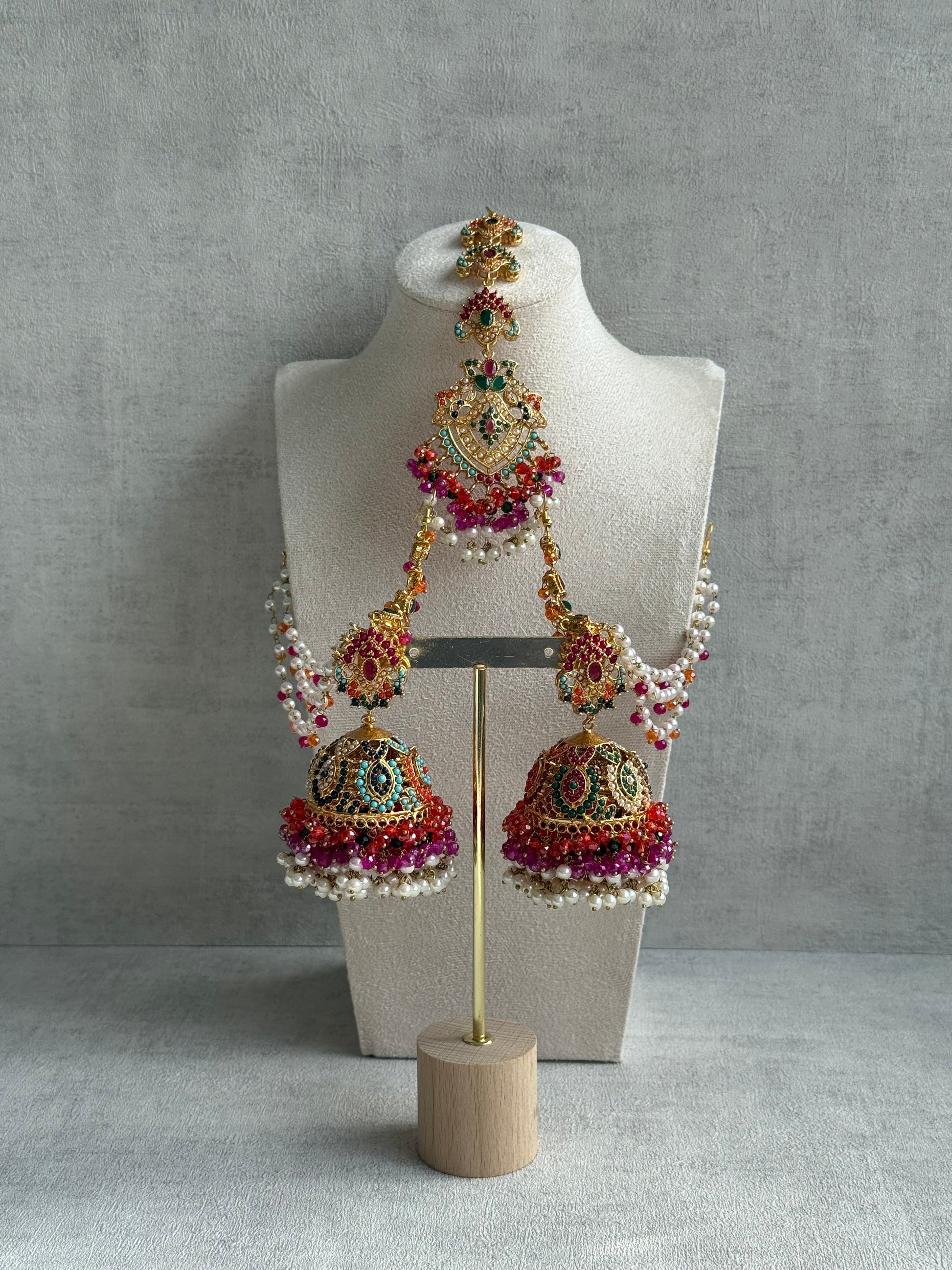 Each earring is paired with sahare (side chains) that gracefully frame the face, adorned with matching stones and pearls for a touch of regal opulence. The coordinating tikka mirrors the same ornate craftsmanship, making the entire set a striking choice for weddings, mehndi nights, or festive occasions.