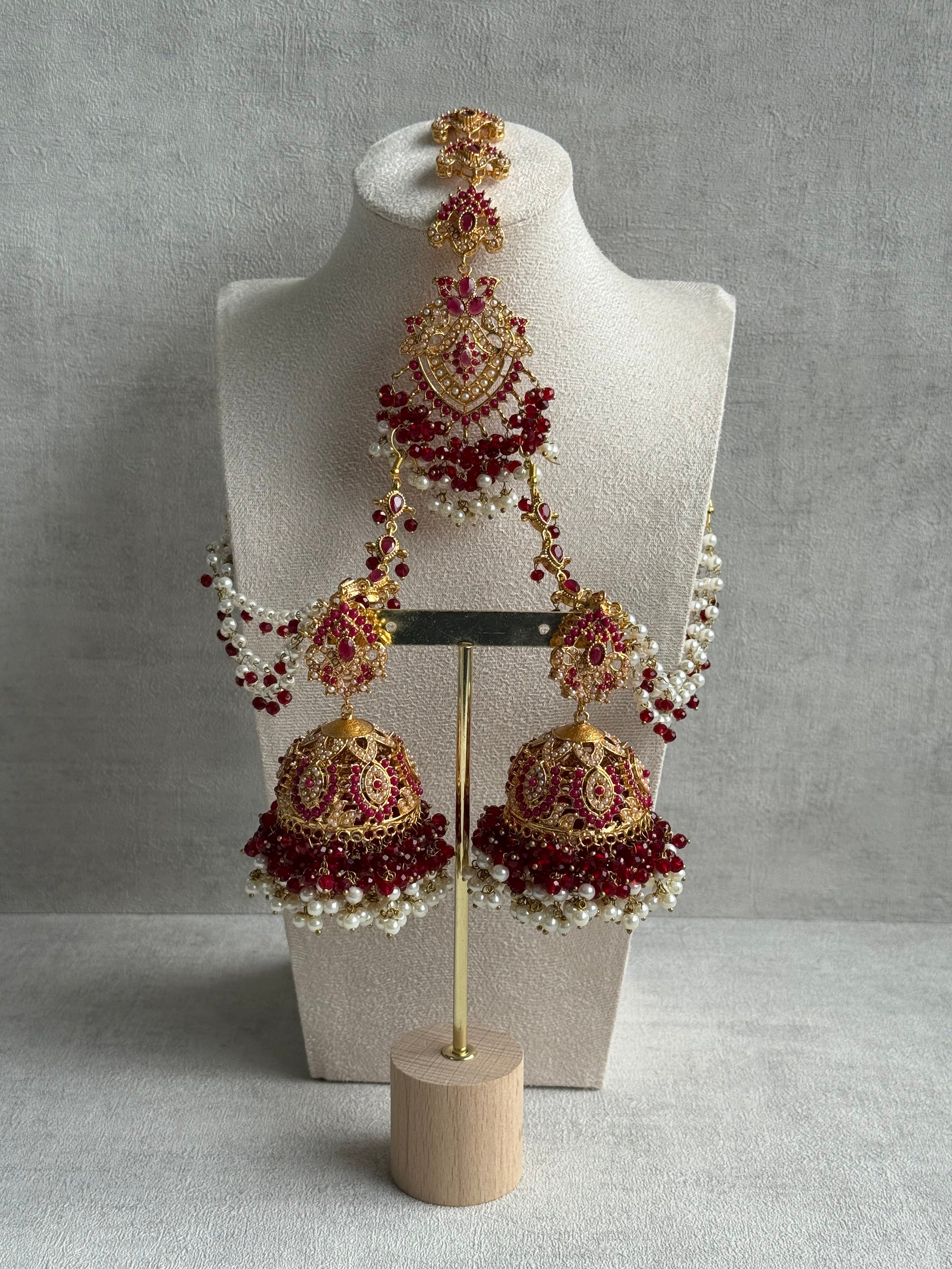 Each jhumki is encrusted with deep ruby stones and champagne-toned crystals, finished with clusters of lustrous pearls. The layered sahare chains drape gracefully along the hairline, blending opulence with elegance, while the tikka brings balance and brilliance to the ensemble.