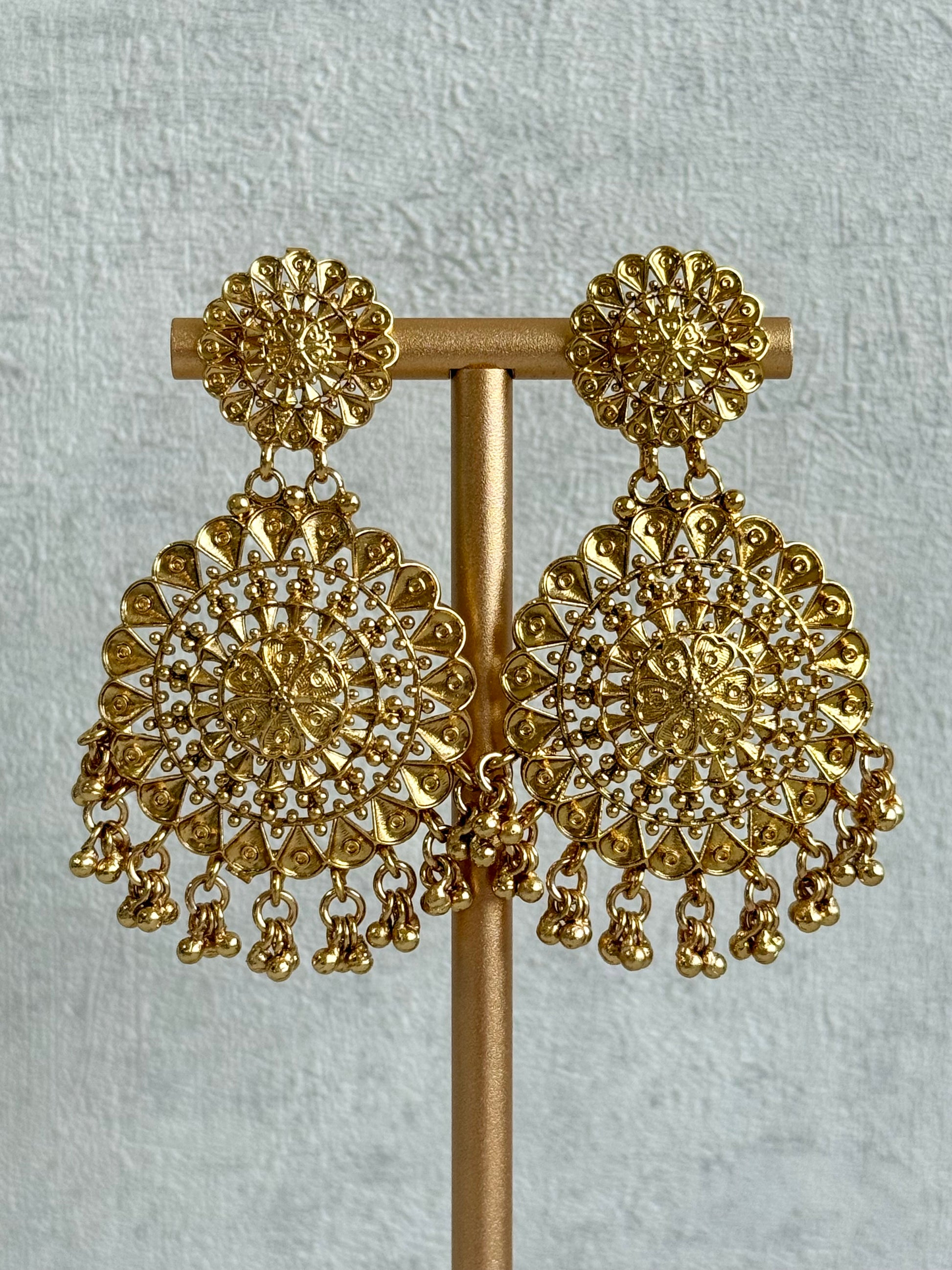 The Ayura Designs Sahiban Set captures the essence of old-world Punjabi bridal jewellery with its bold antique gold finish and ornate craftsmanship. The choker is adorned with layered chain accents and symmetrical medallions, each echoing intricate sunburst and floral motifs. A dangling central pendant adds movement and regality, drawing the eye to the neckline.