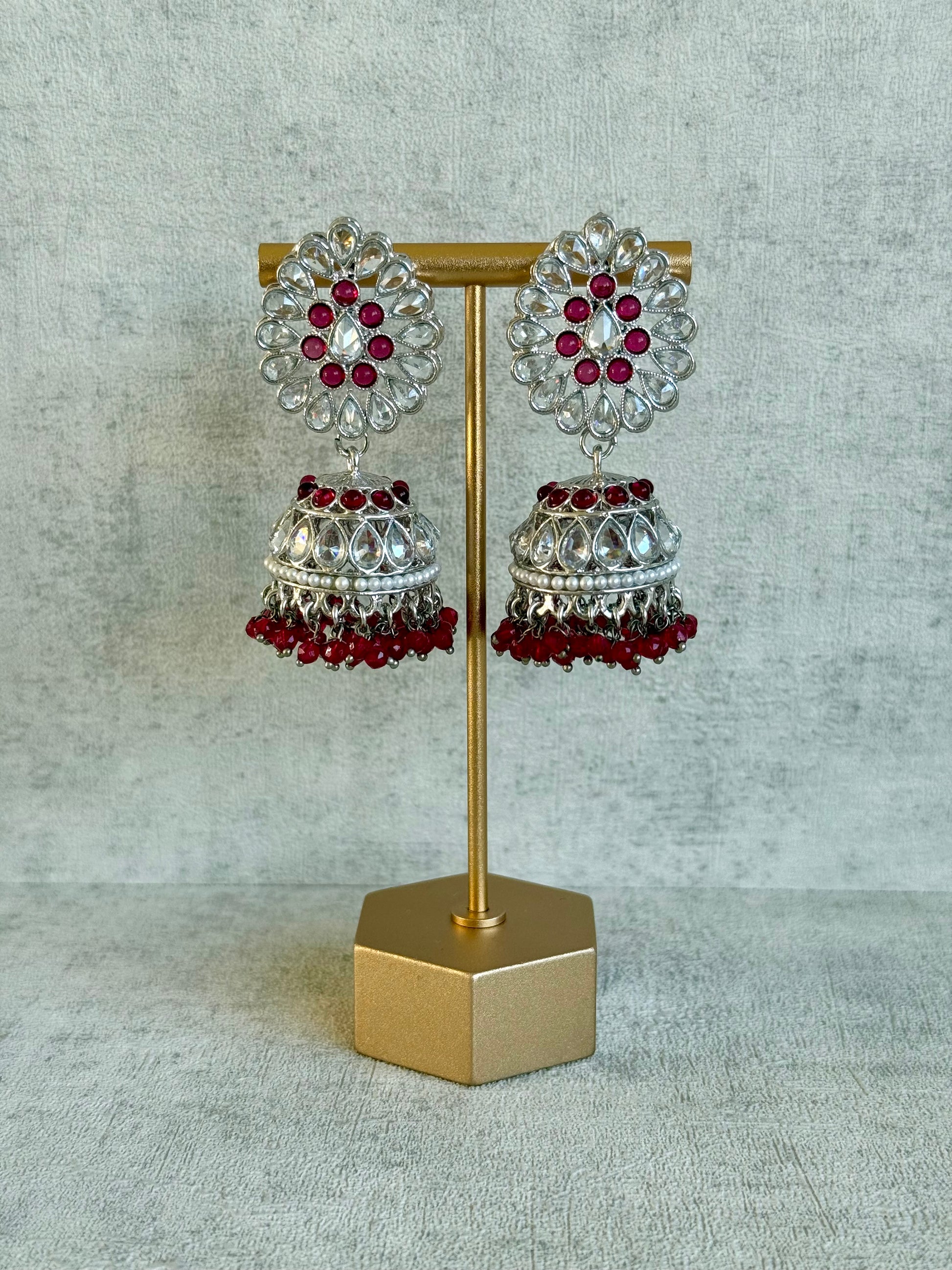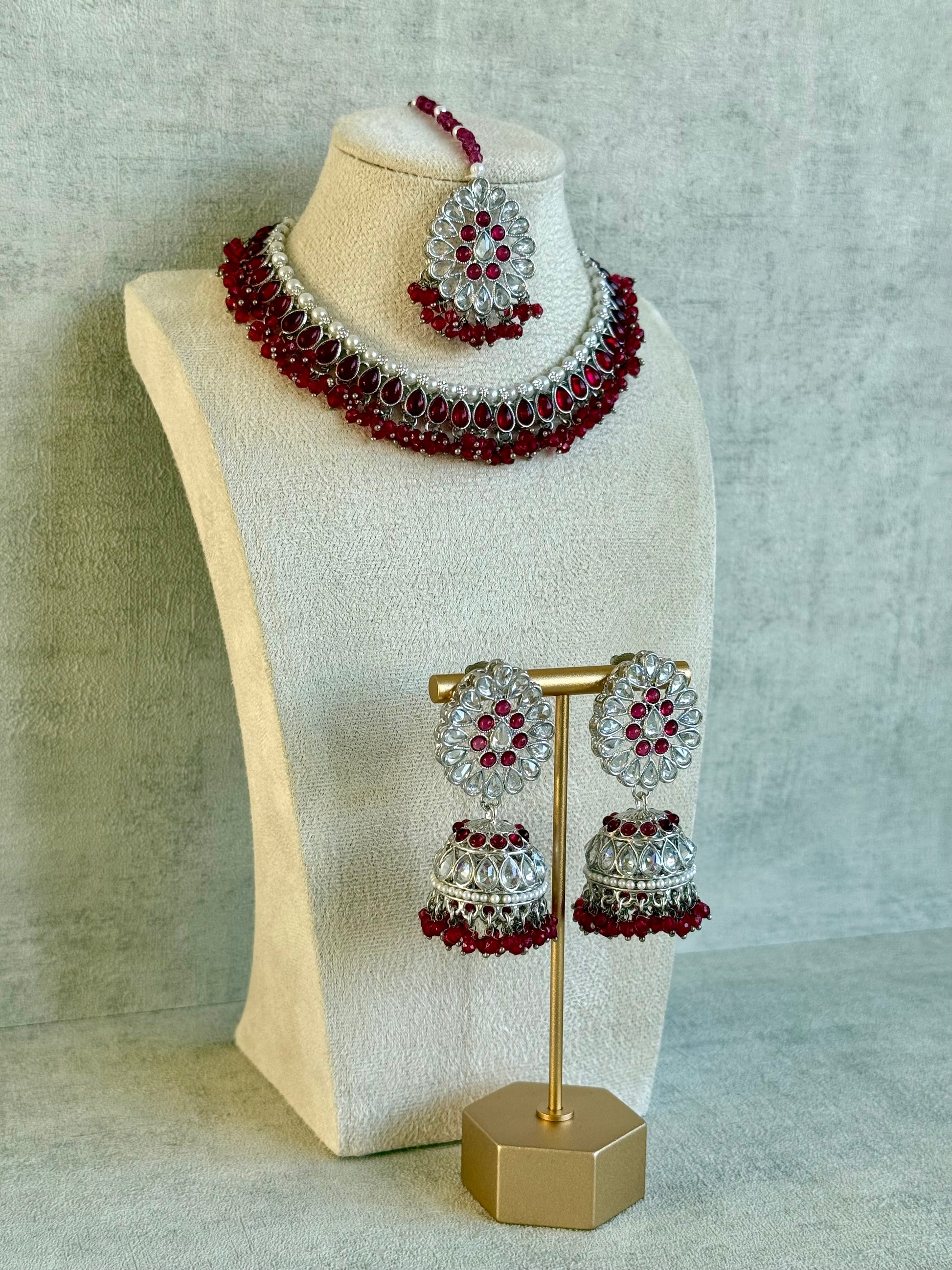 Ayura Designs Saima Set – Necklace, Jhumkis & Tikka in Deep Rose Pink with Silver Finish