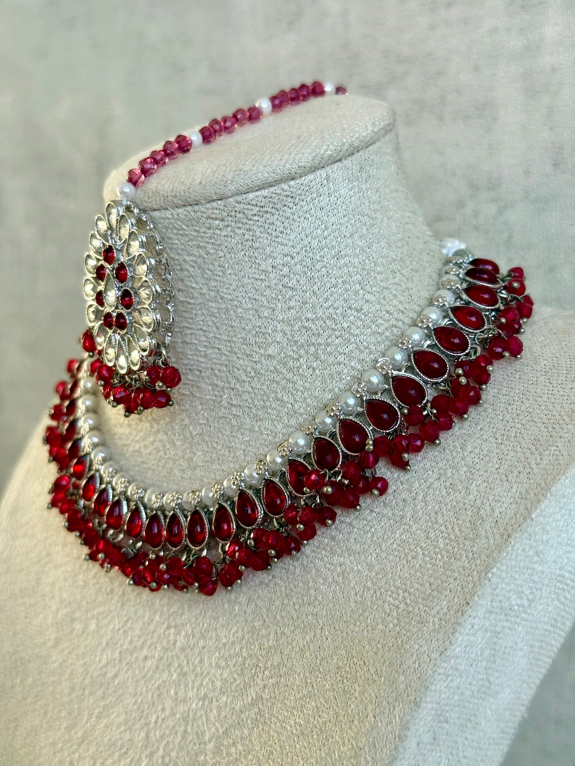 The Deep Rose Pink variation captures a graceful, regal warmth, blending soft rosy hues with a modern silver base. Each pear-cut stone sits in a kundan-style setting, framed by delicate pearls and clusters of faceted rose beads that add soft movement and colour. The accompanying tikka mirrors the same blooming motif, creating a perfectly balanced bridal or occasionwear statement.