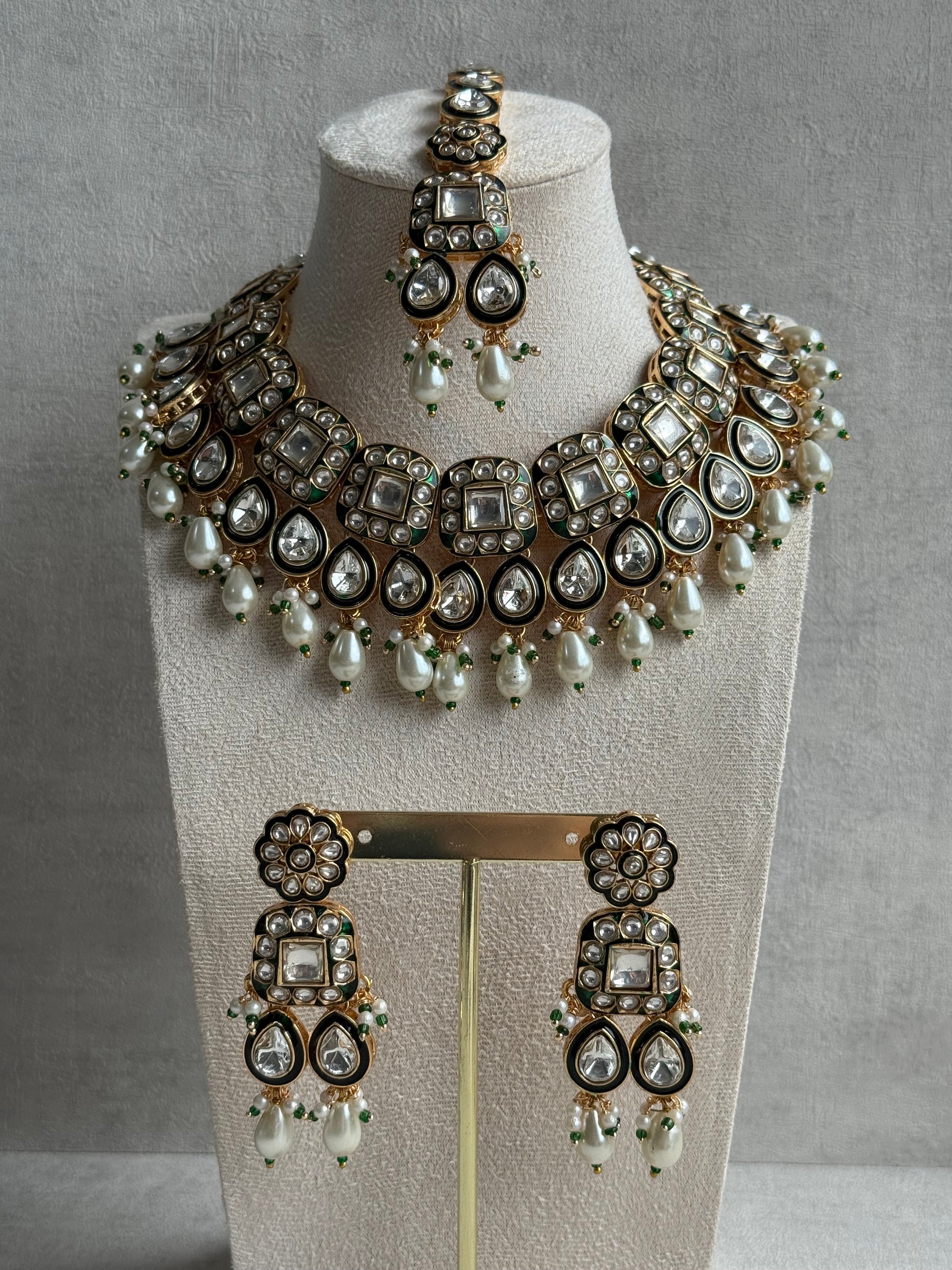 The necklace features alternating kundan motifs framed with enamel detailing and bordered by dainty pearls. Each element catches the light delicately, creating a soft luminosity that enhances both traditional and modern outfits. The green meenakari adds a subtle contrast that highlights the meticulous craftsmanship behind every detail.
