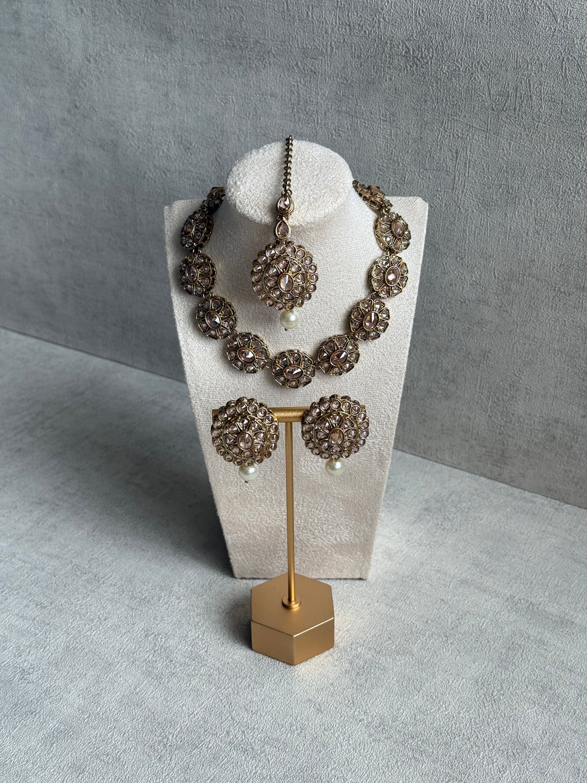 A soft shimmer, a graceful silhouette — the Ayura Designs Sania Set in Champagne is the embodiment of timeless elegance. Featuring a round floral necklace, coordinating earrings, and matching tikka, this set is crafted with glistening champagne-toned kundan stones that reflect the light with every movement. The antique gold finish adds warmth and regal depth, making it an exquisite pairing for neutral, gold, or pastel outfits.