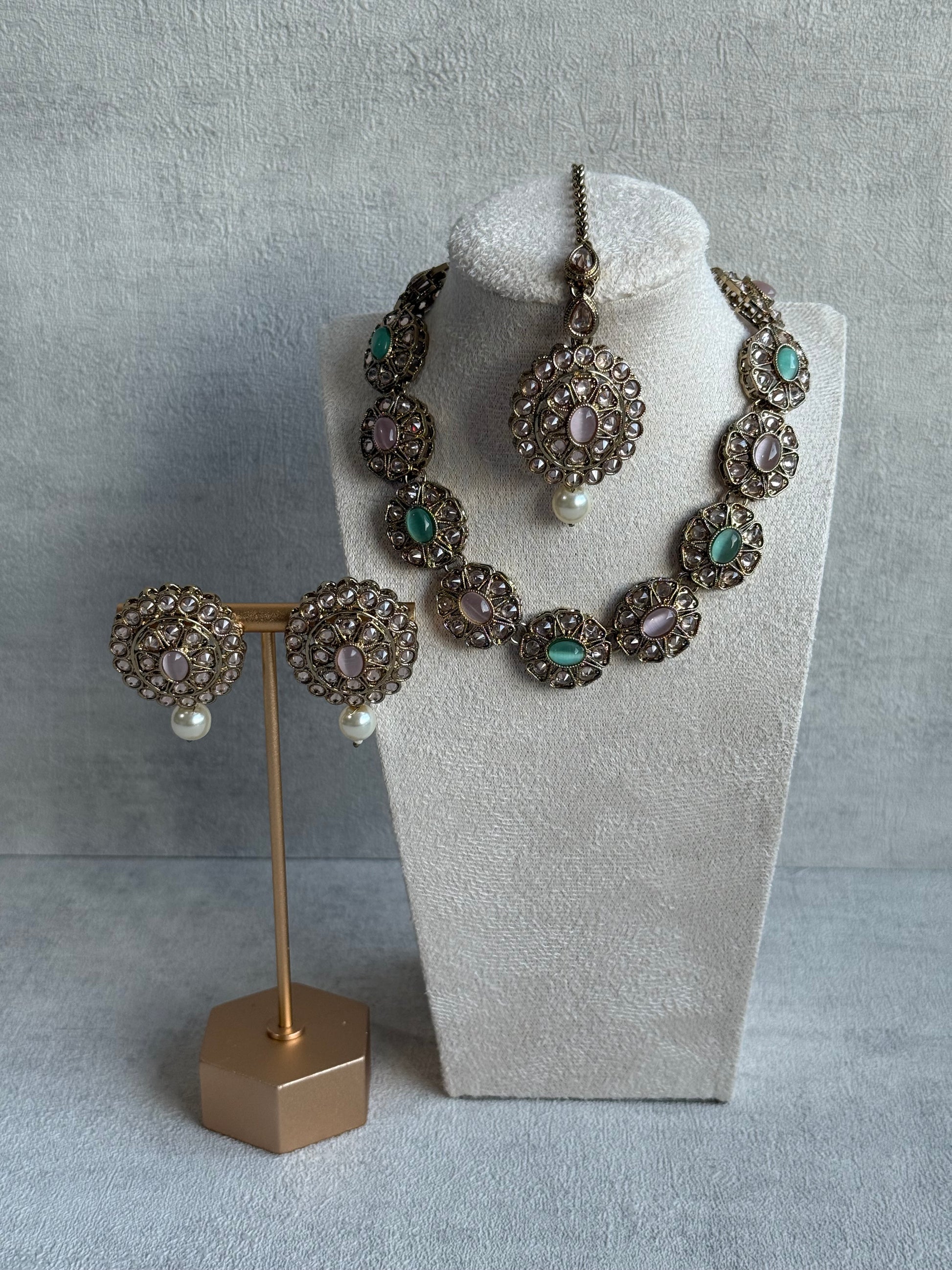 Soft, delicate, and unmistakably romantic — the Ayura Designs Sania Set in Mint & Blush is a dreamy blend of pastel charm and timeless design. This three-piece set includes a statement necklace, coordinating earrings, and a matching tikka, all crafted in an antique gold finish with kundan detailing and oval-shaped stones in alternating mint green and blush pink tones.
