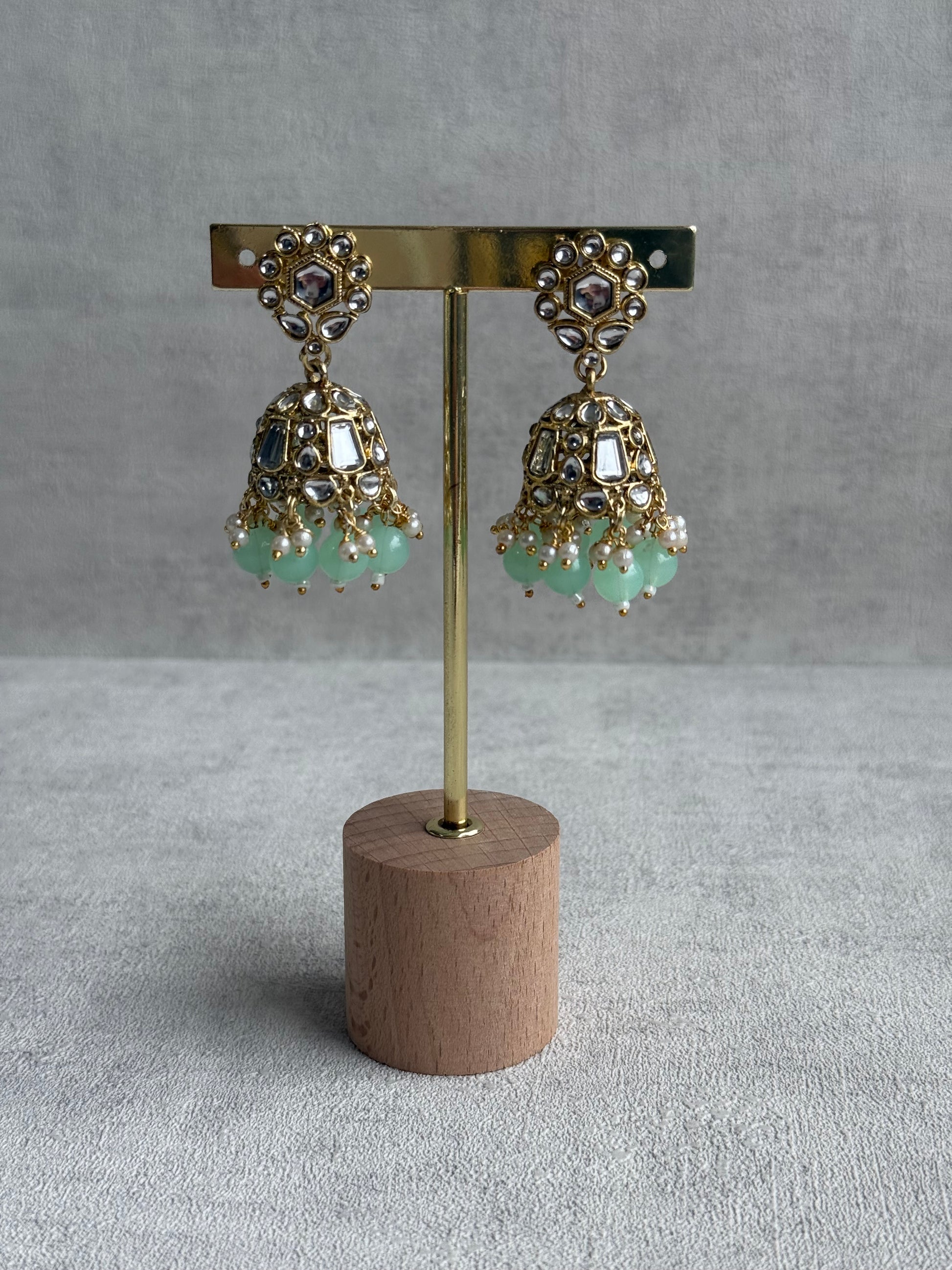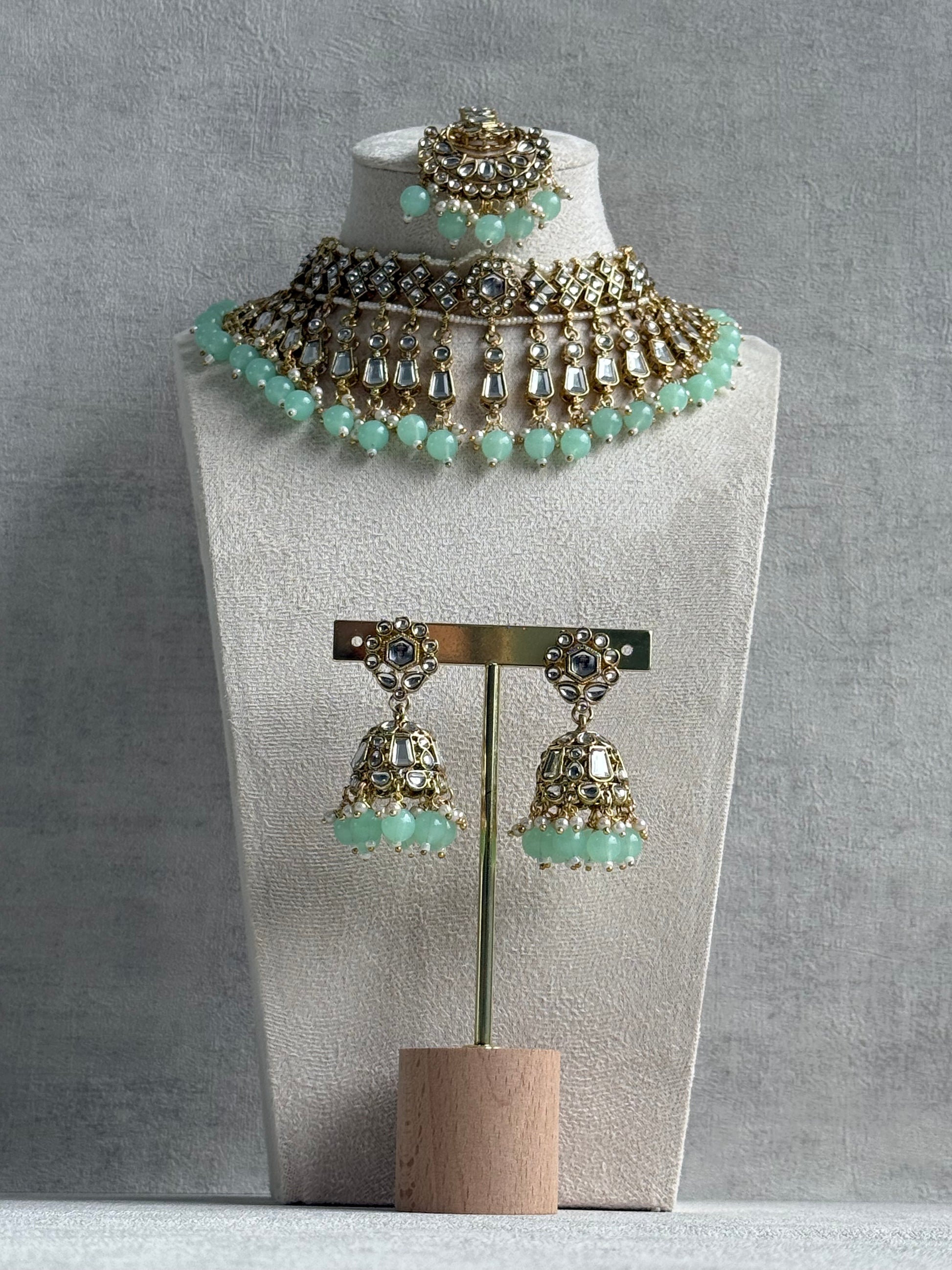 Complementing the necklace are the statement jhumkis — adorned with matching mirror-cut detailing, pearl accents, and pistachio-green bead drops that sway delicately with every movement. The coordinating tikka mirrors the same intricate design, adding a touch of harmony and grace to the full set.