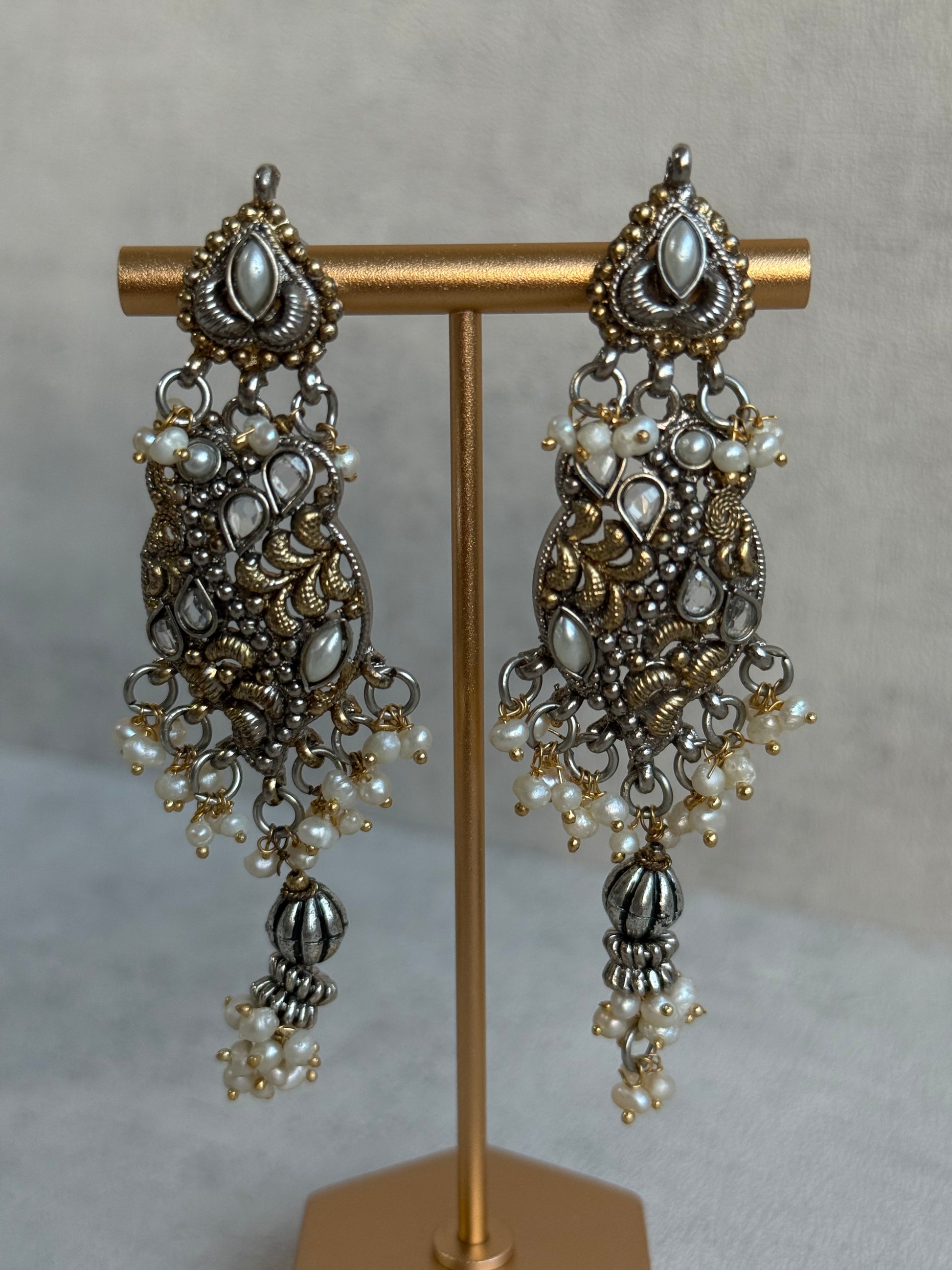 At the heart of the Sheeba Set is its sculptural pendant — a leaf-inspired motif that symbolises grace, growth, and individuality. Layers of oxidised silver detailing are intertwined with antique gold threads, creating a rich tapestry of textures and tones. Mirror-cut stones shimmer throughout the surface, framed by tiny gold beads and accented with lustrous pearl hangings. The unique interplay of metallic tones gives the piece an antique yet avant-garde feel — ideal for both traditional and fusion styling.