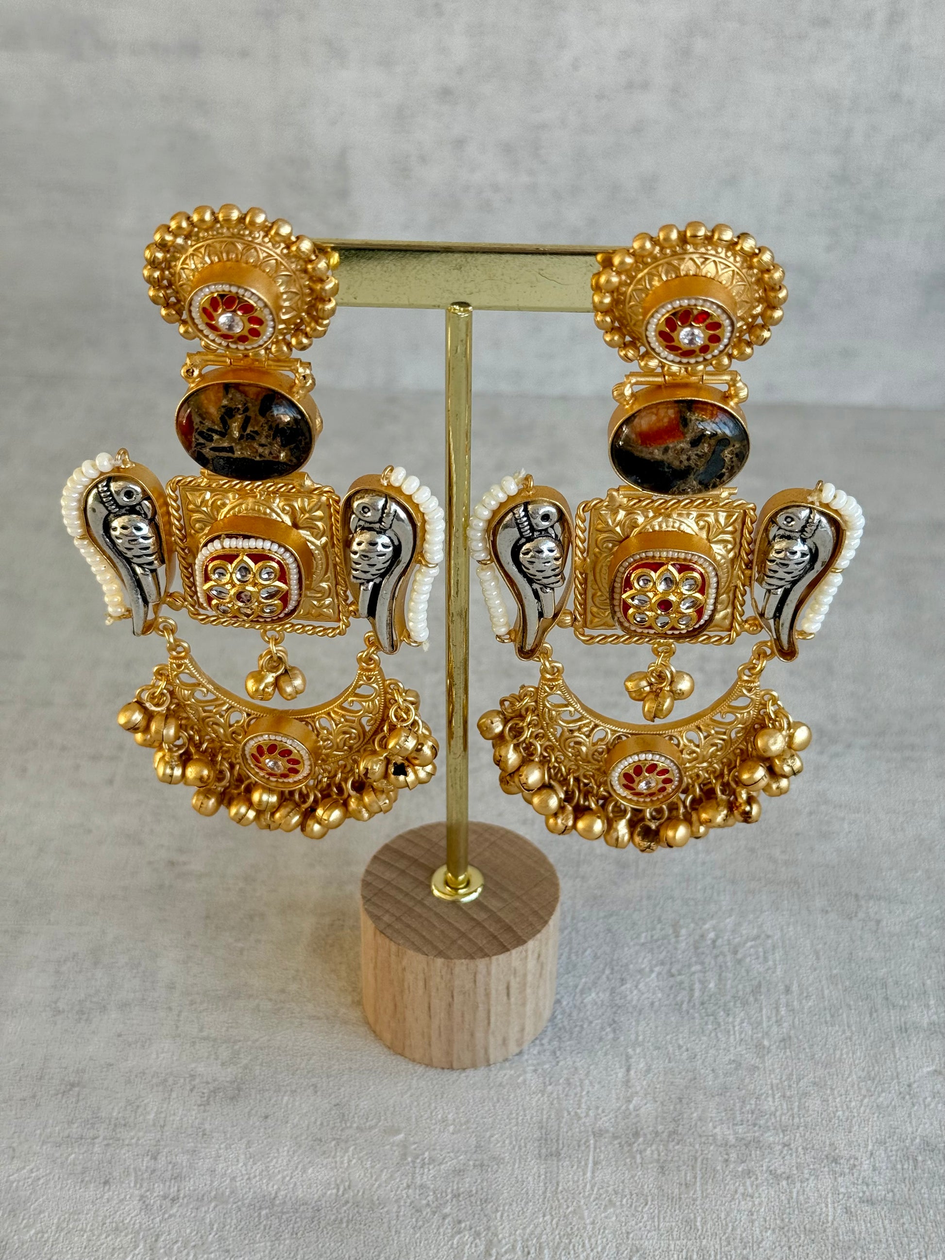 Ayura Designs Soha Earrings – Antique Gold with Smoky Amber Stone & Oxidised Parrots