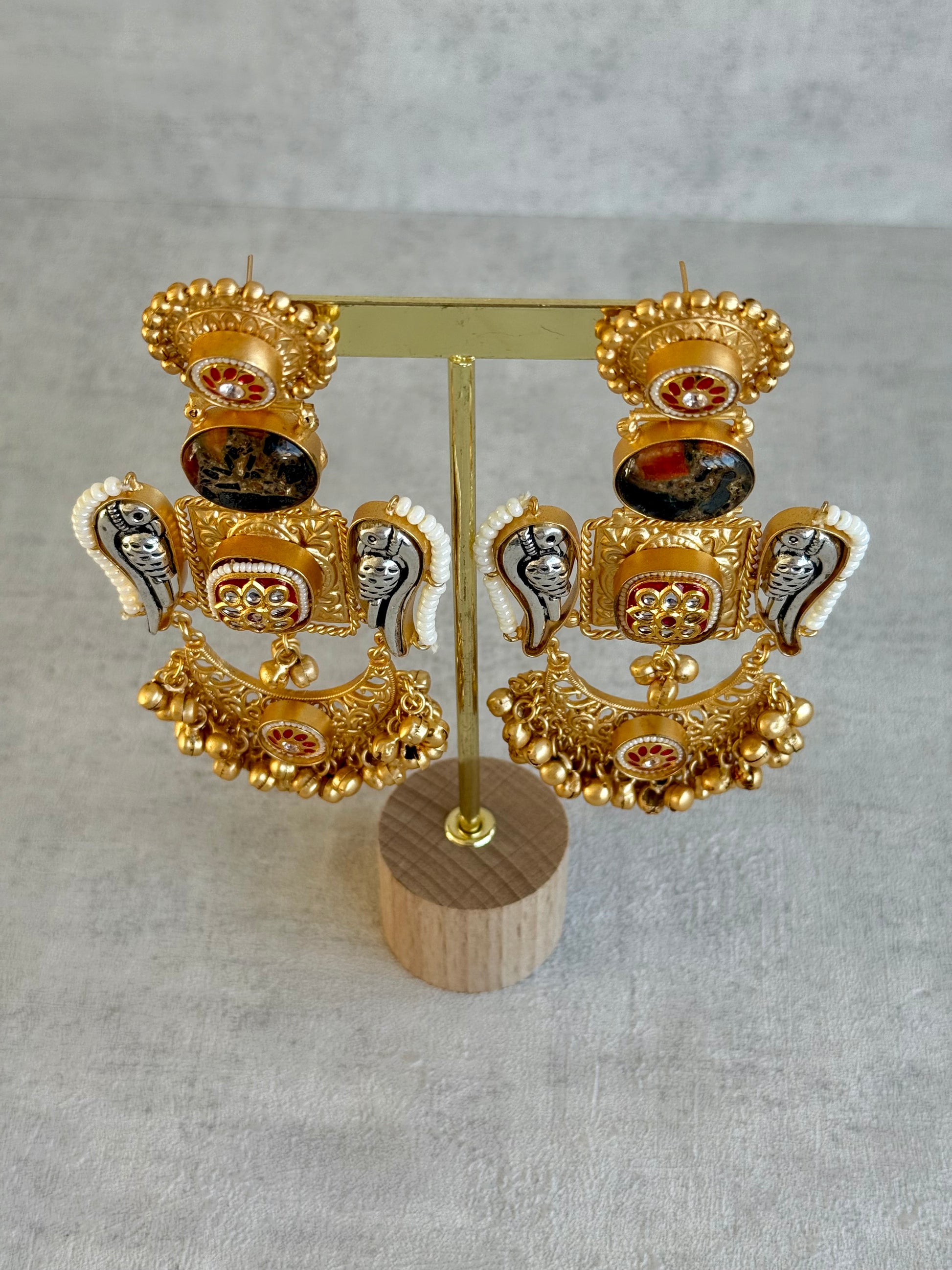 Golden ghungroos drape gracefully below the crescent, bringing movement and a traditional jhumki-inspired feel. Pearl-lined parrots add texture, contrast, and a hand-crafted finish to the design.