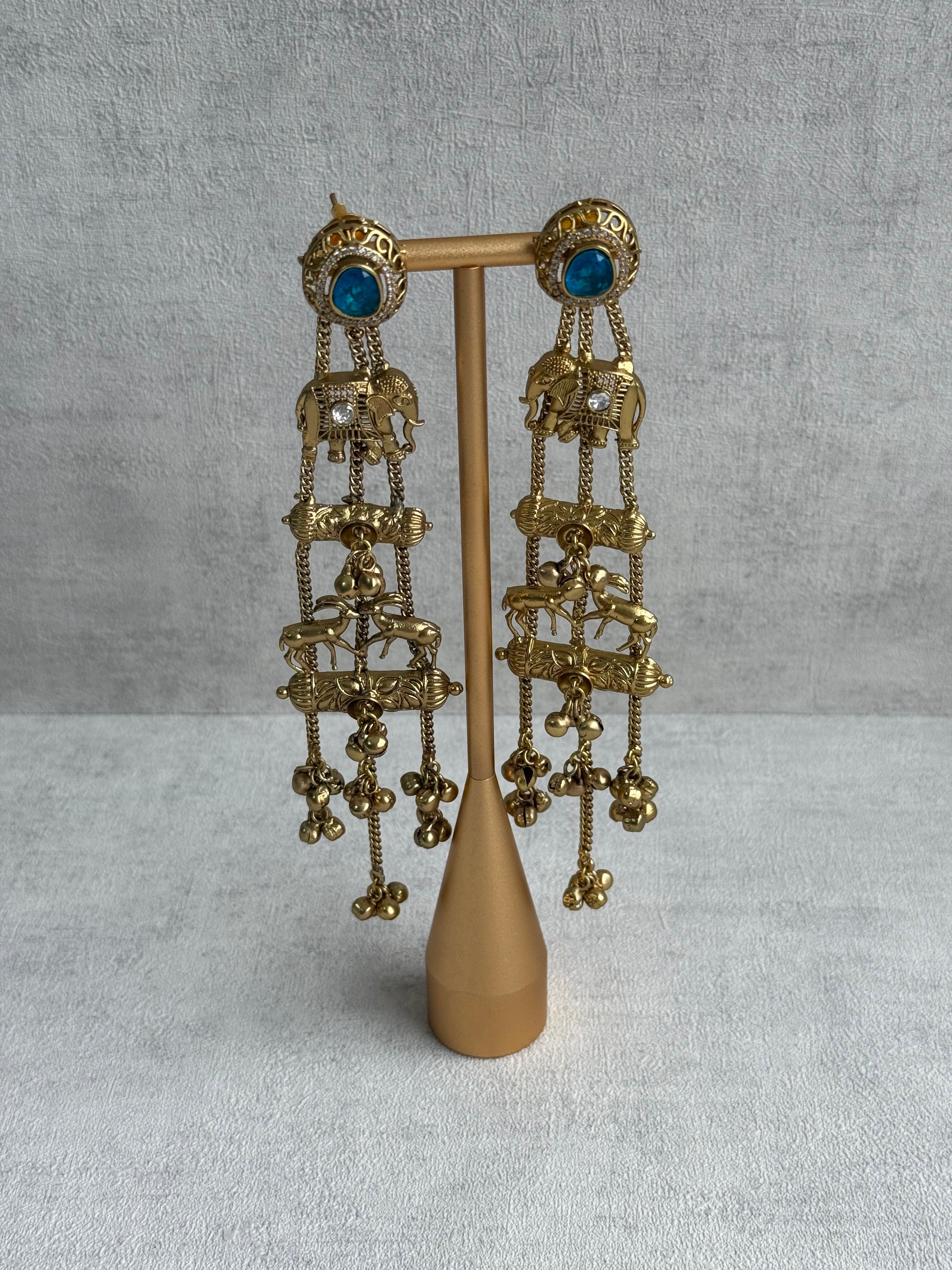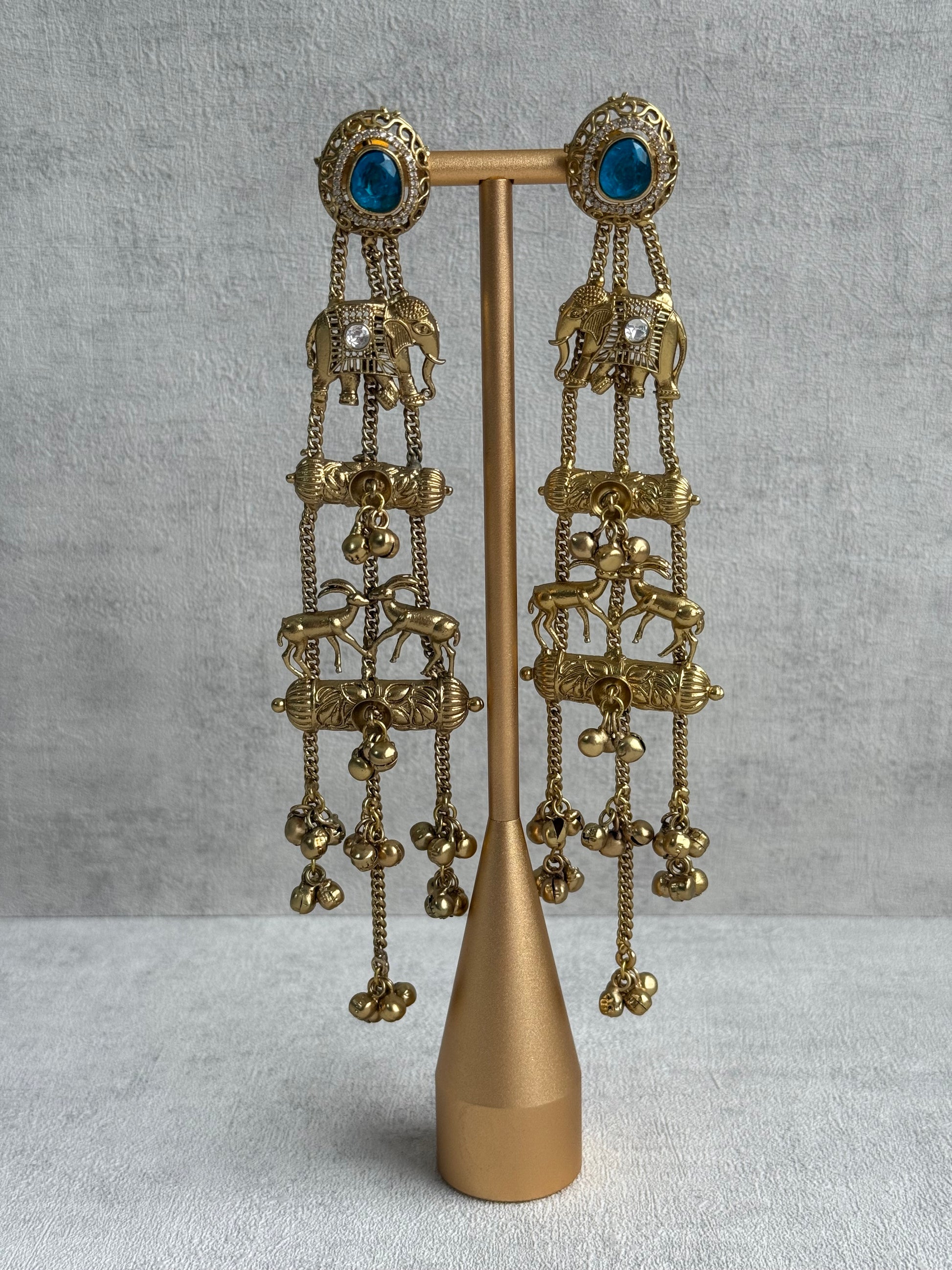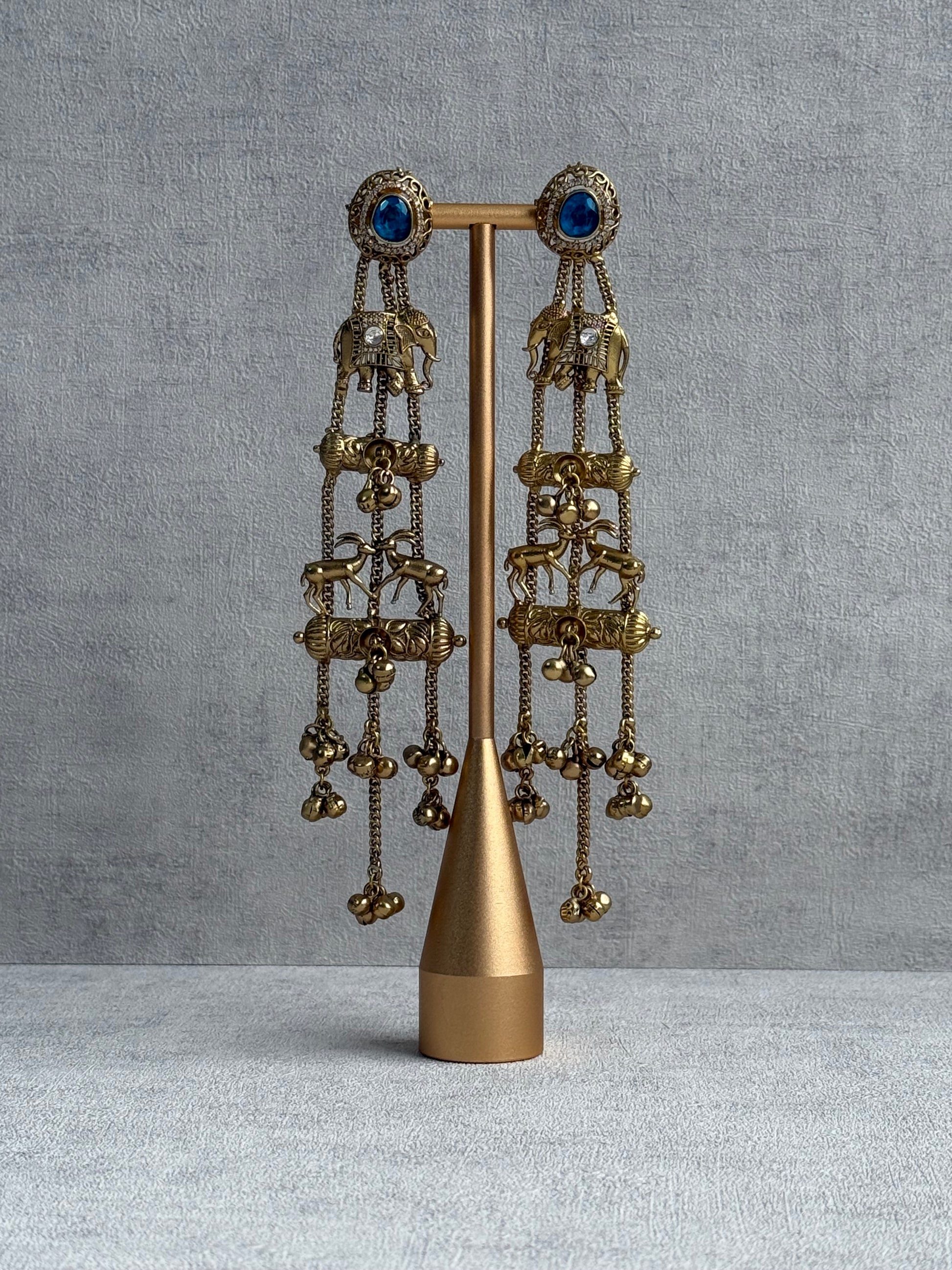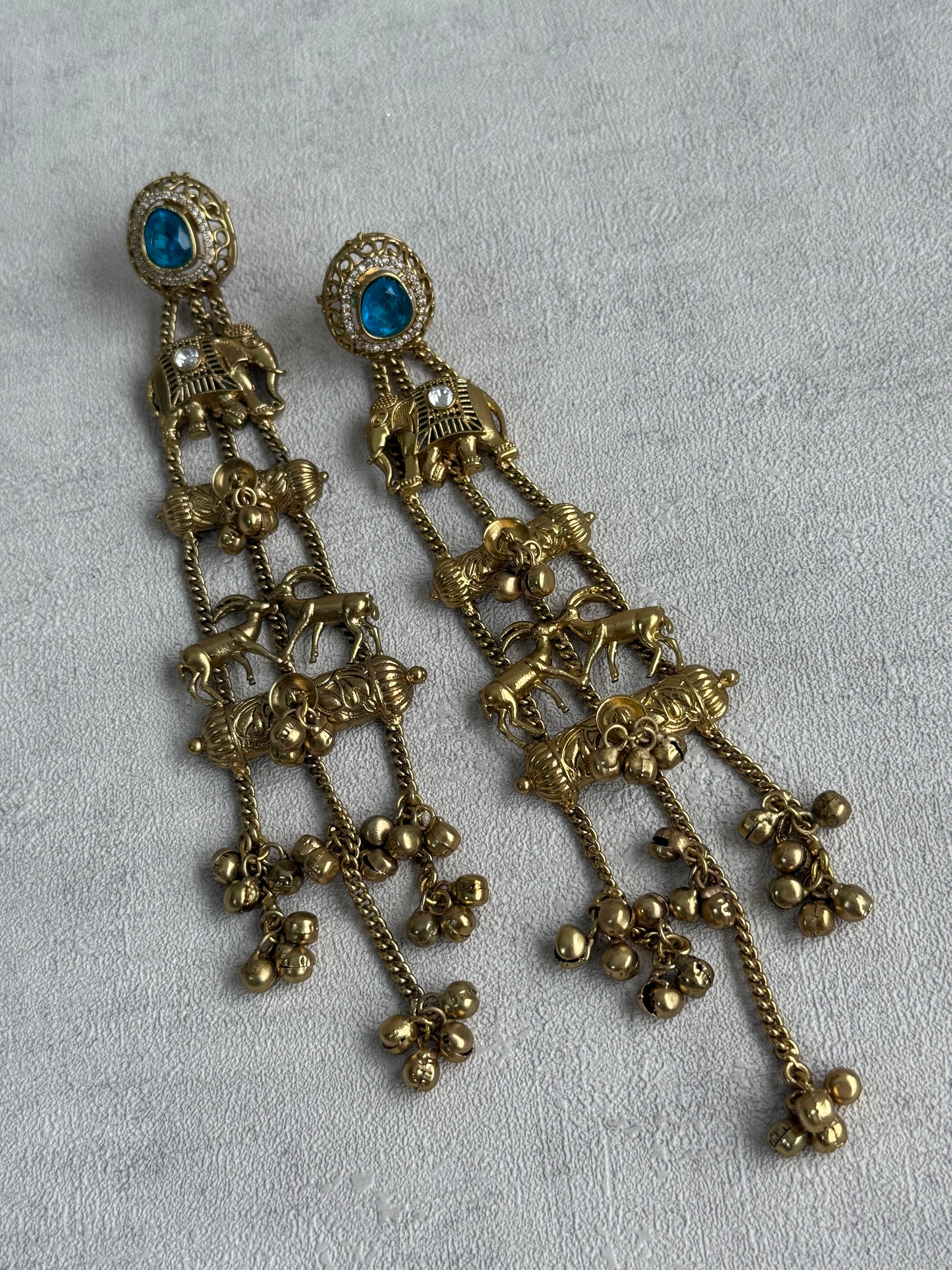 Ayura Designs Sonal Earrings – Antique Gold Dangler Earrings with Elephant & Deer Motifs, Blue Stone Tops & Ghungroo Detailing