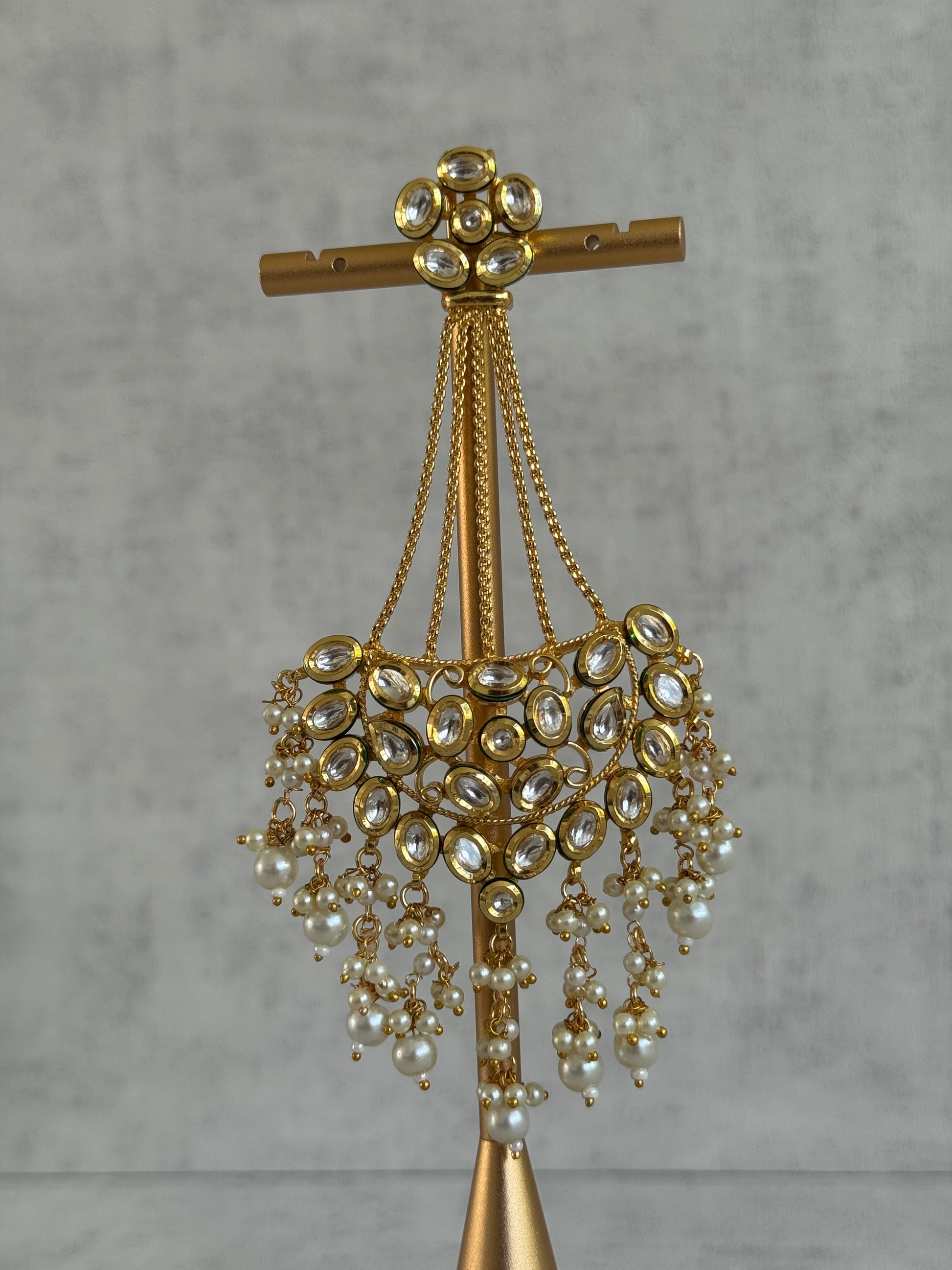 The arrangement of tear-shaped and oval-cut Kundan pieces is framed by clusters of pearl droplets that add fluidity and elegance to every movement. Hand-strung pearl bunches sway from the base, catching the light and creating a mesmerising effect, perfect for bridal portraits and ceremonial entrances alike.