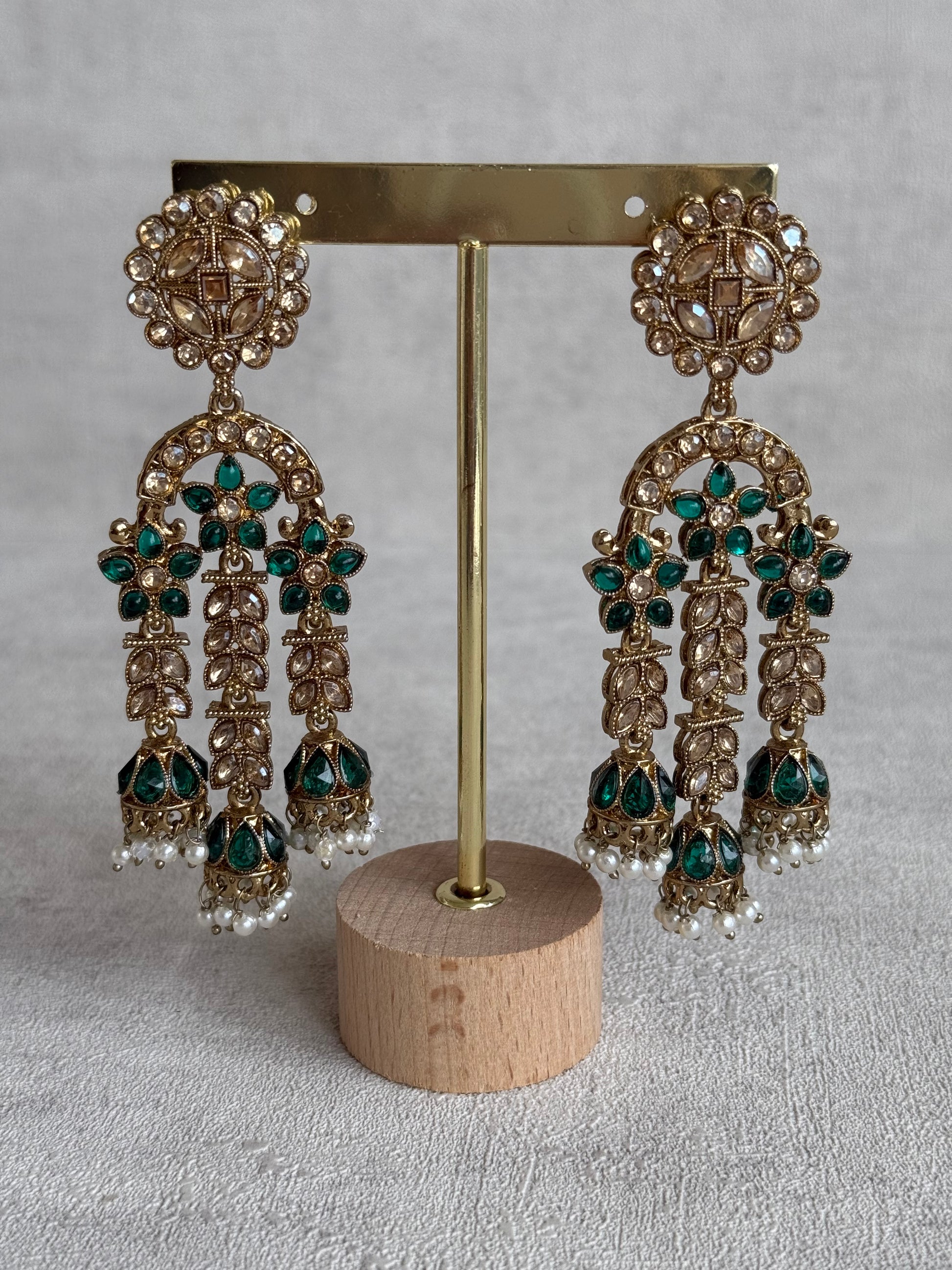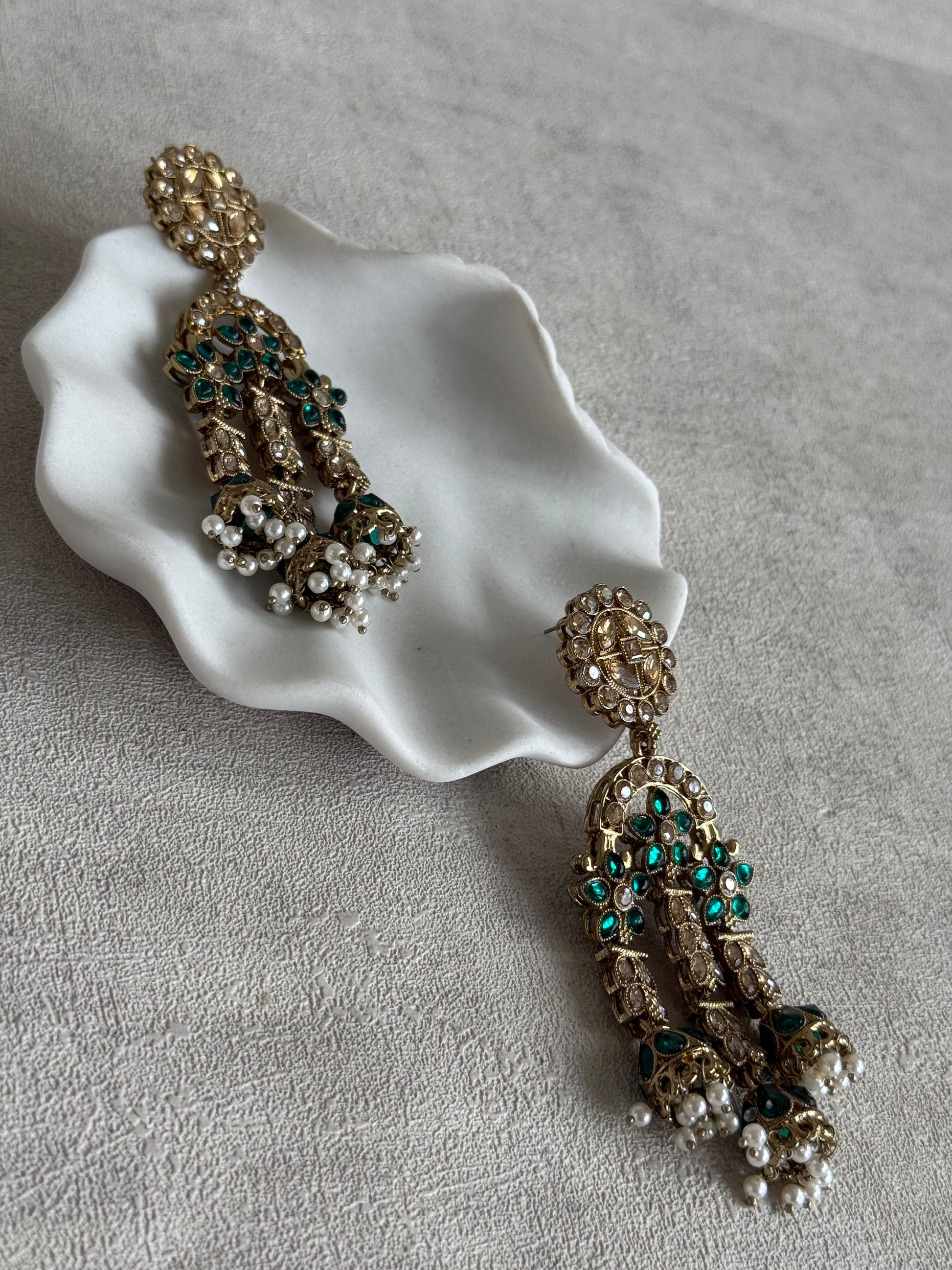 Each earring showcases a floral arrangement that flows into detailed leaf motifs and dome jhumkis edged with tiny pearls. The green tones bring depth and sophistication, offering a timeless look that pairs beautifully with both gold and pastel ensembles.