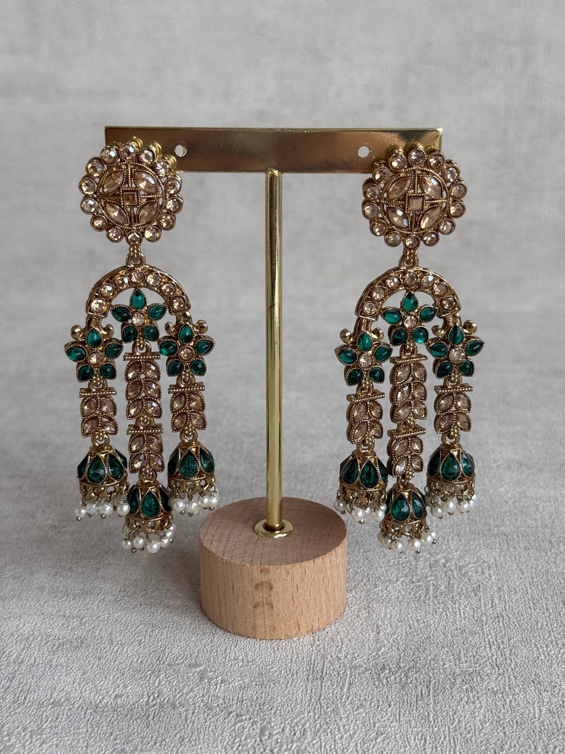 The Ayura Designs Soraya Earrings in emerald green embody regal elegance and traditional artistry. Featuring deep green meenakari stones framed by shimmering champagne crystals, these earrings exude luxury and grace. The gold finish adds warmth and richness, creating the perfect statement for festive and wedding occasions.