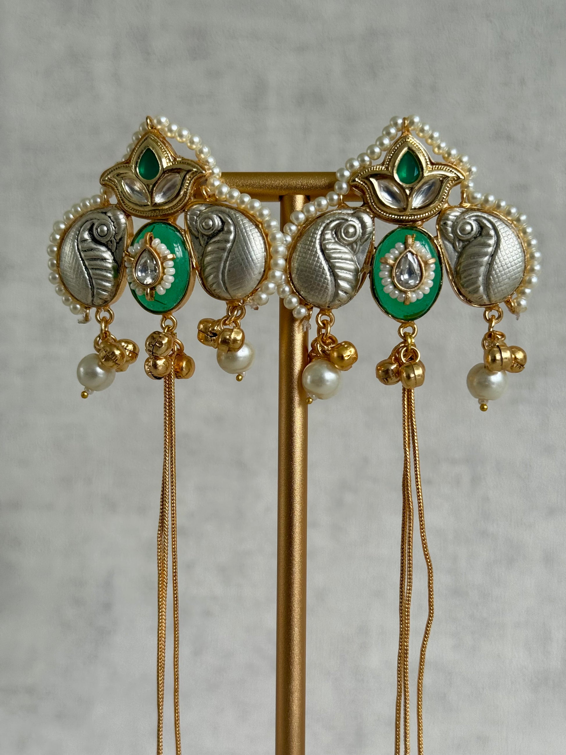 Crafted with precision, each earring features a floral-inspired enamel top, leading into a series of detailed segments that echo the cascading rhythm of traditional Kashmiri ornaments. The pistachio green hue is both serene and contemporary, while the ruby detailing adds richness and depth, balancing softness with drama. The harmonious use of colour makes these earrings easy to pair with everything from pastel ensembles to deeper jewel-toned outfits.