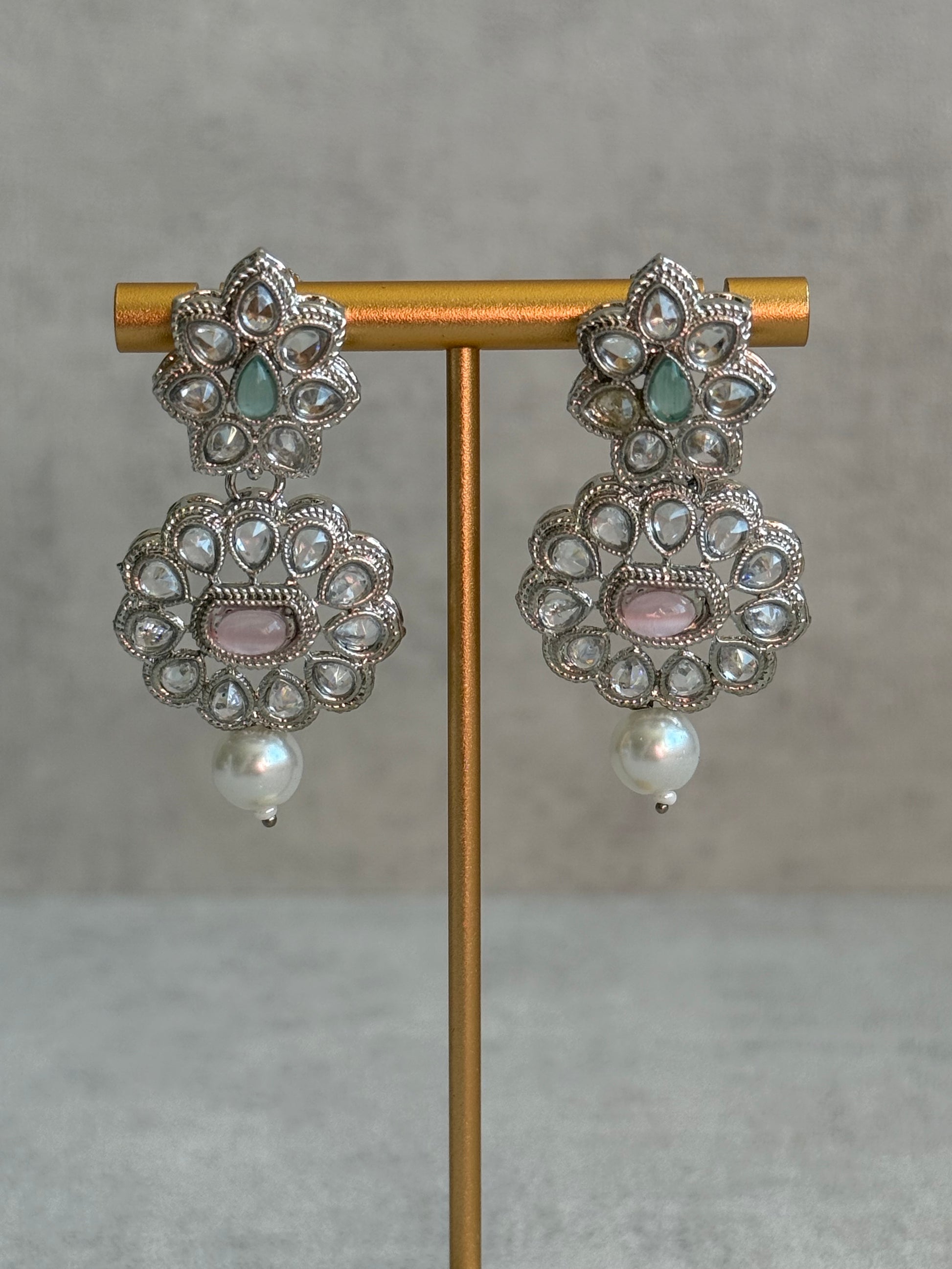 The Ayura Designs Sumbul Set in Mint & Blush is a refreshing take on traditional jewellery — designed for the dreamers, the romantics, and the ones who love colour with a touch of grace. This silver-toned set features a beautiful interplay of pastel mint green and blush pink stones, all framed by mirror-cut detailing that catches the light with every movement. Finished with soft pearl drops, it’s a delicate balance of whimsy and elegance.