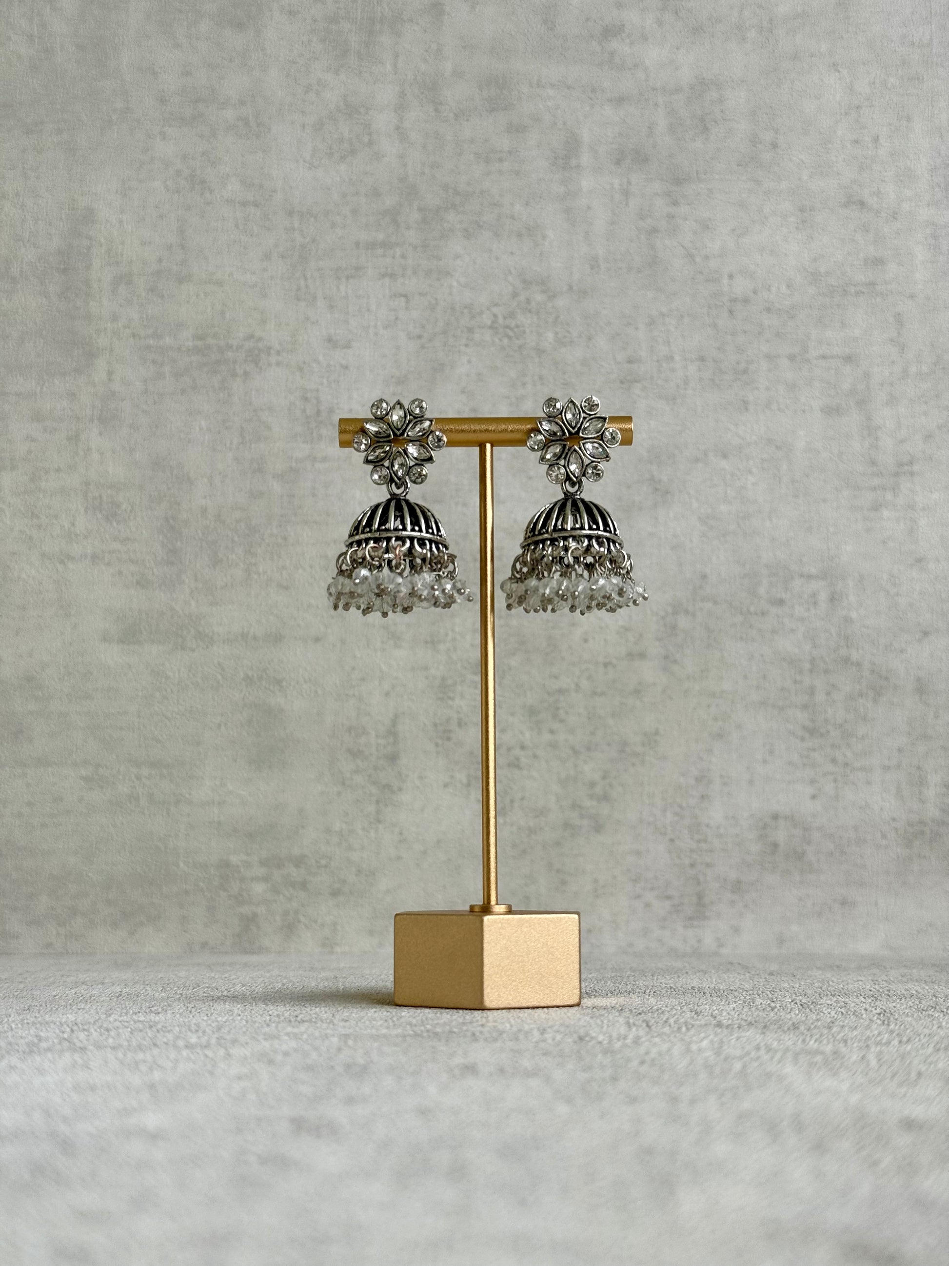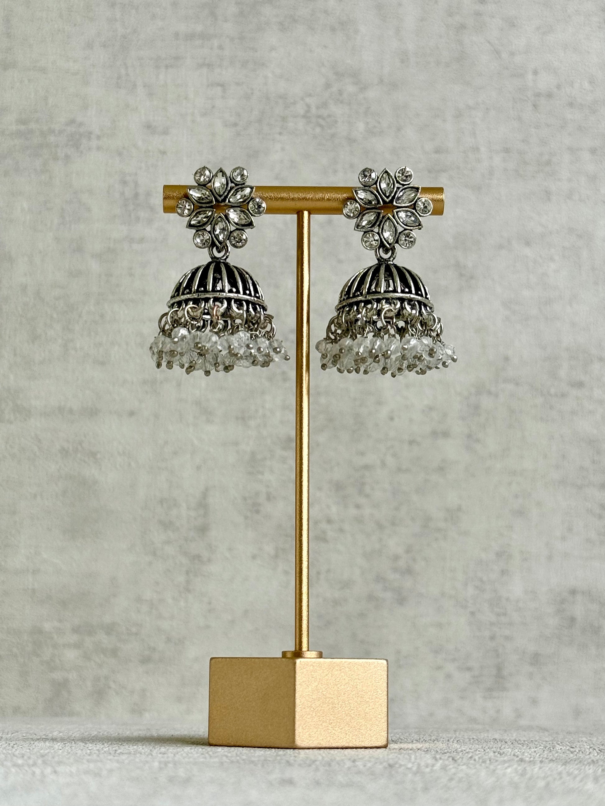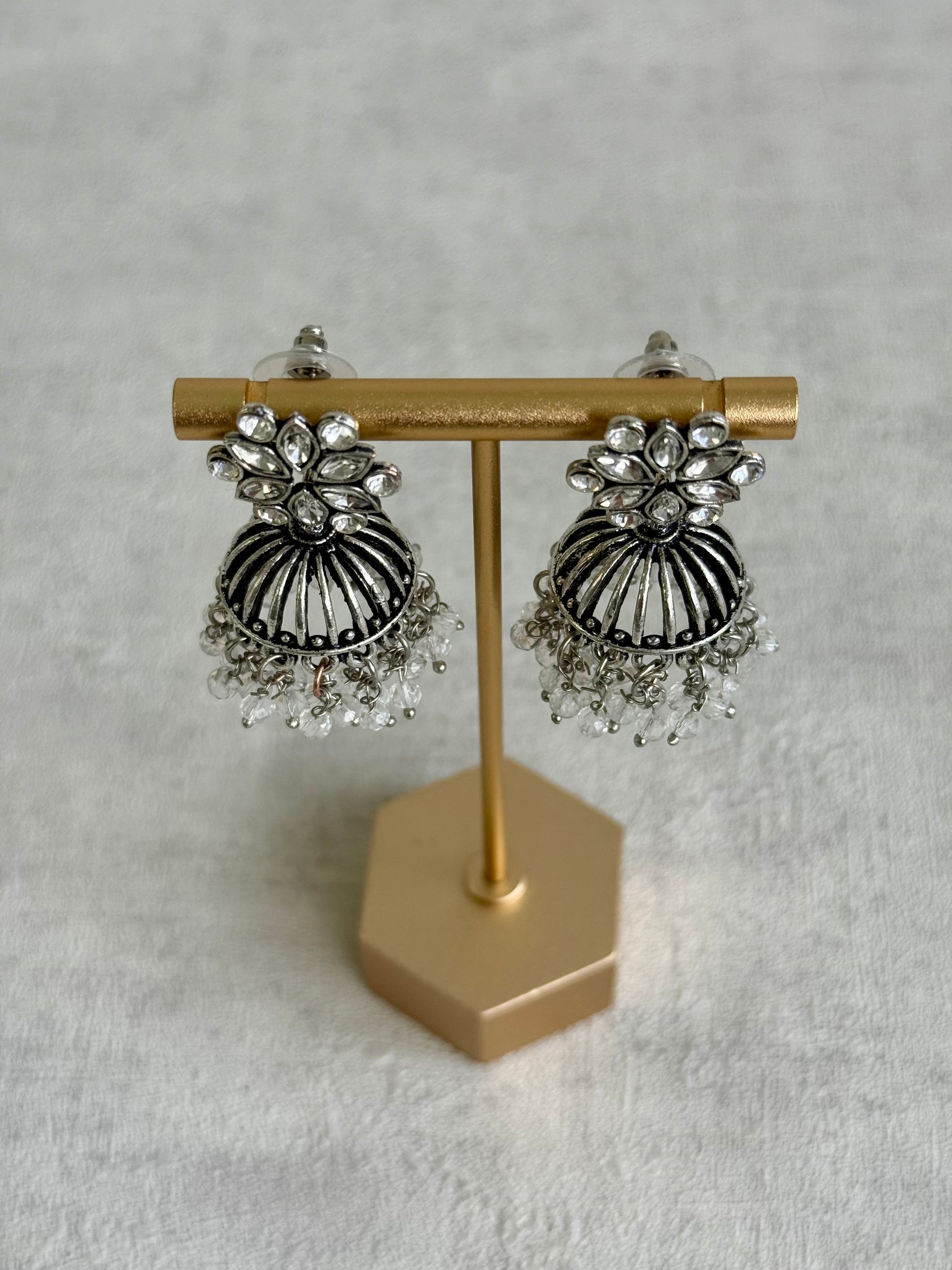 The Ayura Designs Syra Jhumkis are a timeless statement design, blending intricate oxidised silver detailing with sparkling mirror-cut stone floral tops. The structured dome silhouette is finished with cascading crystal drops, creating a look that feels both traditional and striking.