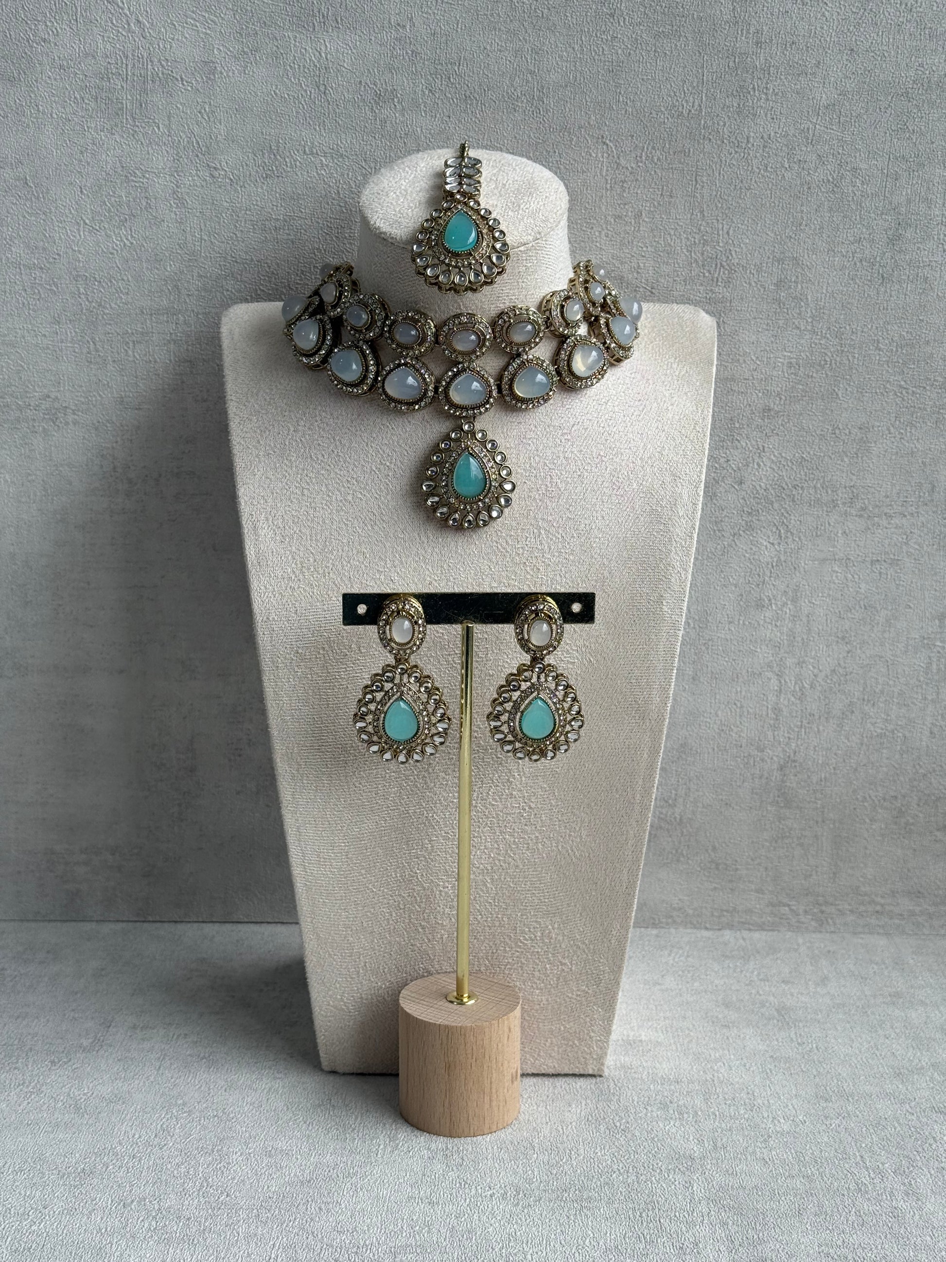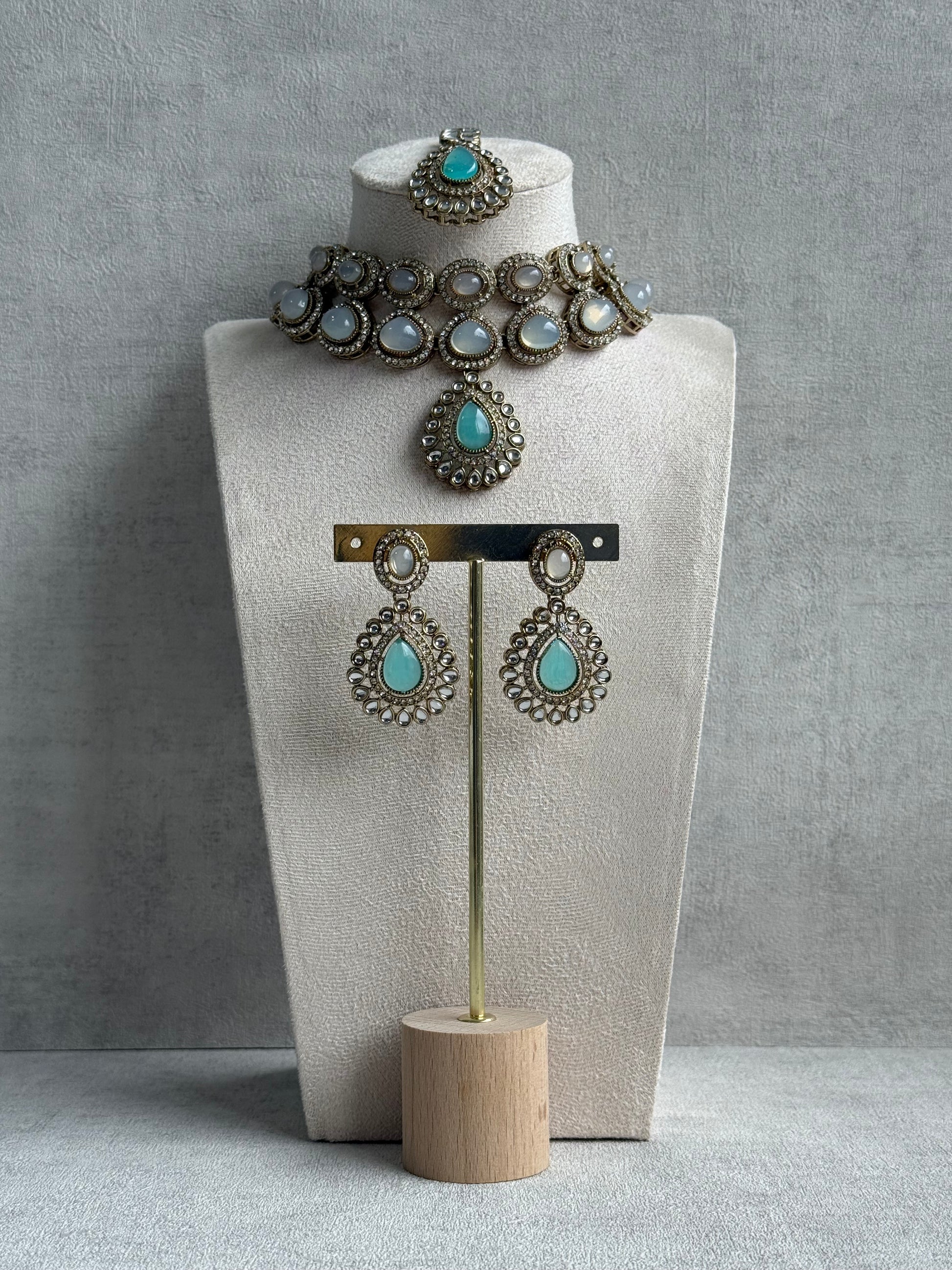 The Ayura Designs Tamara Set with Necklace, Earrings & Tikka – Aqua & Opal Stones with Kundan Detailing in Antique Gold Finish is a picture of ethereal sophistication. The choker features a breathtaking interplay of milky opal stones and aqua-blue teardrop centres, exuding a cool, serene glow that feels both regal and refreshing.