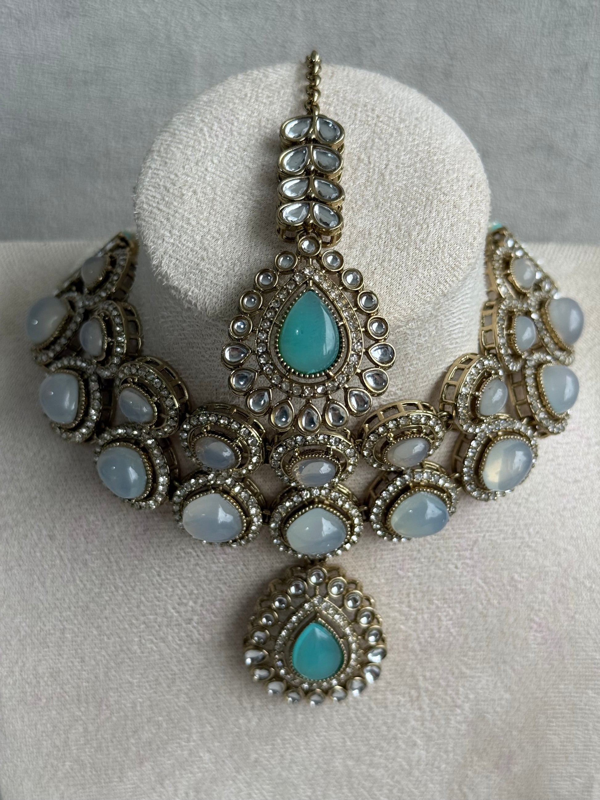 Each stone is bordered with kundan and fine crystal detailing, set against a textured antique gold base that adds depth and character to the design. The harmonious pairing of soft white opal tones with tranquil aqua creates a refined pastel balance that flatters every complexion and outfit palette.