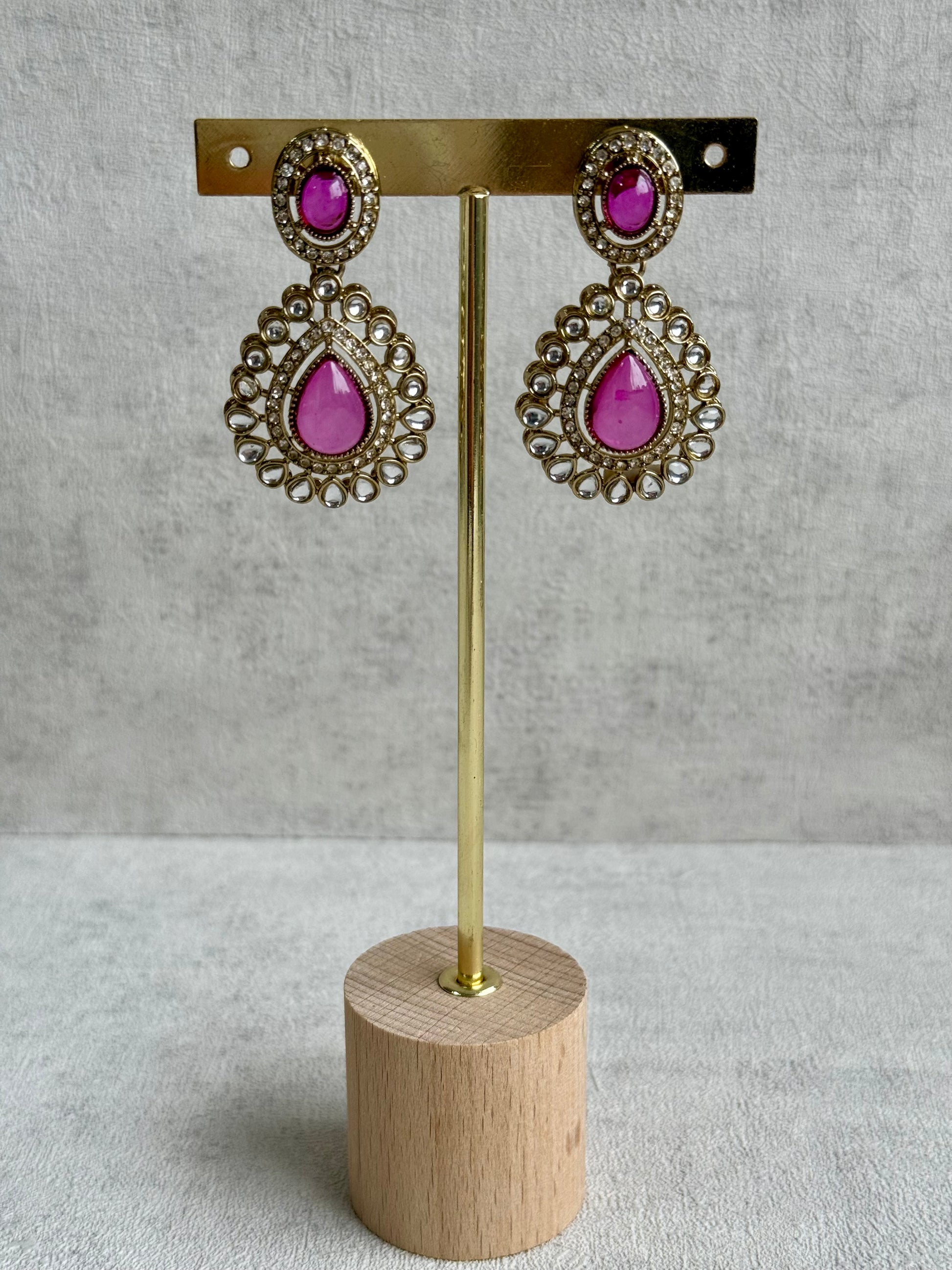 Complementing the choker, the matching earrings mirror the same craftsmanship — featuring pear-shaped fuchsia stones bordered with kundan and mini crystal frames. Their elegant drop silhouette pairs effortlessly with the statement tikka, which completes the look with timeless poise.