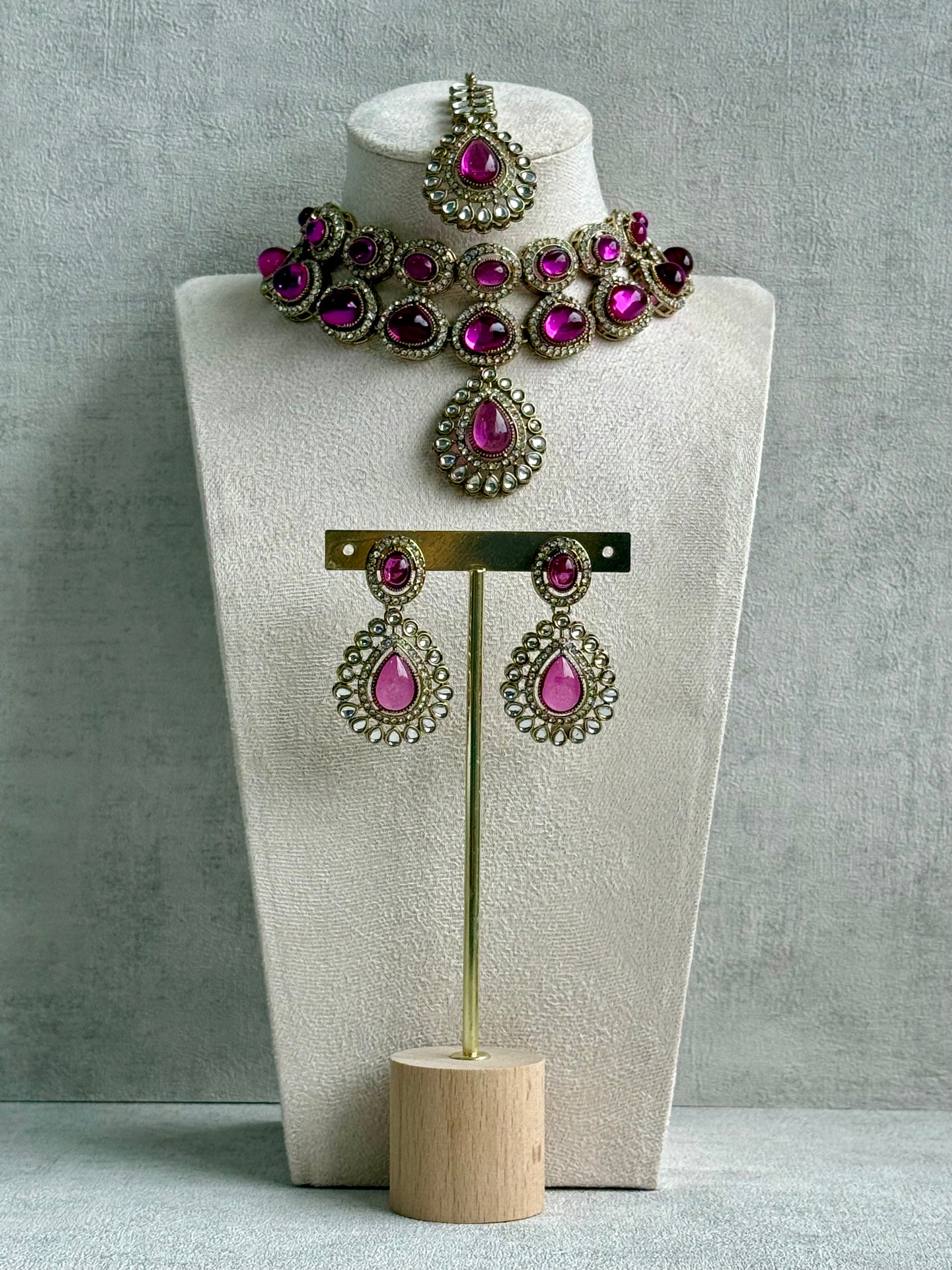 The Tamara choker is bold yet balanced, featuring a symmetrical arrangement of deep fuchsia cabochon stones that exude luxurious warmth. The antique gold base adds depth to the design, enhancing the vivid pink tones while maintaining a traditional charm. Perfect for festive celebrations or bridal events, this set captures the essence of grandeur in a wearable, statement form.